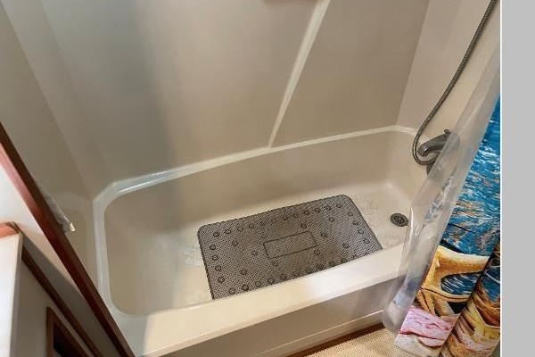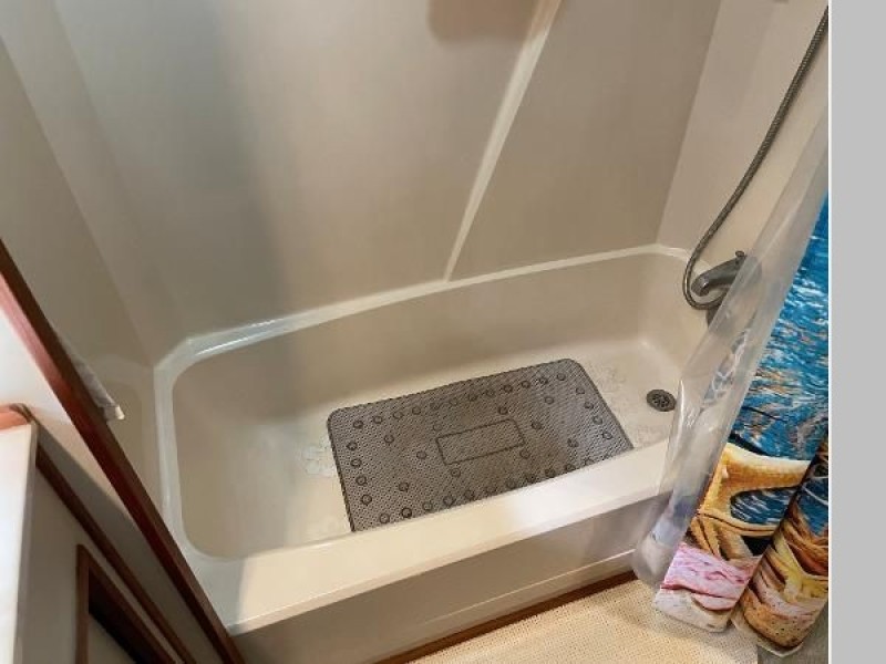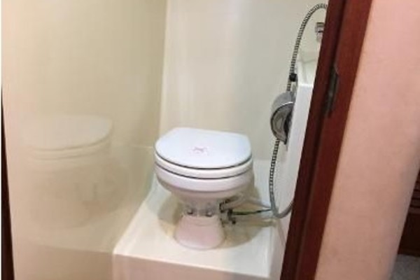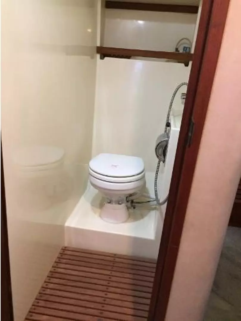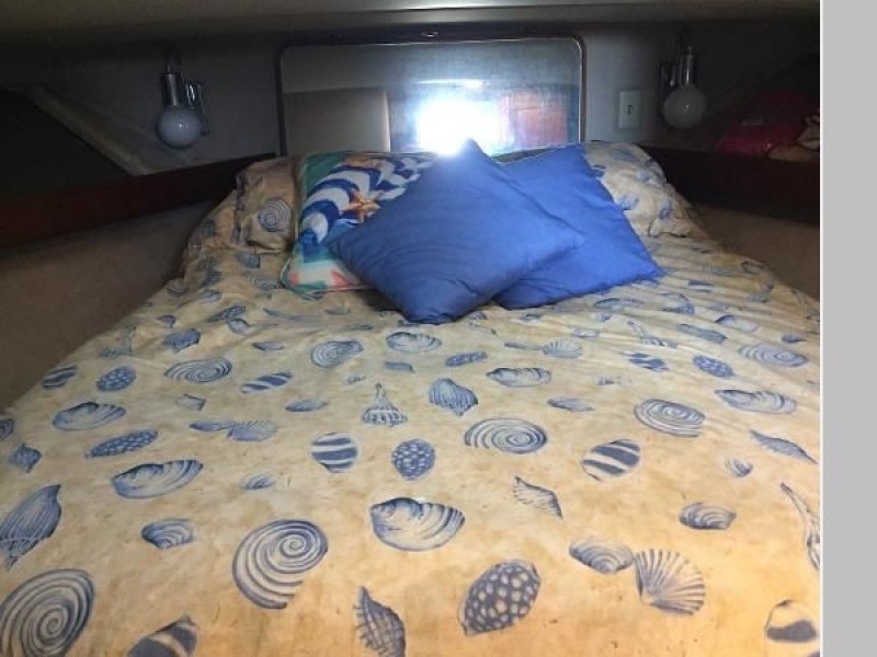 - The forward v-berth has a full size centerline bed with its own separate head, shower, sink and closet.