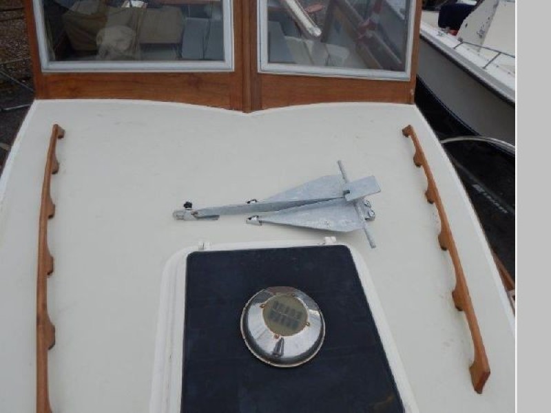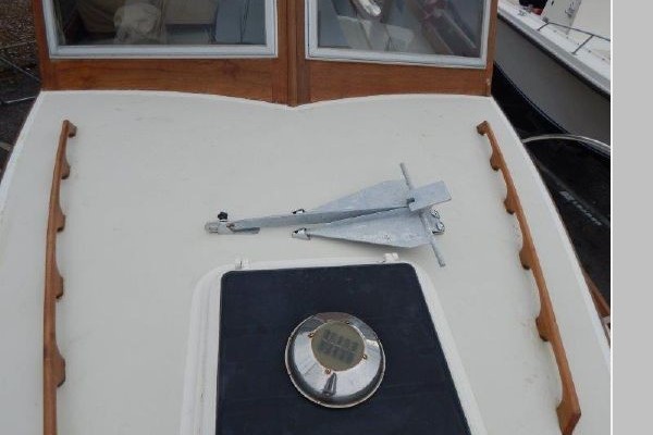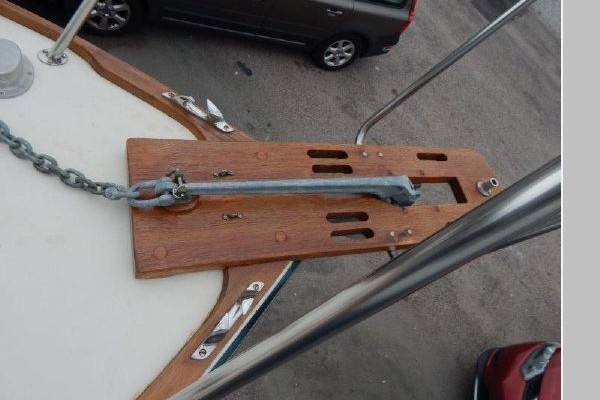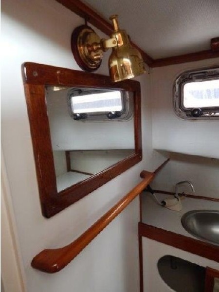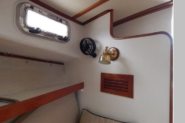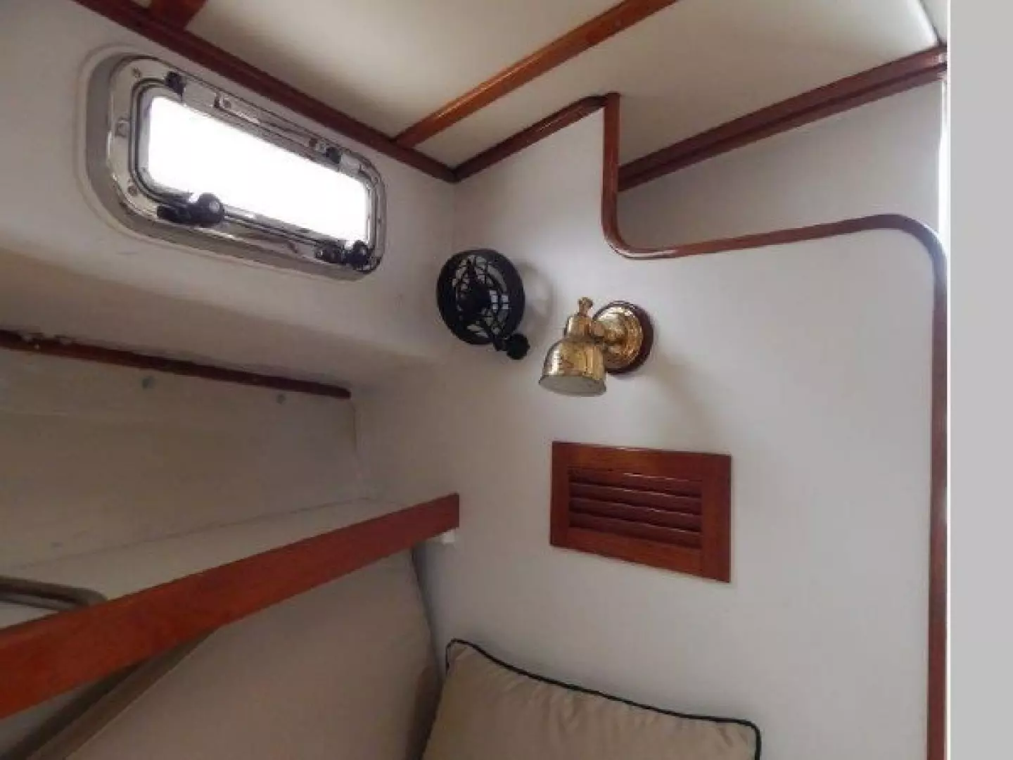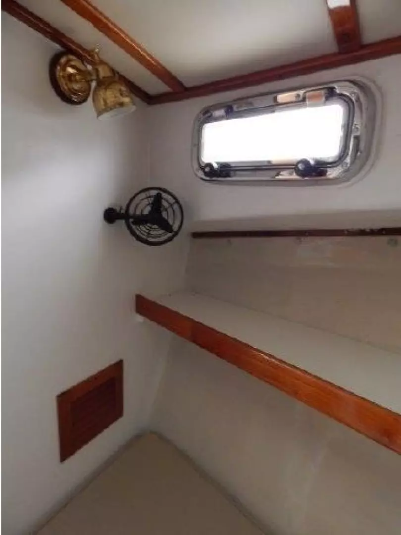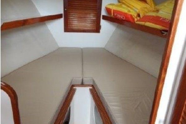 There is access to the anchor locker with 2 shelves forward, a 6 foot 3 inch V-berth with storage shelves outboard and storage below, the galley is aft to port and the enclosed head is to starboard. There are 4 opening stainless steel ports with screens and an overhead hatch for ventilation. The cabin sole is varnished teak and holly.