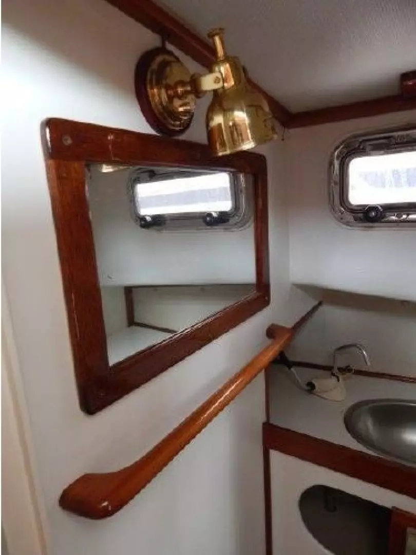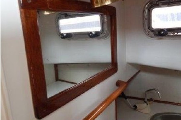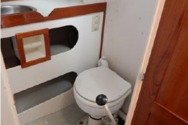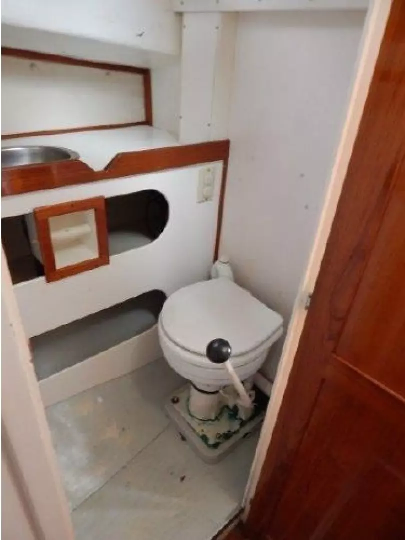 The head has a manual pump head rebuilt in 2016 and vanity with manual pump water. There is a holding tank and deck pumpout.