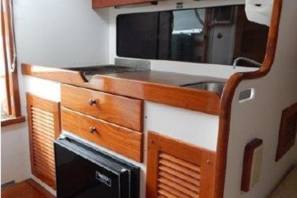 The galley has a Norcold TEK II refrigerator, 2 burner Force 10 propane stove installed 2006, a stainless sink with manual pump water.