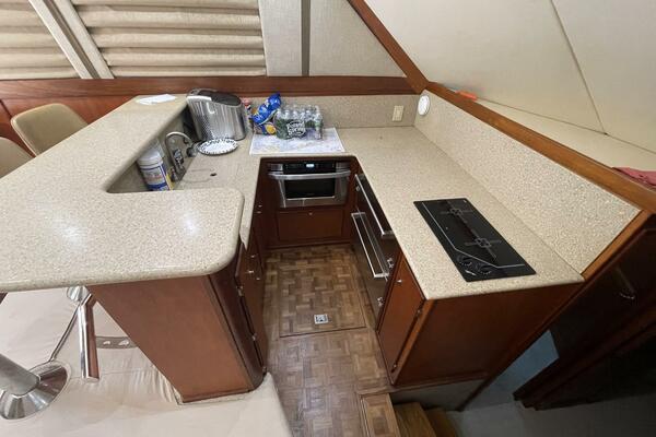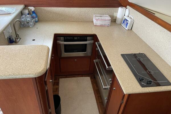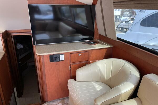 Enter salon from port side, at door is ships electrical panel, barrel swivel chair and galley countertop with 3 swivel stools. Across to starboard is the L-Shaped couch with Teak table and forward starboard bulkhead is a 32” Flat Screen TV. Carpeting, Headliner with recessed lighting, valances and blinds.