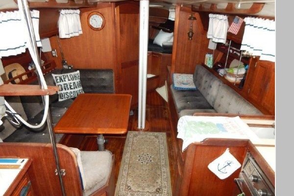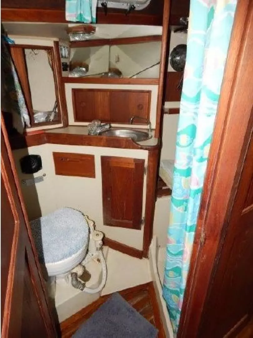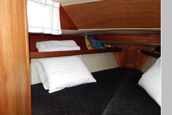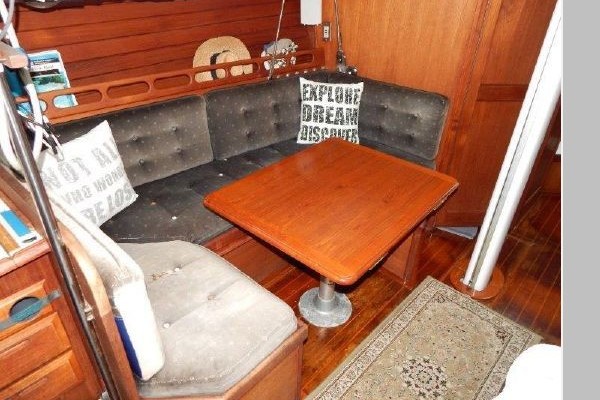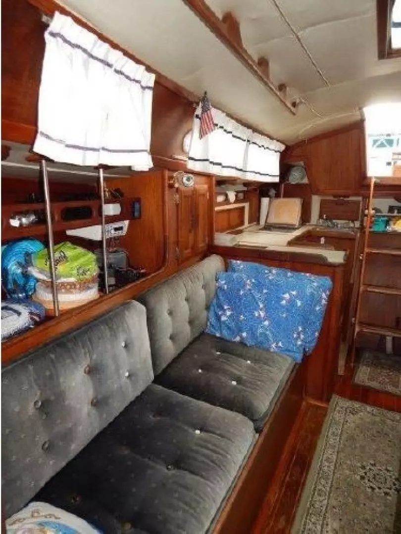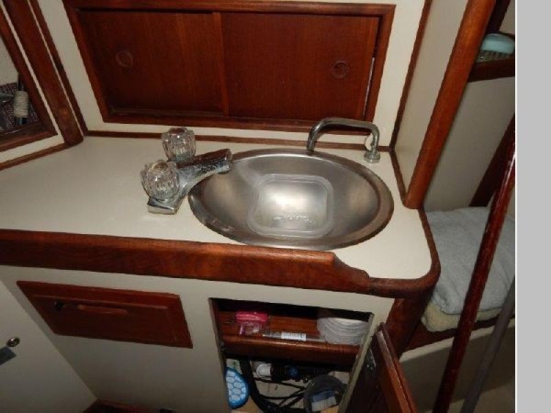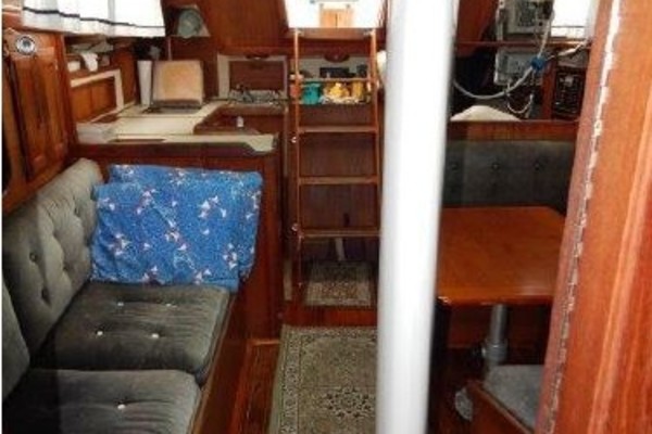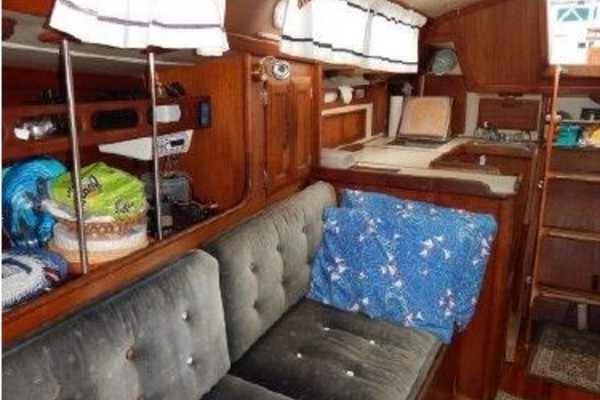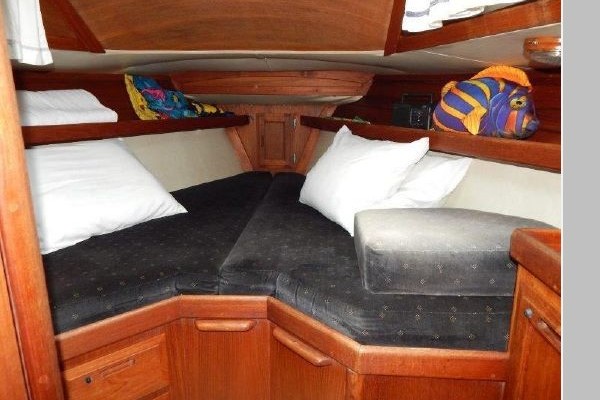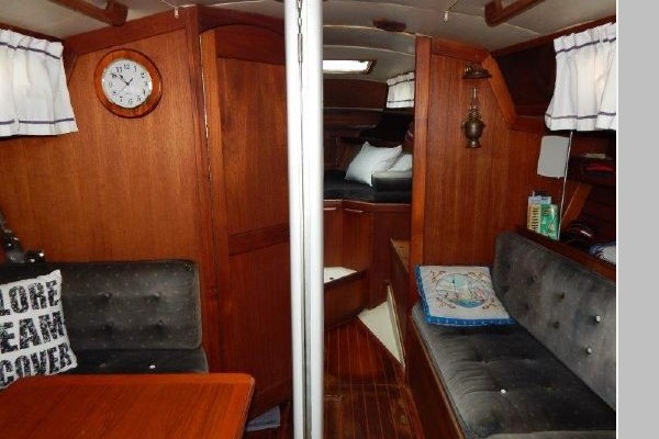 V-berth forward with filler and dressing seat with outboard shelves, hanging lockers and storage cabinets to starboard, enclosed head with 2 entrances to port. Next aft has a settee to starboard and convertible U-shaped dinette to port, the galley is aft to starboard and the navigation station and quarter berth to port.