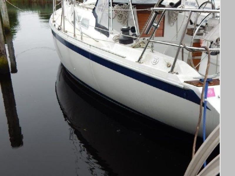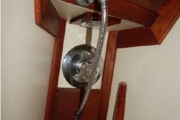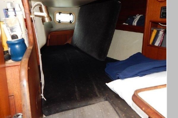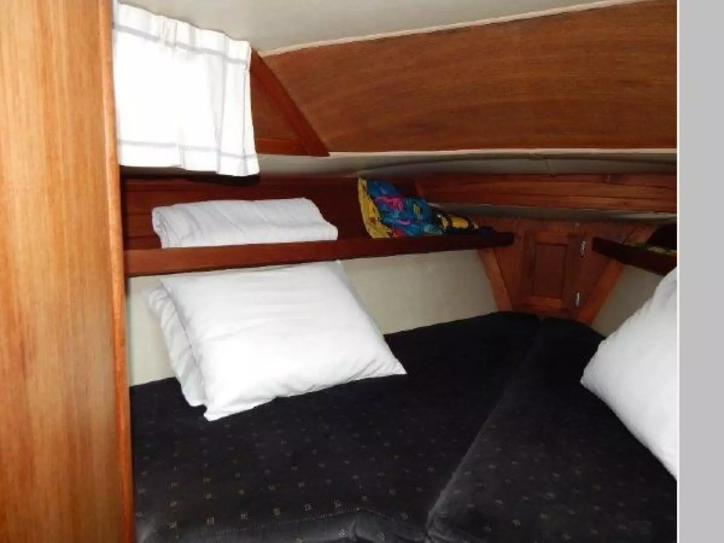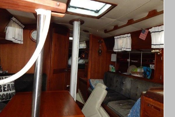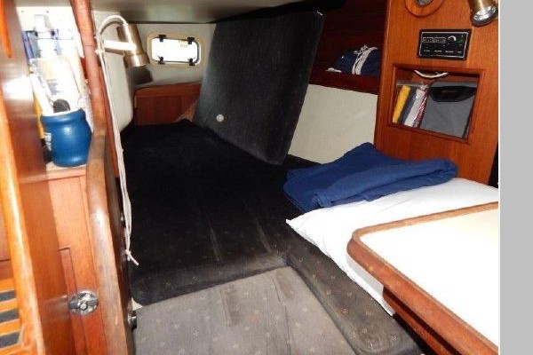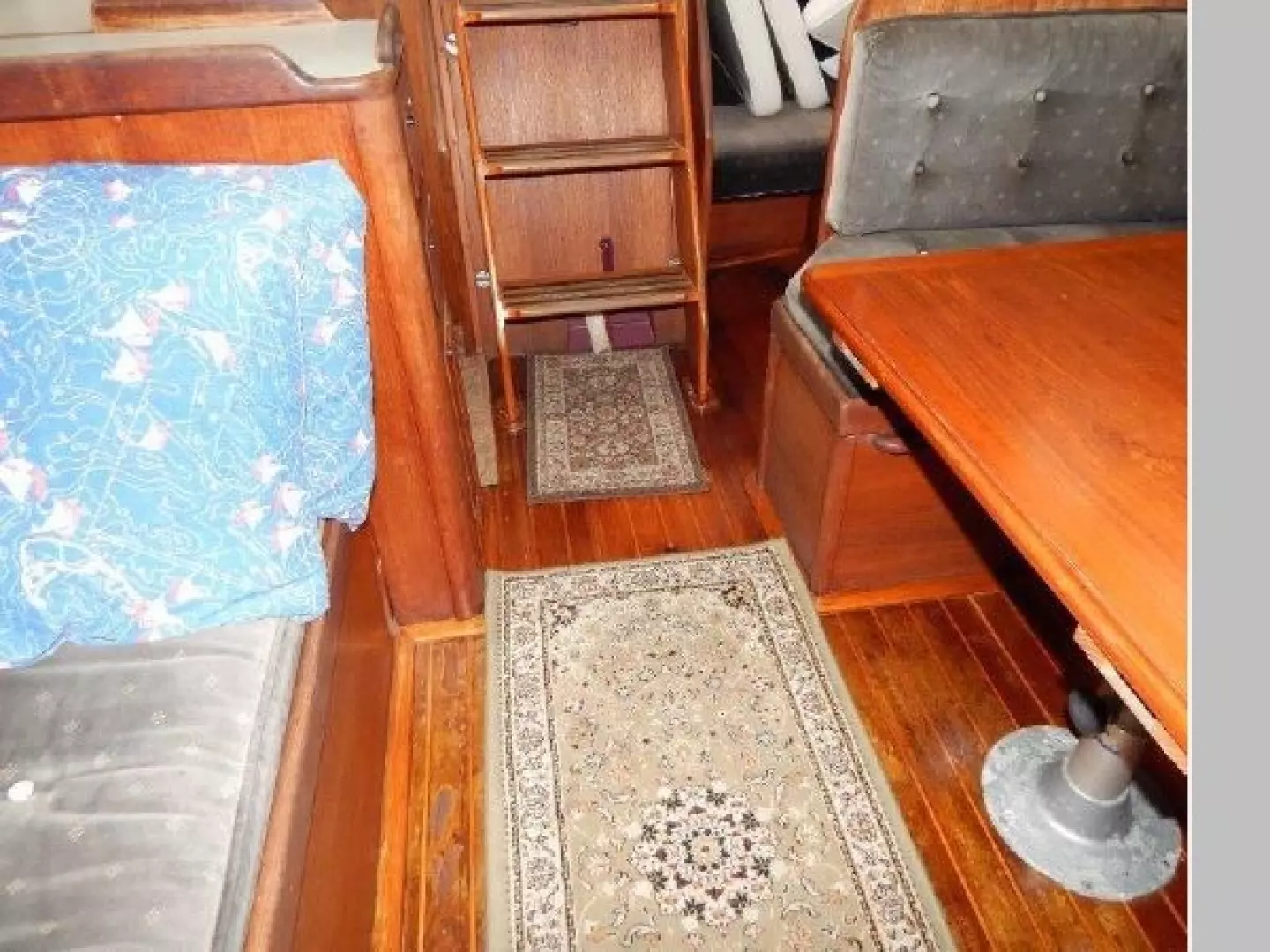 V-berth forward with filler and dressing seat with outboard shelves, hanging lockers and storage cabinets to starboard, enclosed head with 2 entrances to port. Next aft has a settee to starboard and convertible U-shaped dinette to port, the galley is aft to starboard and the navigation station and quarter berth to port.
