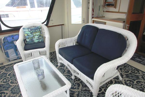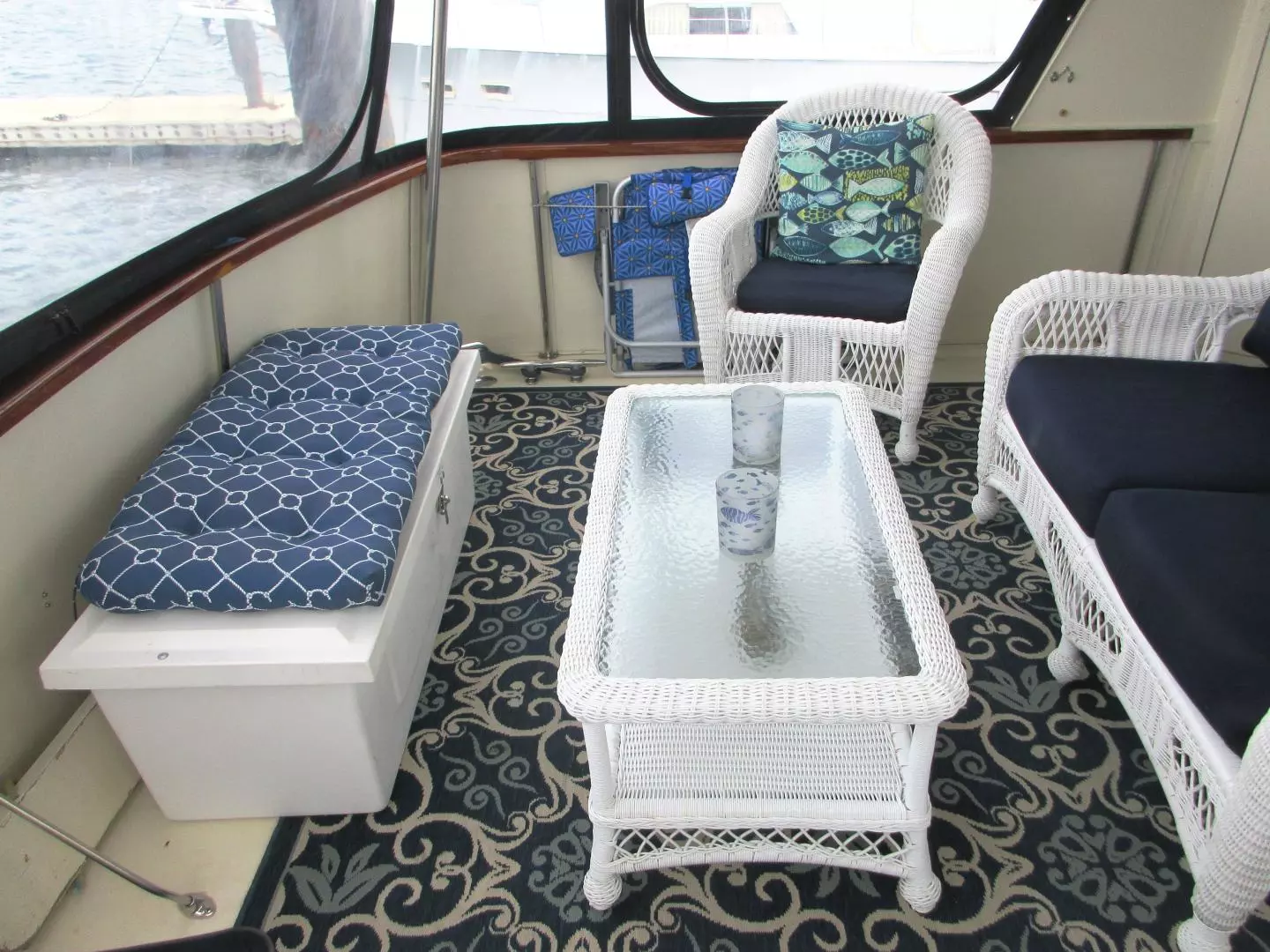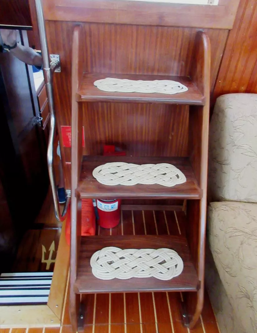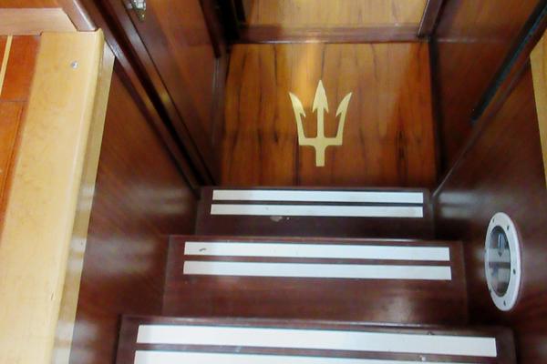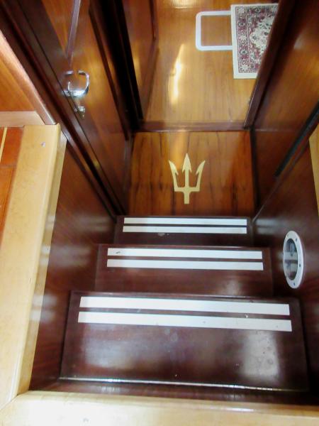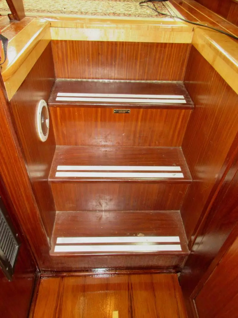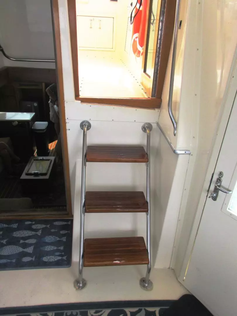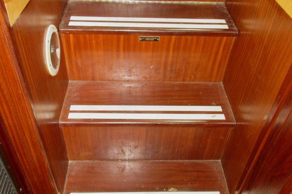 The Helm Station area is accessed by the Entrance that's located on the starboard side of the Aft Deck. There are (3) varnished teak steps w/ stainless steel handrails.
