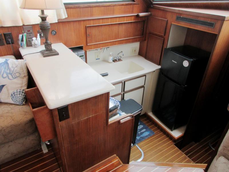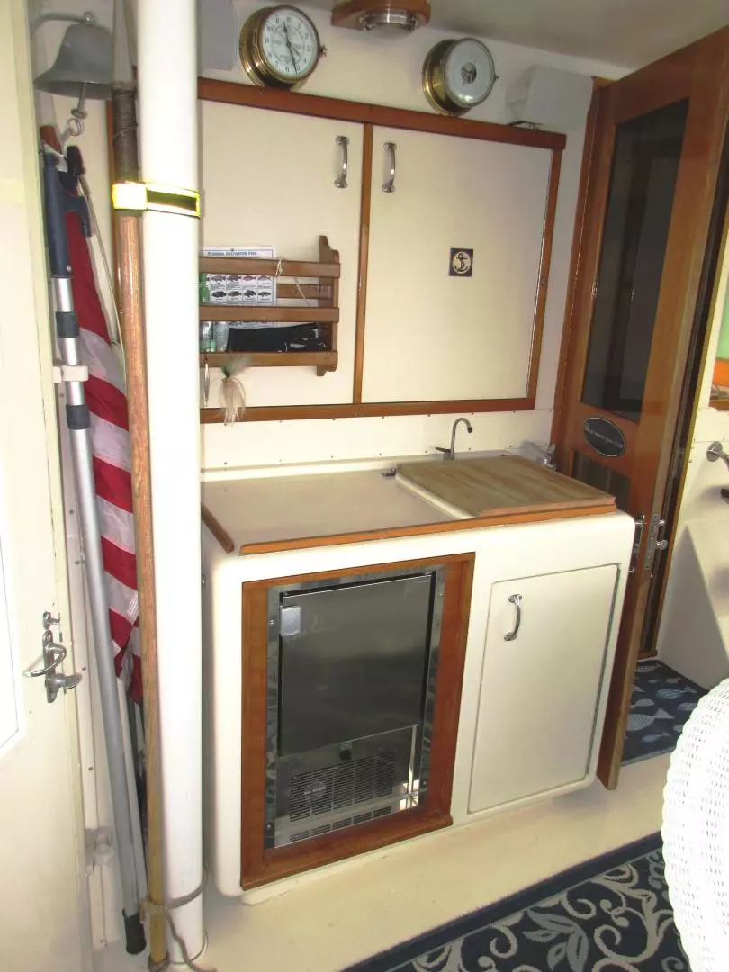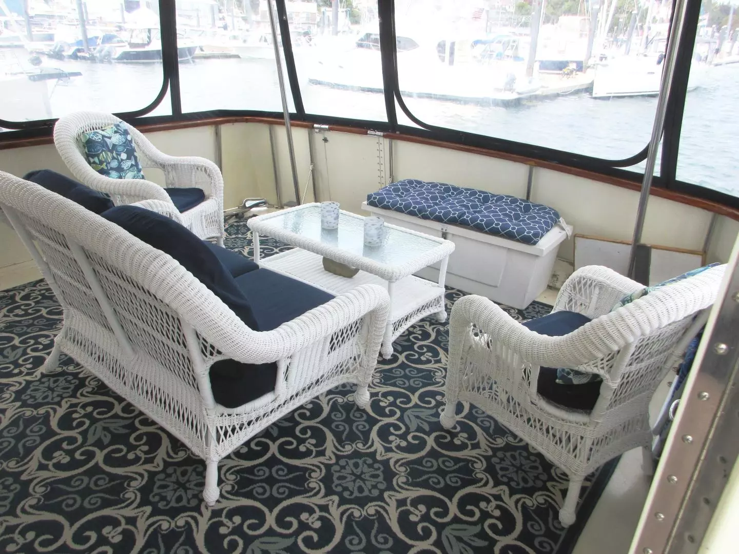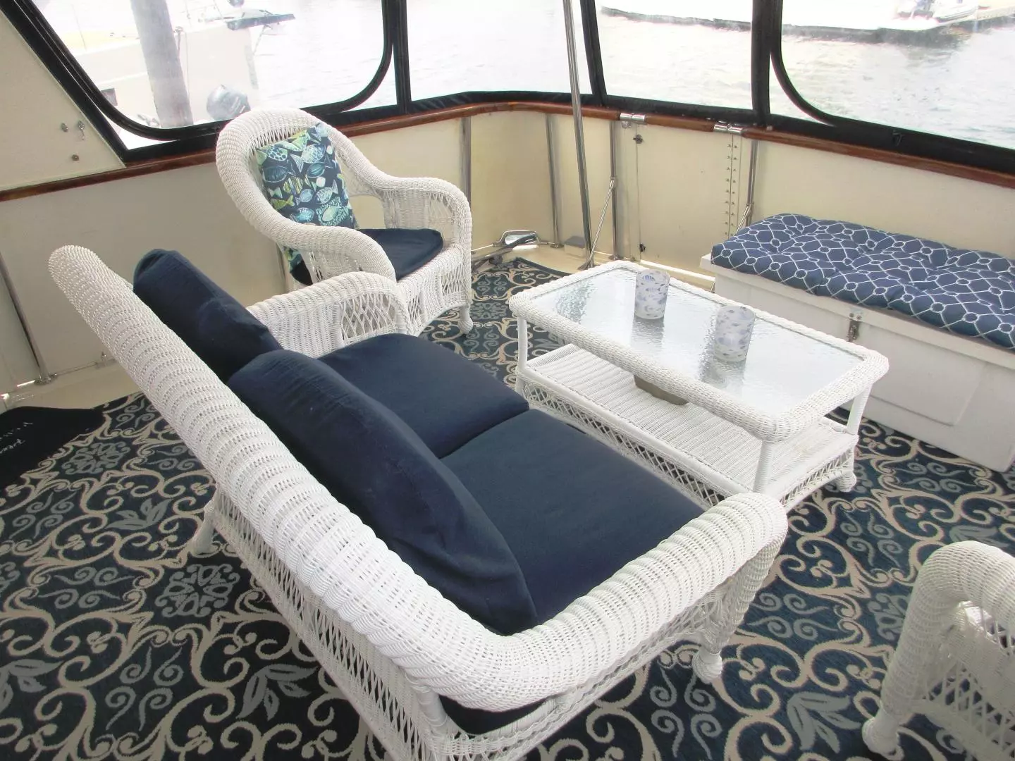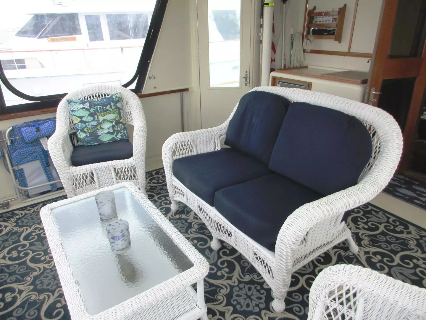 The Helm Station area is accessed by the Entrance that's located on the starboard side of the Aft Deck. There are (3) varnished teak steps w/ stainless steel handrails.