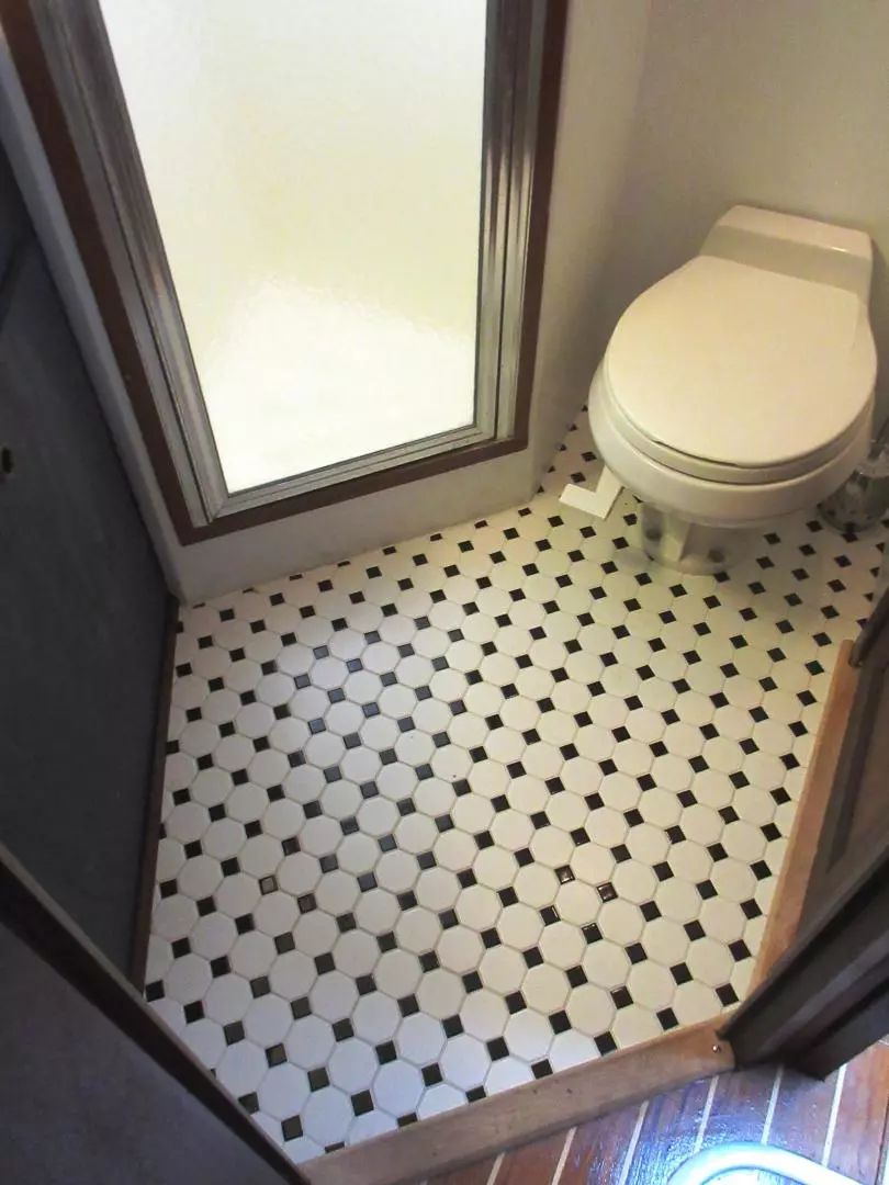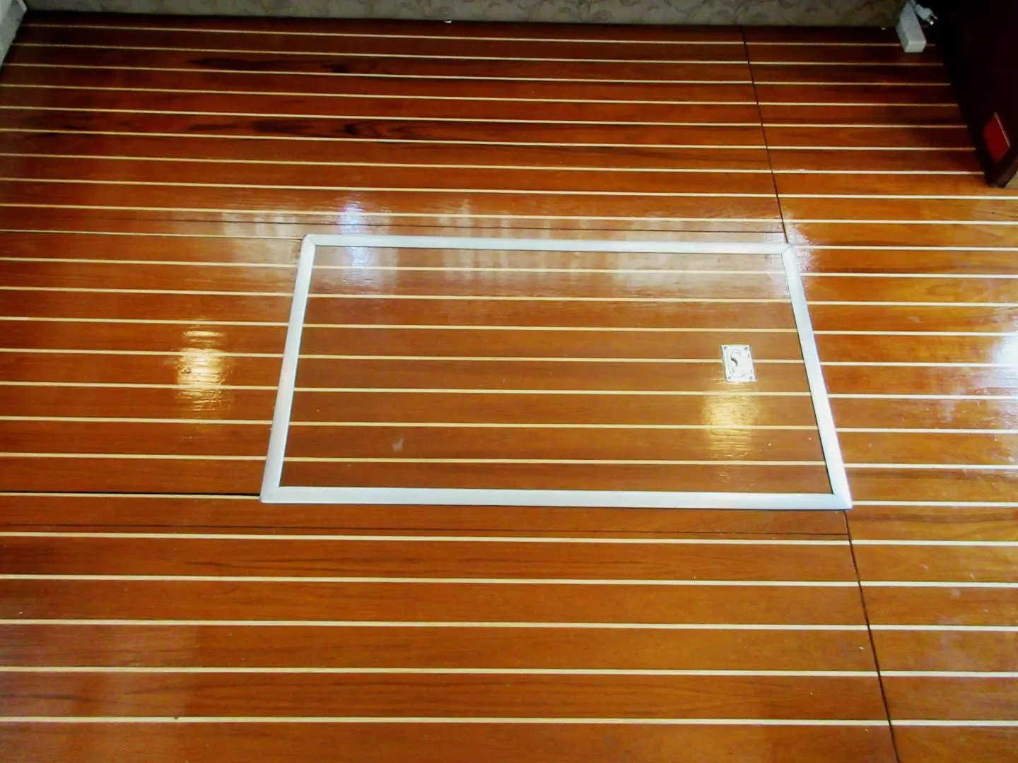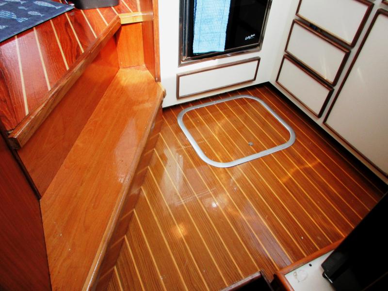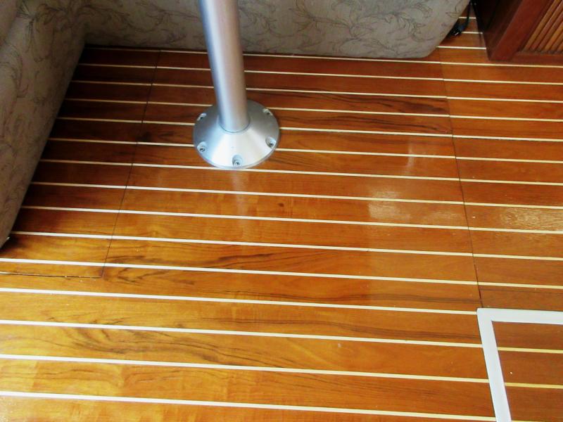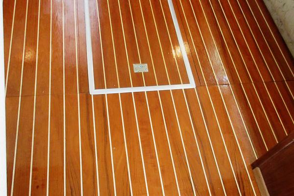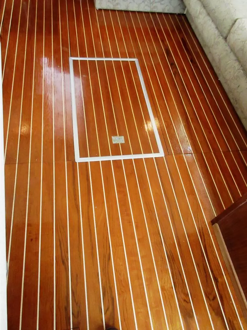 - Custom teak & holly sole w/ (3) access panels for access to shaft logs & storage (note: w/ custom aluminum edge trim)