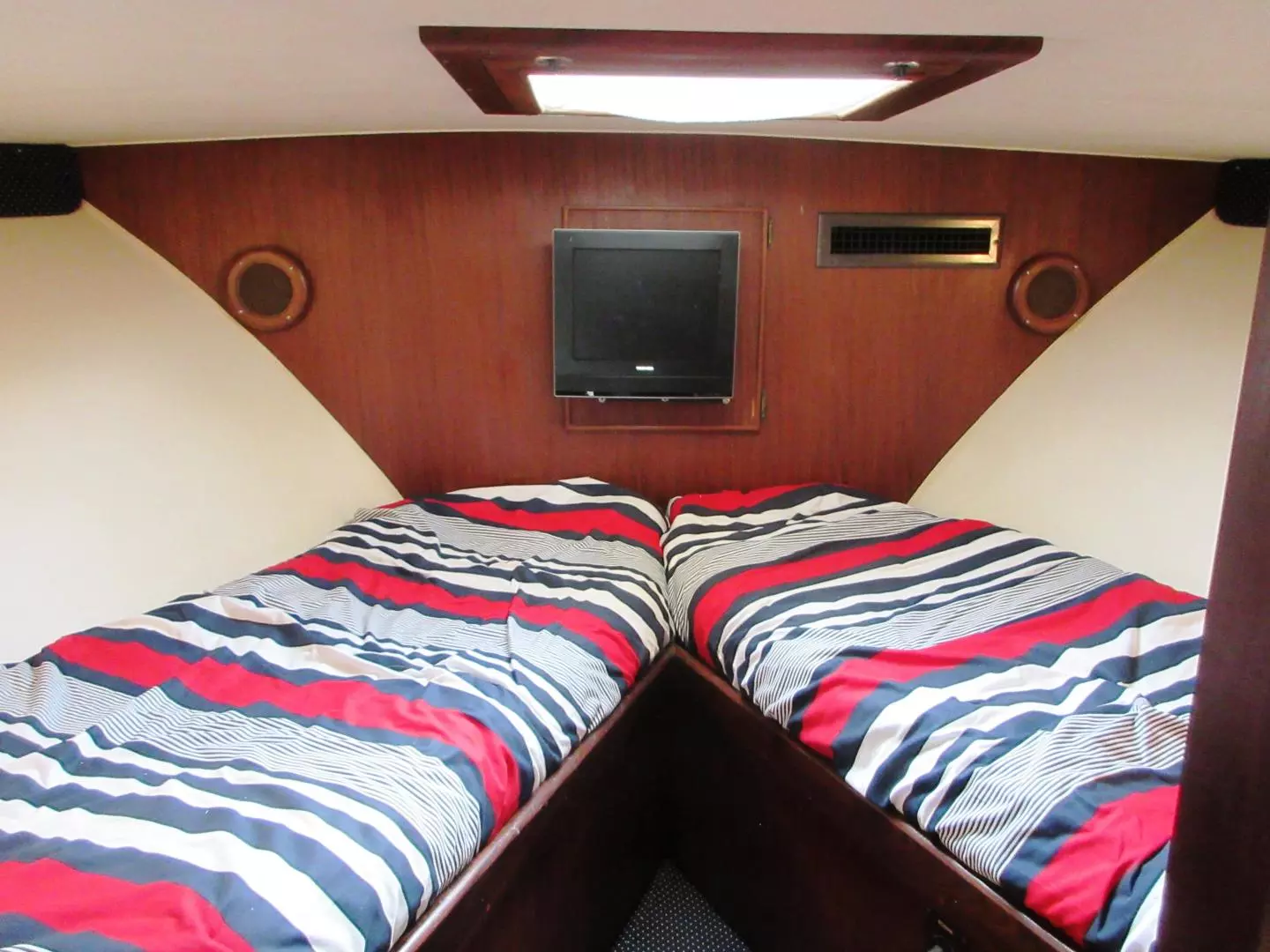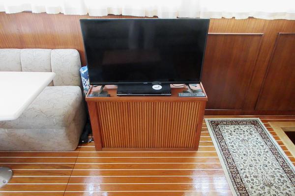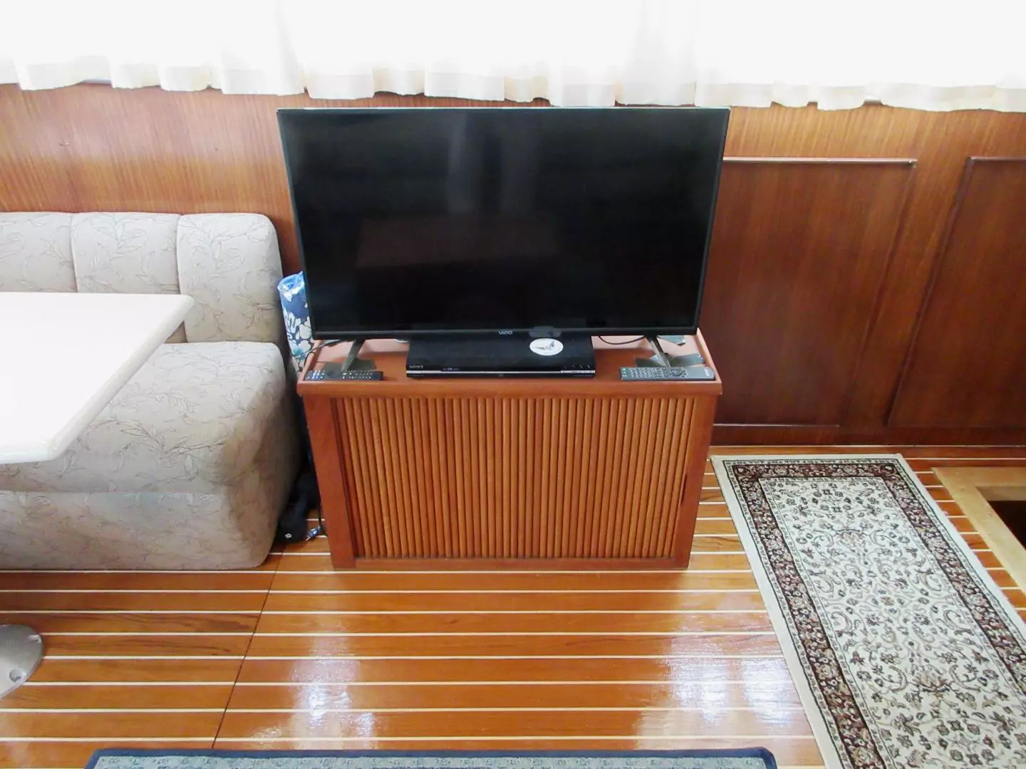 - Custom teak TV stand to starboard (note: has storage & for the 40" IZIO Flat Screen TV)