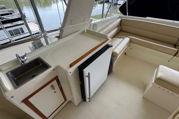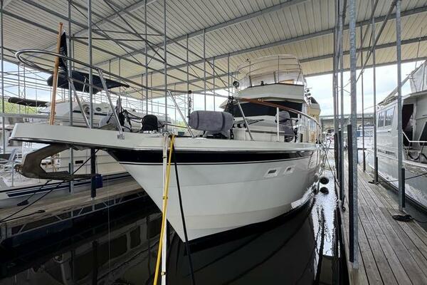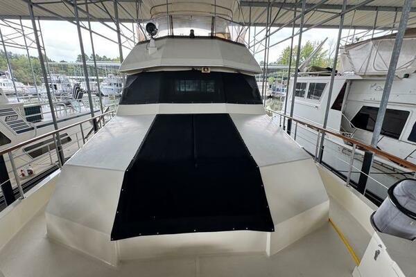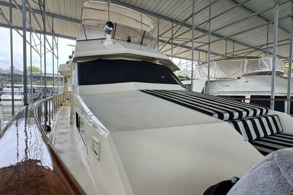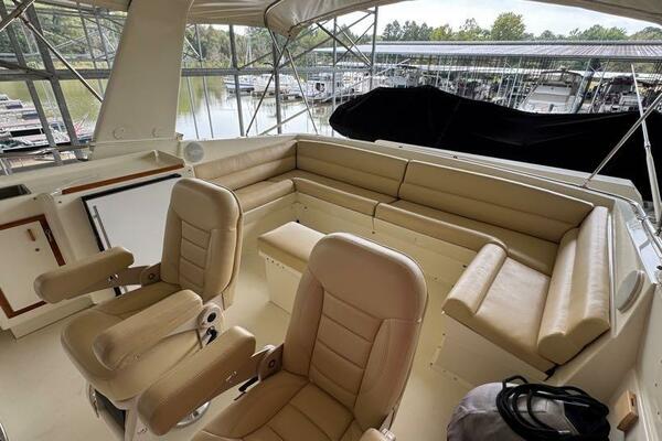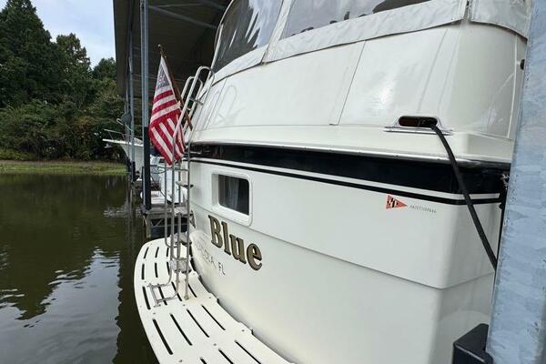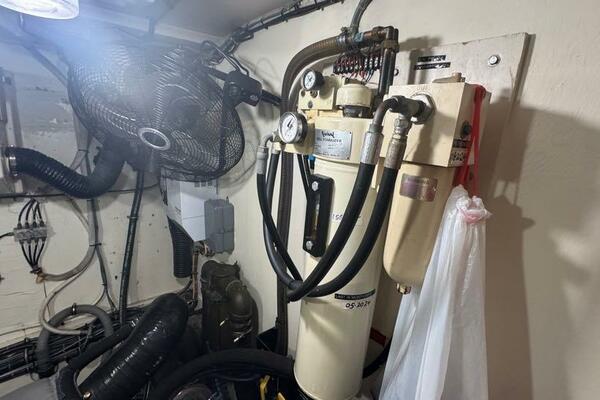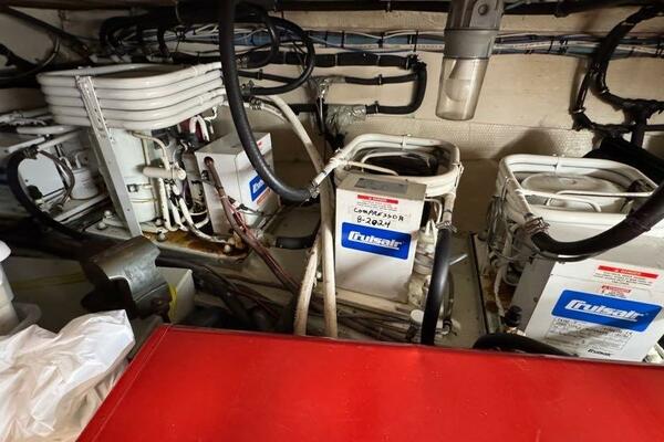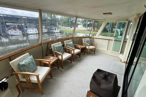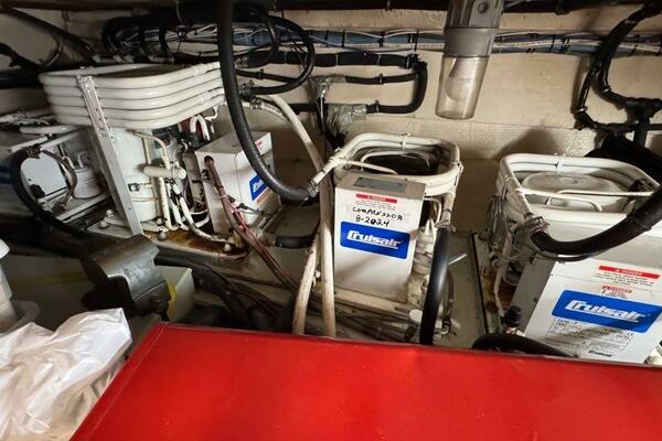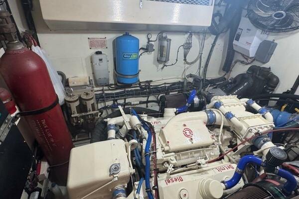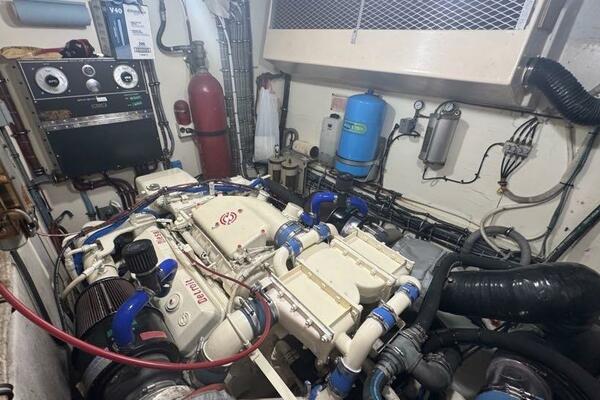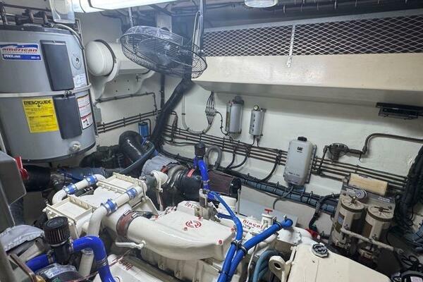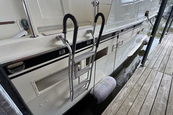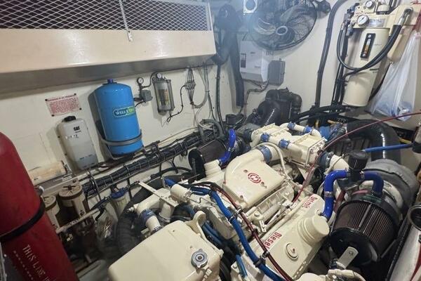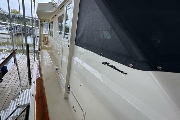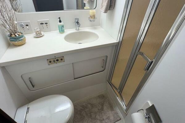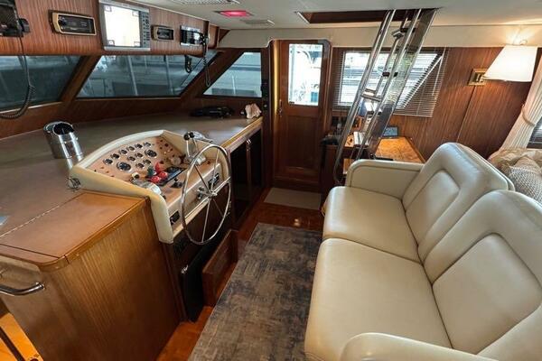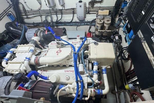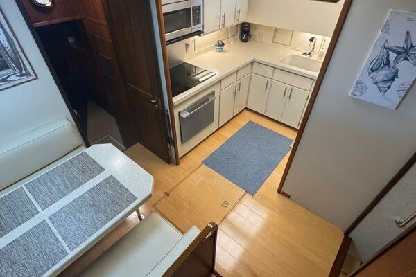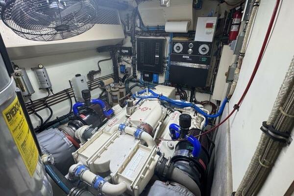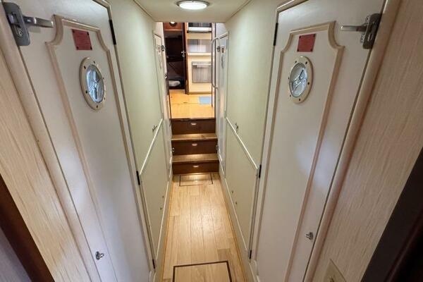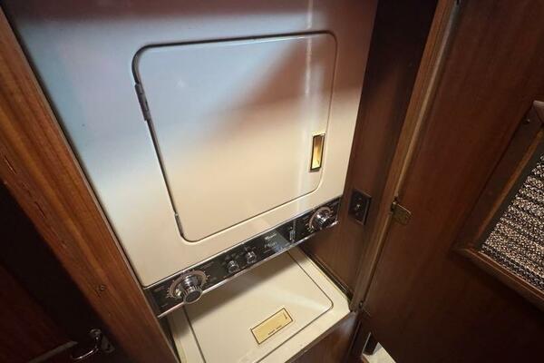 Board via the wide swim platform and transom to the cockpit-style aft deck (new carpet & furniture 9/2024). From here, you can access the port or starboard wide side decks. Entering through the Starboard side pilothouse door you are able to access the flybridge via a ladder from within the pilothouse. The Flybridge with a hinged radar arch, updated seating, and a bridge refrigerator/ice maker. Enter the pilothouse/salon with large windows, new treatments (2024–2025), occasional chairs (2025), and a wine cooler. Forward is the galley & dinette (updated appliances), then the three-stateroom, three-head layout: forward guest, mid guest, and a full-beam aft owner’s suite, each with a Tecma head with all sanitation hoses replaced. Engine room access is wonderful through the lower companionway in the forward berth, you find an apartment-style stackable Washer and a separate dryer.