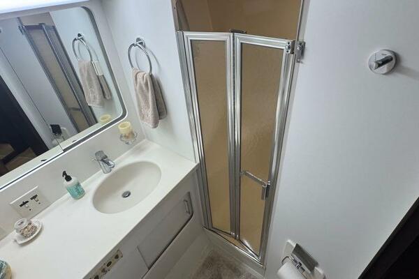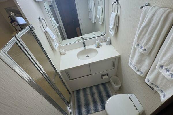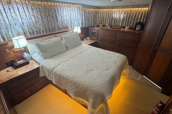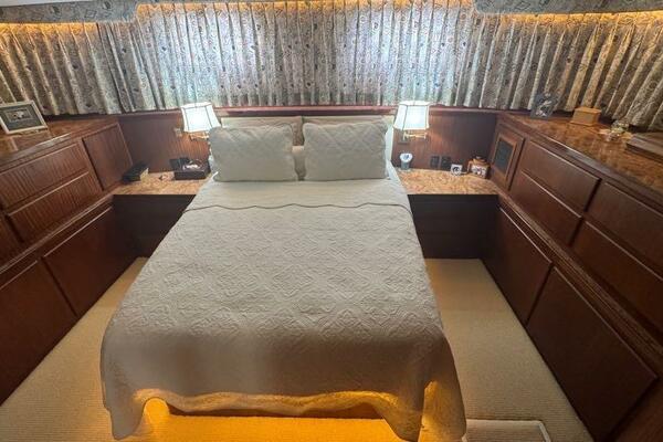 Aft is the full-beam owner’s suite—quiet, balanced, and surrounded by Hatteras cabinetry. The center-island queen is flanked by long bureaus and nightstands, providing tremendous drawer and counter space. Soft indirect lighting, drapery, and the custom latex foam mattress (2023) create a restful retreat. Of course, the owner’s head with shower is just steps away, and the suite benefits from its own air-handler for precise climate control.