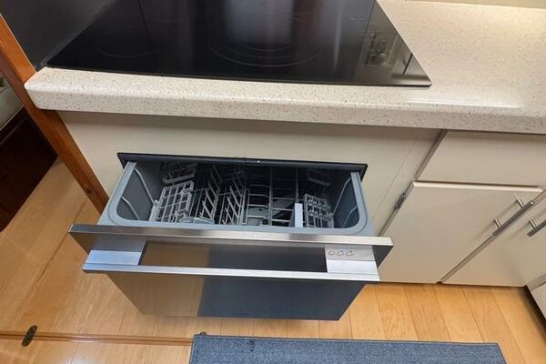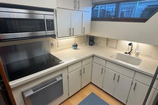 Set a half-level down from the salon, the U-shaped galley is bright, spotless, and designed for real cooking. Neutral solid-surface counters wrap three sides, with under-cabinet task lighting, multiple 110V outlets, and a large single-basin sink with pull-out sprayer beneath a long hullside window. Updates include a Fisher & Paykel French-door refrigerator (20.1 cu ft), F&P convection microwave, and F&P dishwasher, paired with a smooth GE 4-burner electric cooktop/oven—all within easy reach and surrounded by deep lockers and full-height pantry stowage. The easy-care wood sole is warm and resilient, and lift-out hatches provide clean access to machinery spaces below.