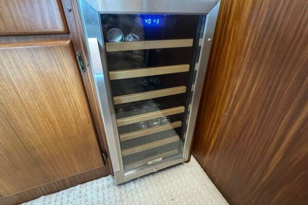 Forward, a low built-in media cabinet with book shelving anchors a flat-screen TV, with additional storage tucked neatly into the cabinetry. The salon flows naturally into the pilothouse—open to the helm so guests can relax and still be part of the conversation underway—and a sliding door aft (starboard) makes it easy to step outside. Comfort is effortless thanks to the salon’s dedicated 30,000 BTU air-conditioning (two air handlers), and a wine cooler nearby keeps refreshments ready for guests. It’s a true “home aboard” living room: bright by day, inviting by night, and sized right to entertain 6–8 comfortably.