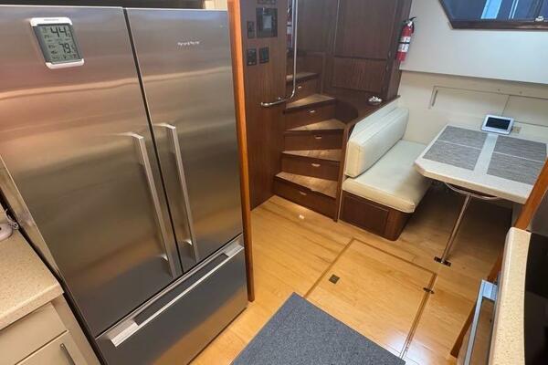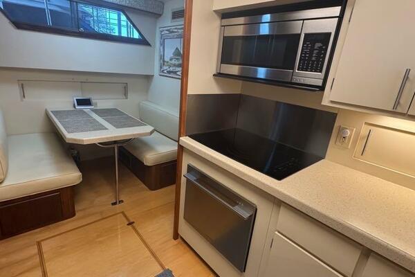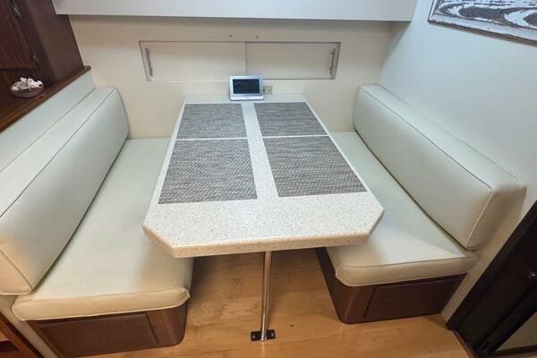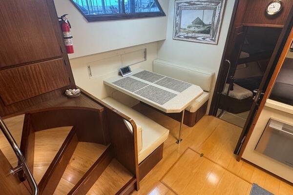Opposite the galley, the dinette seats four comfortably and converts for extra serving space when entertaining. New valances and pleated blinds (2024) dress the space, while the short stair up to the pilothouse keeps the cook connected to the action underway. Everyday livability is excellent: the Victron 3000W inverter/charger powers the refrigerator, microwave, and galley/dinette outlets, so coffee, lunches, and snacks are effortless without running the generator. Taken together, this is a bright, modern working galley that feels residential in scale—perfect for long stays aboard or full-time cruising.