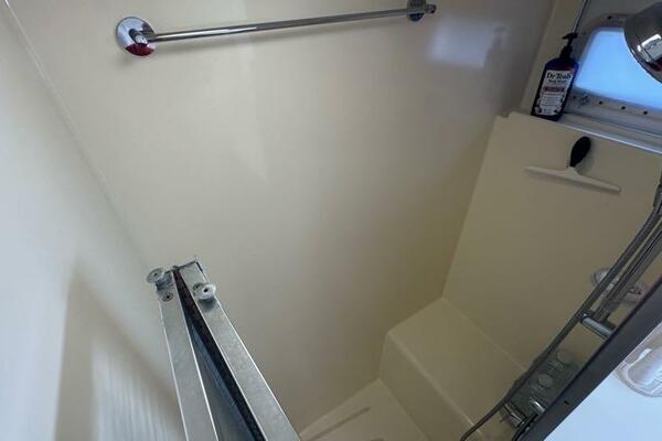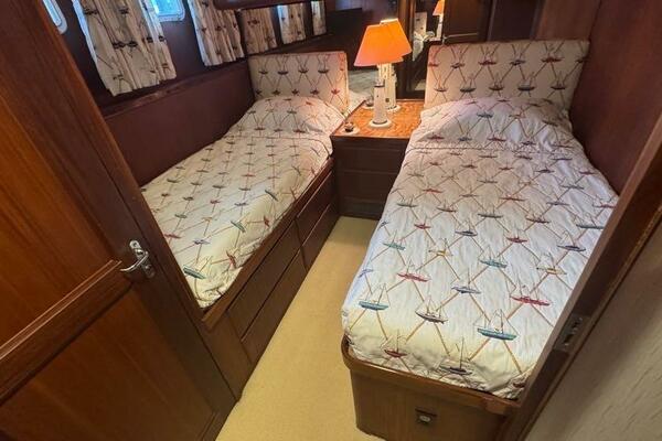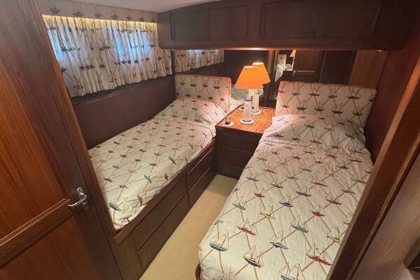 Amidships, the second guest cabin feels unusually generous for a 54’—twin berths separated by a nightstand, hull windows for natural light, and full-length drawers under each berth. Overhead lockers and a hanging closet swallow weeks of clothing, while the adjacent private/semi-private head with shower keeps this cabin comfortable for longer cruises.