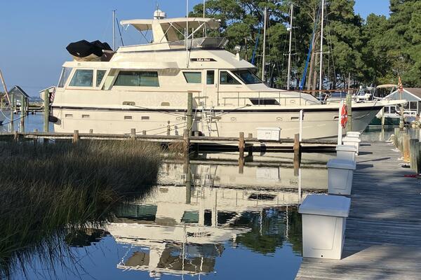 A beautifully kept, heavily updated Hatteras 54 Motoryacht with the big-boat volume buyers love and the expensive systems already handled. LiLa Blue shows outstanding care: fresh LED lighting throughout (2025), new Victron 3000W inverter/charger (2023), updated sanitation with Tecma Type I/MSD-1 Purasan (2024), NAIAD stabilizers serviced (2025), windlass serviced (2025), new house/start batteries (2024), décor refreshes inside and out, and a thoughtfully maintained.