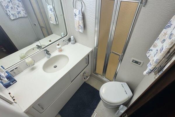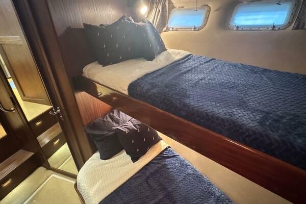 Tucked in the bow, the forward guest cabin is a smart upper/lower berth arrangement—great for kids, grand-kids, or crew. Warm teak joinery frames the space, with a tall mirrored locker at the entry and a bank of drawers and cubbies to starboard. Each berth has its own reading light and deep drawer storage below. The cabin sits adjacent to its own head with shower and the updated Tecma/Purasan sanitation system, so overnight guests have real privacy.