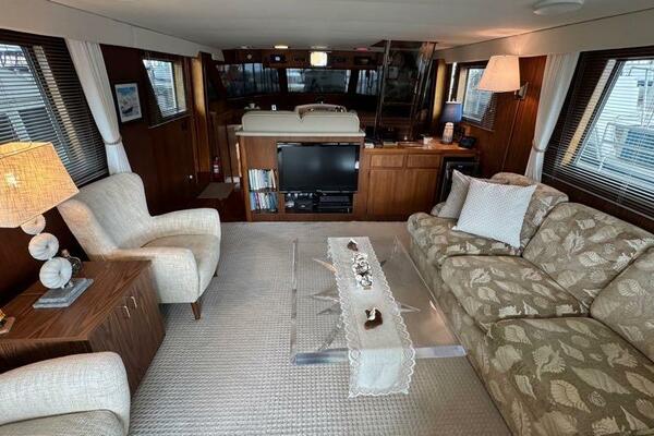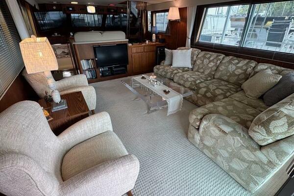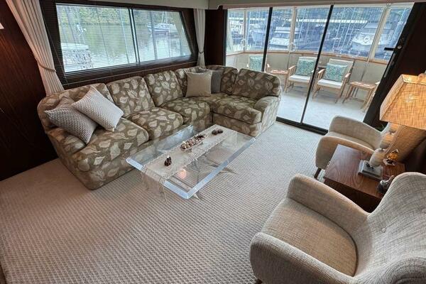 Stepping into the salon, you’re greeted by a bright, gracious living room framed by Hatteras’ signature picture windows. New window treatments (2024) and the 2025 LED lighting upgrade soften the space and highlight the warm satin teak joinery. To starboard, an oversized L-shaped sectional invites a crowd for docktails or movie night, while to port a pair of fresh occasional chairs (2025) flank a side table and lamp for a cozy reading nook. A clear acrylic coffee table keeps sightlines open over the plush carpet, and the whole space feels calm and coastal in a neutral palette.