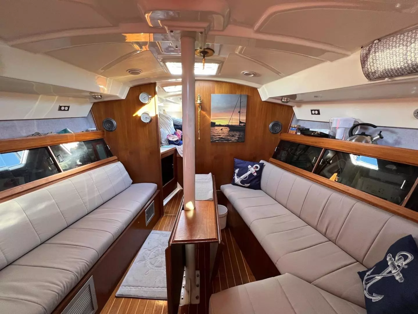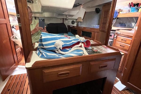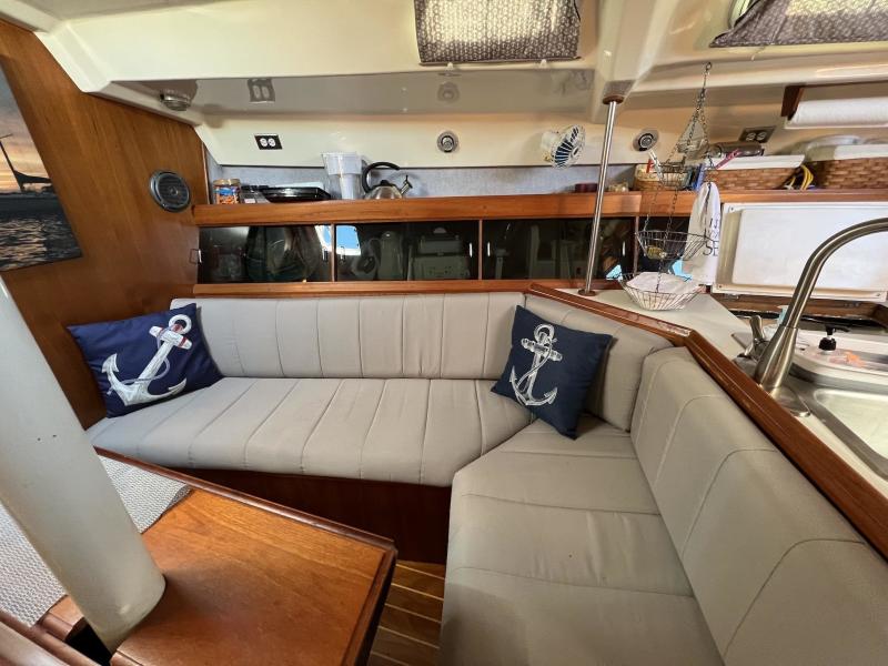 - The Main salon is quite roomy with an L-shaped dinette to starboard (can be made into an additional berth with filler), lockers with sliding doors outboard. Fixed centerline table with drop leaves allowing for a large group to dine. To port is a settee that also serves as a berth and lockers outboard as well as behind the seat back.