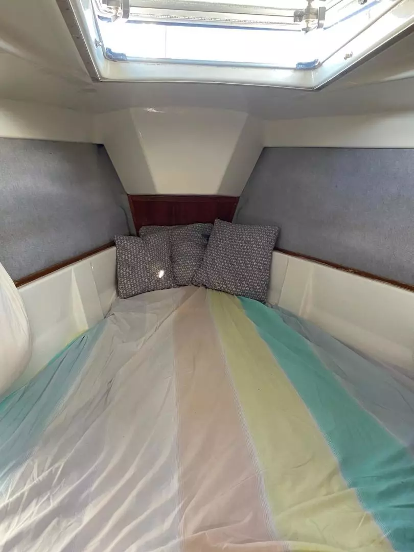 - Starting forward and aft of the chain locker is the guest stateroom. V-berth forward followed by the guest head to starboard and lockers to port. Large overhead hatch offers and abundance of light and ventilation.