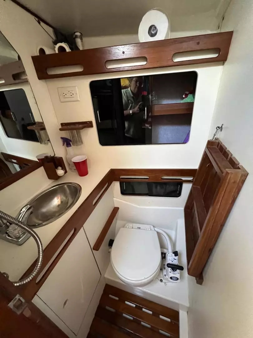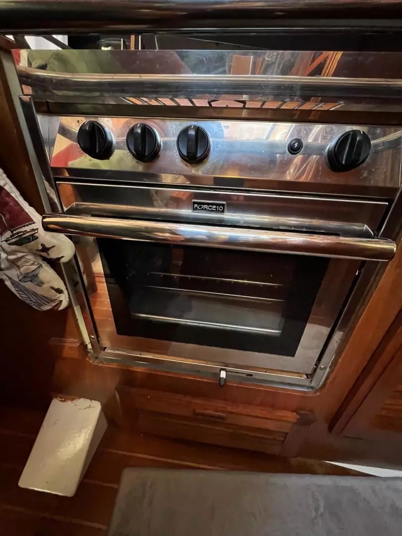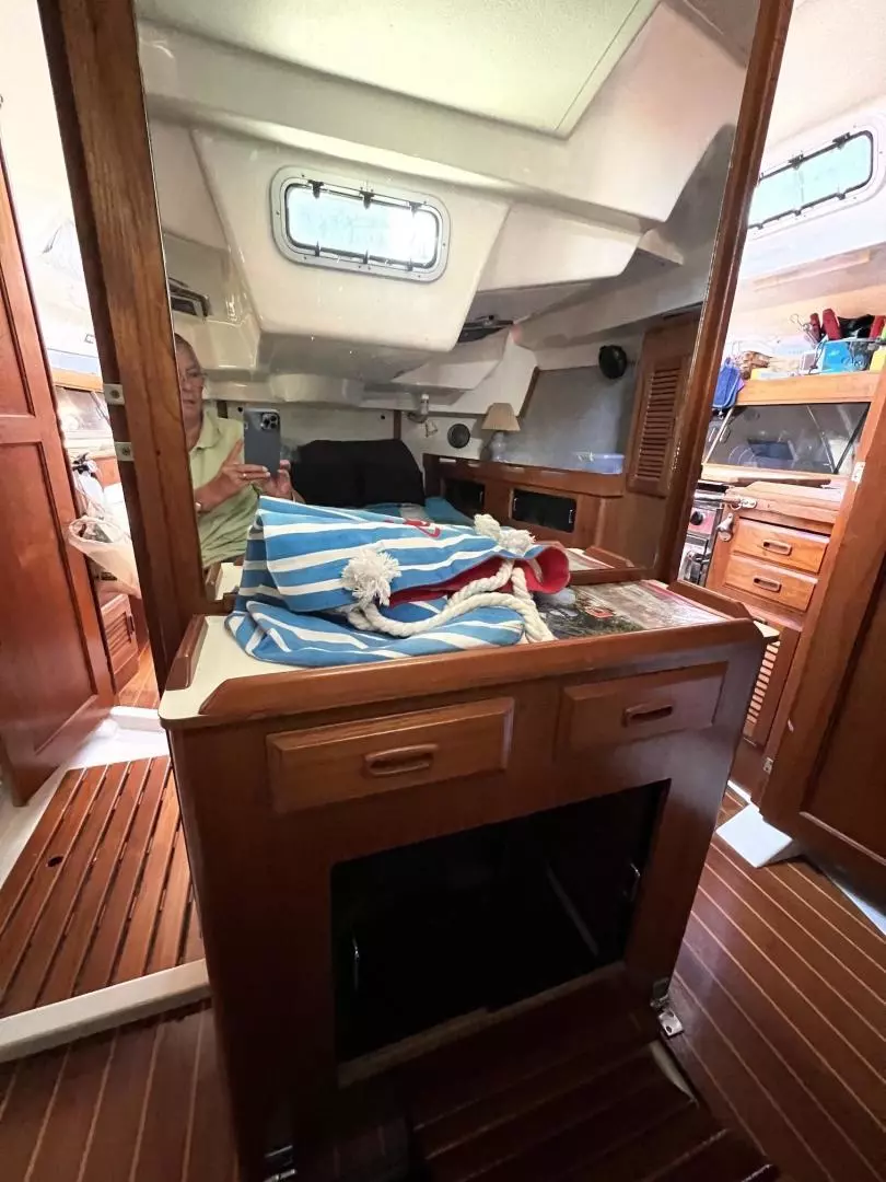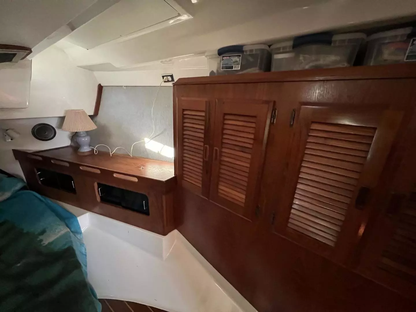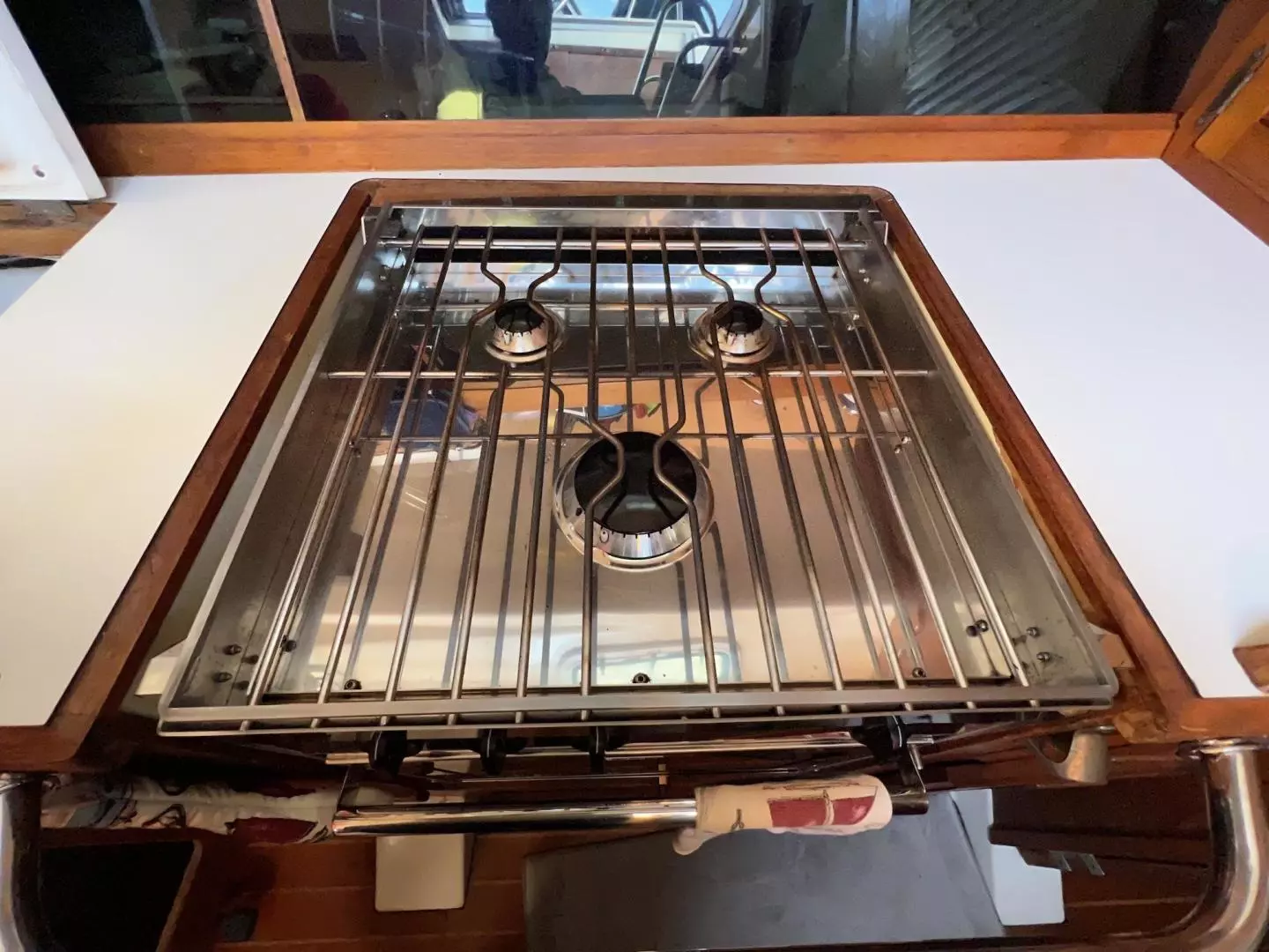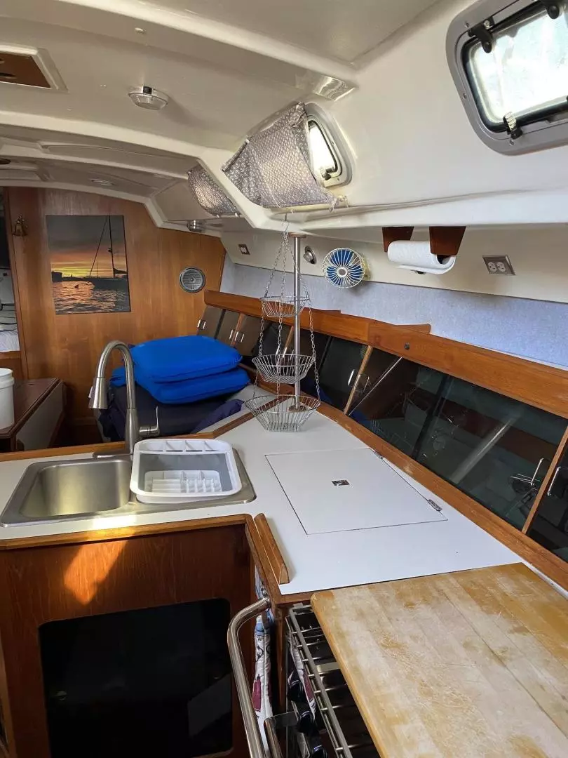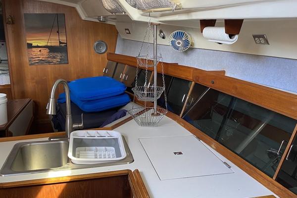 - Her galley is great for cruising or live-aboard. There is plenty of storage and counter space.Double stainless steel sinks with hot and cold pressure water. (New high faucet has been added).