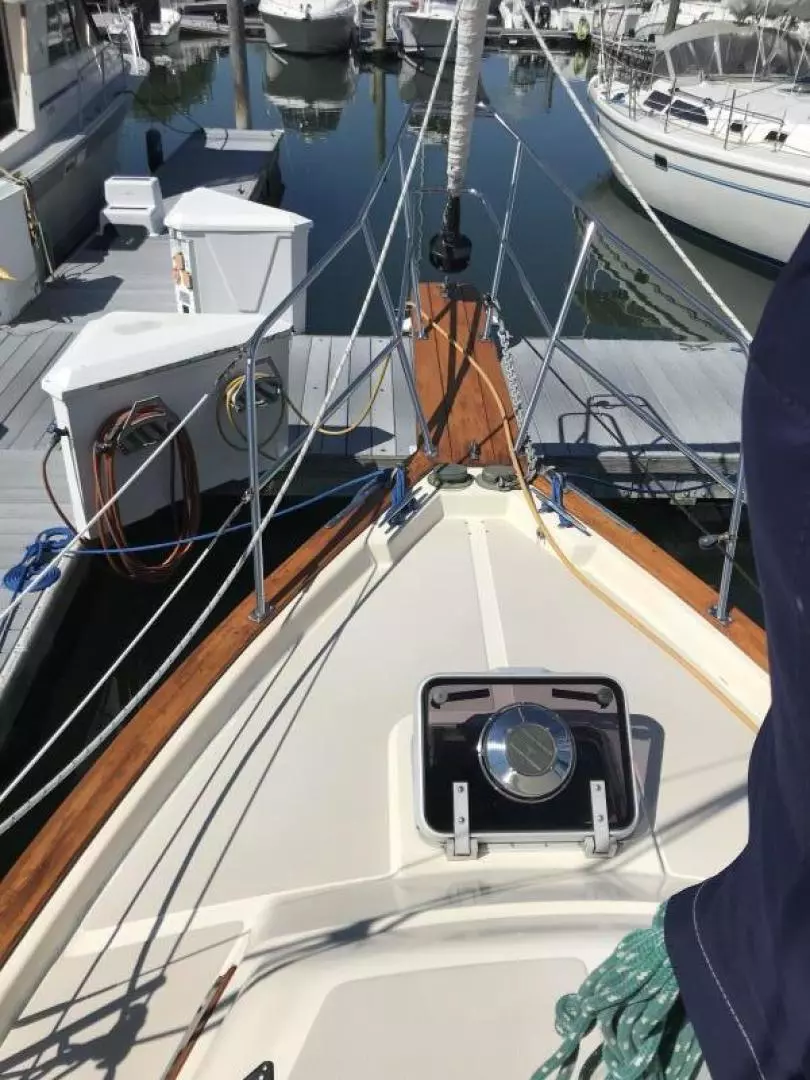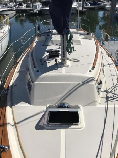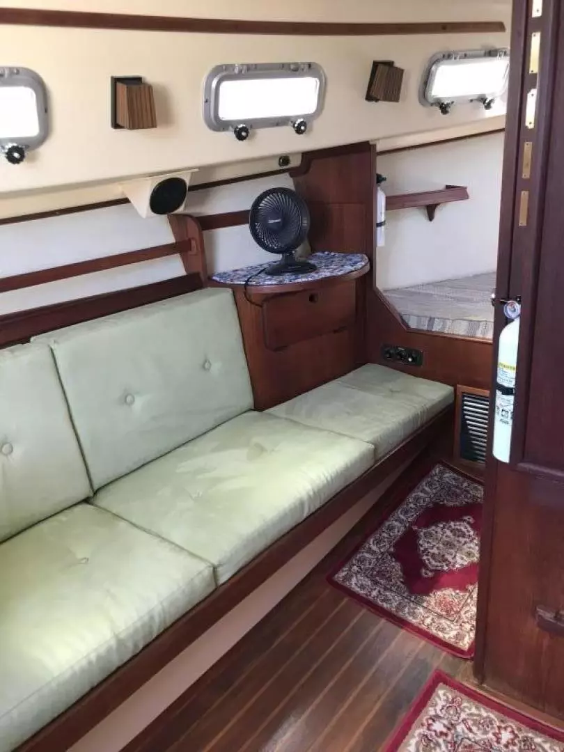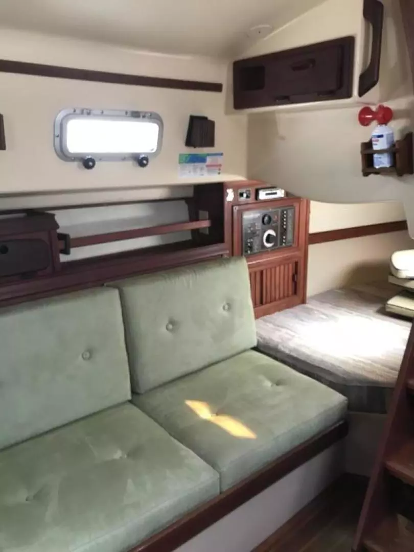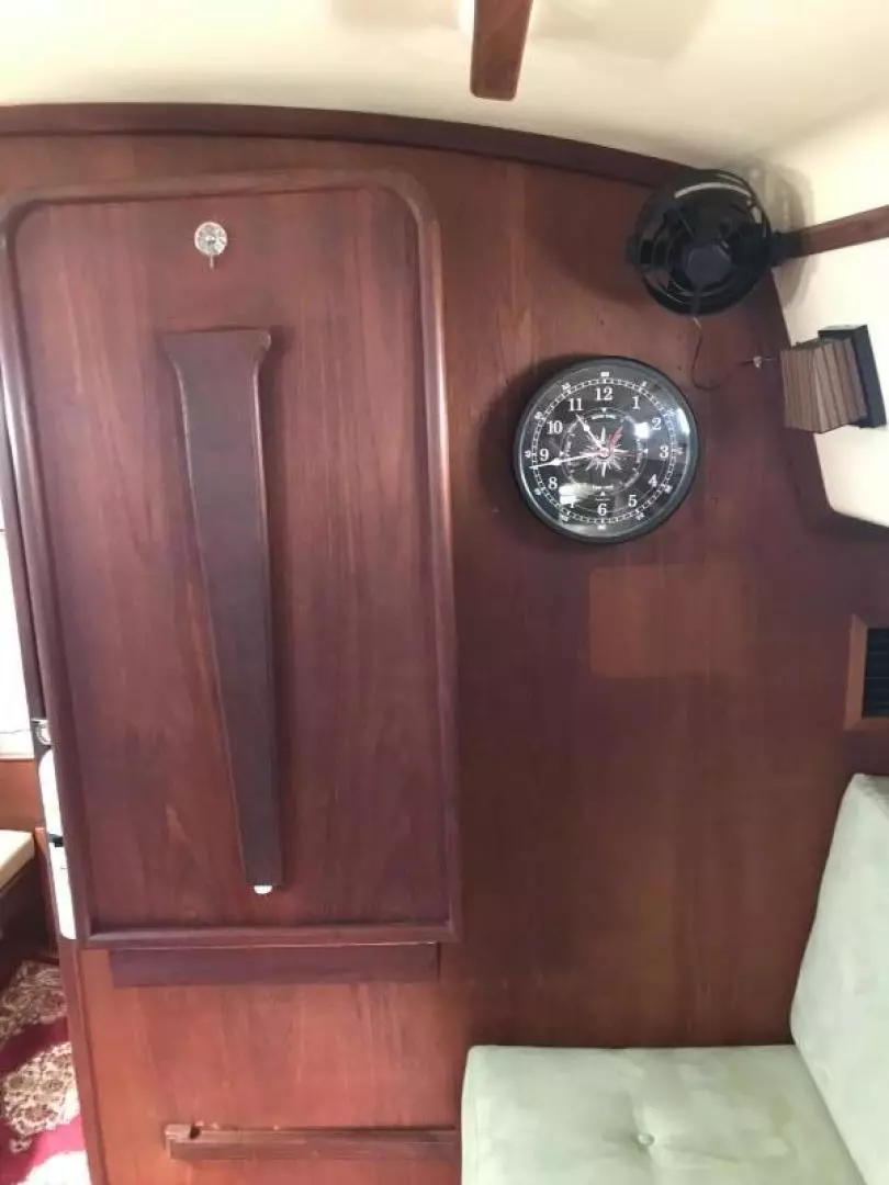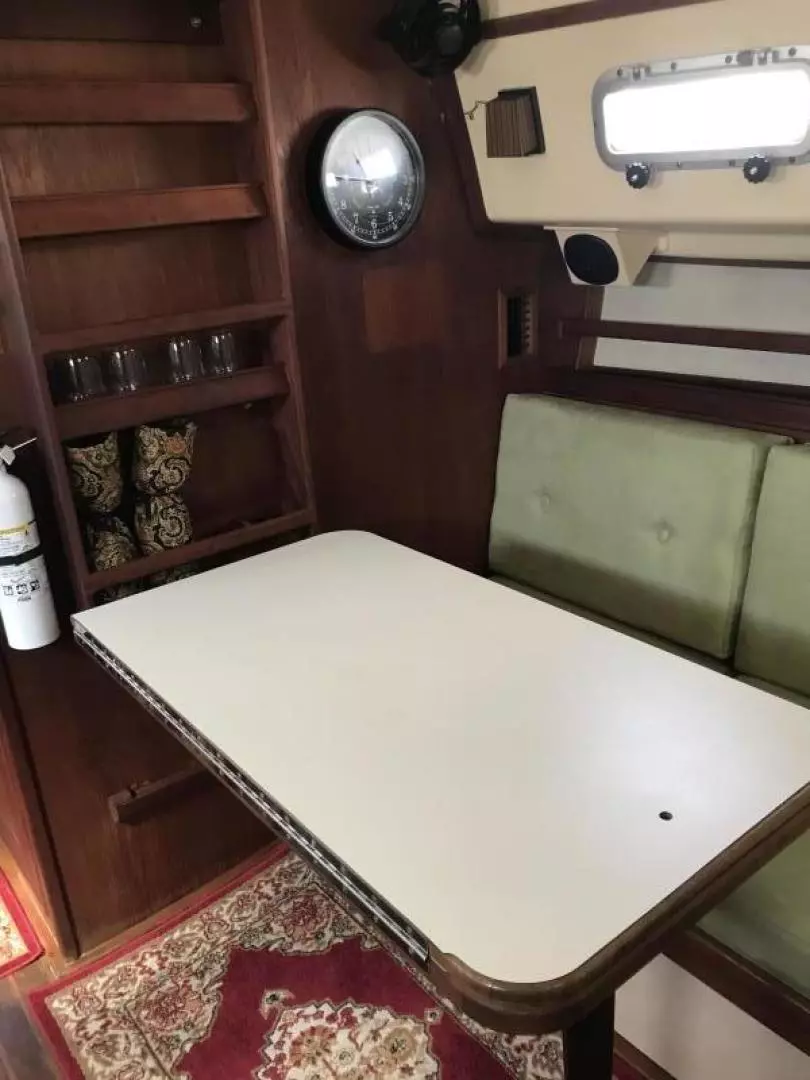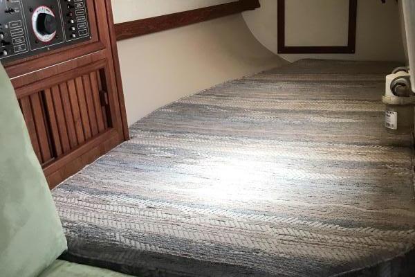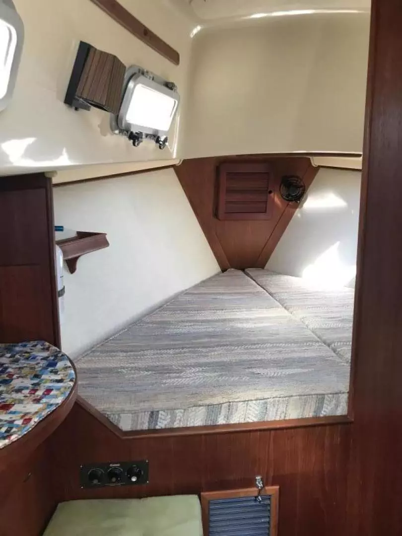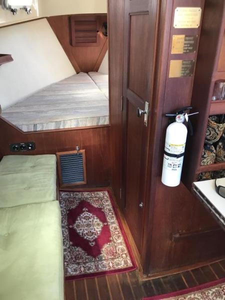 Starting forward there is a large v-berth with opening hatch overhead and opening ports for good ventilation. Next, aft to starboard is the head with Raritan pump, hot and cold pressure water, stainless sink, hanging locker, and shower. Across from the head is a locker. The bulkhead-mounted table and the starboard settee form a slide-out double bunk.