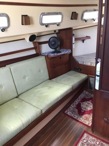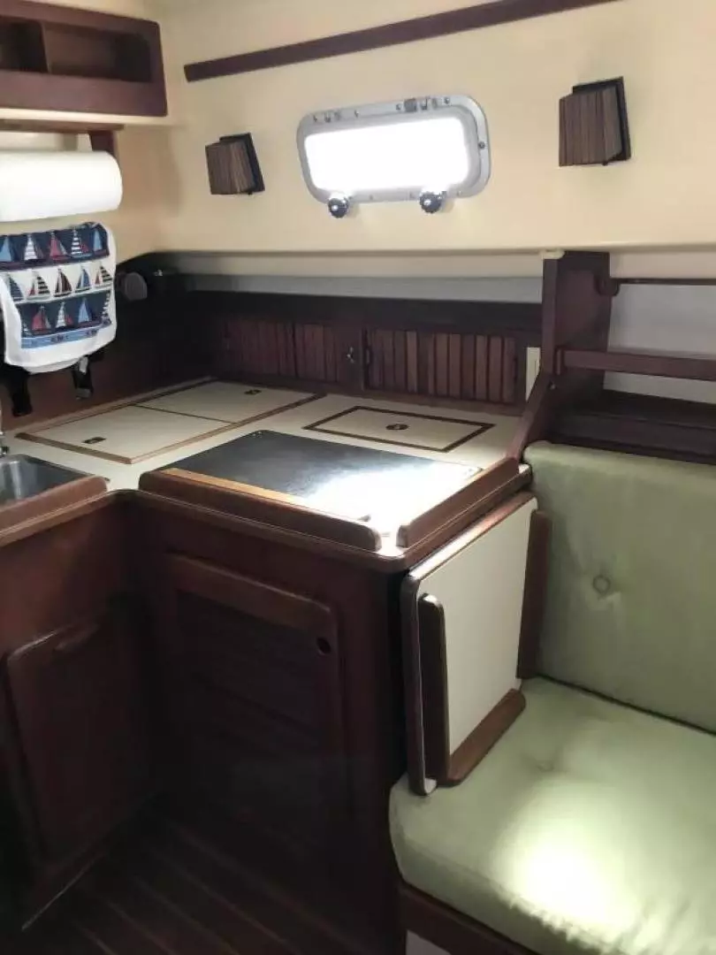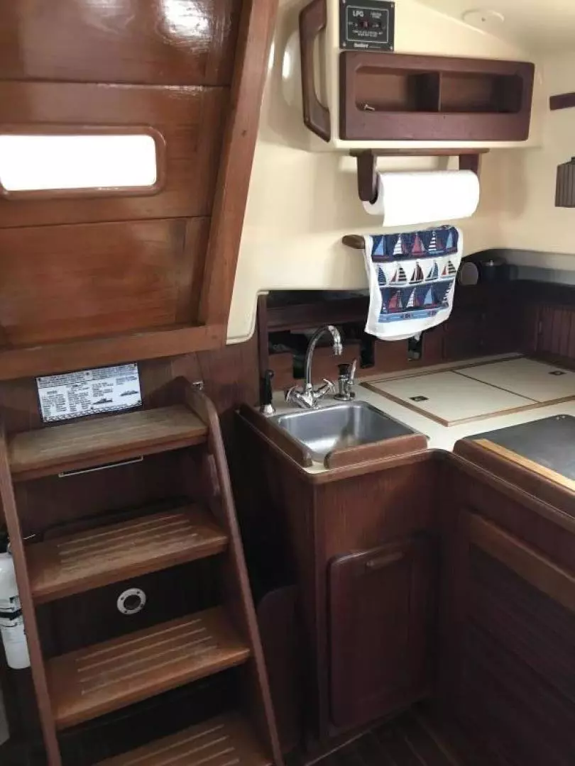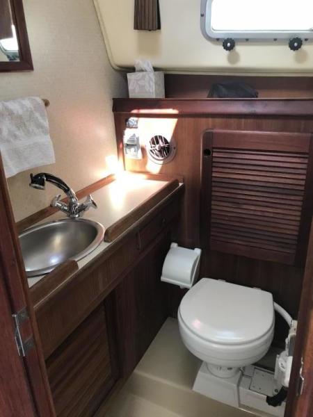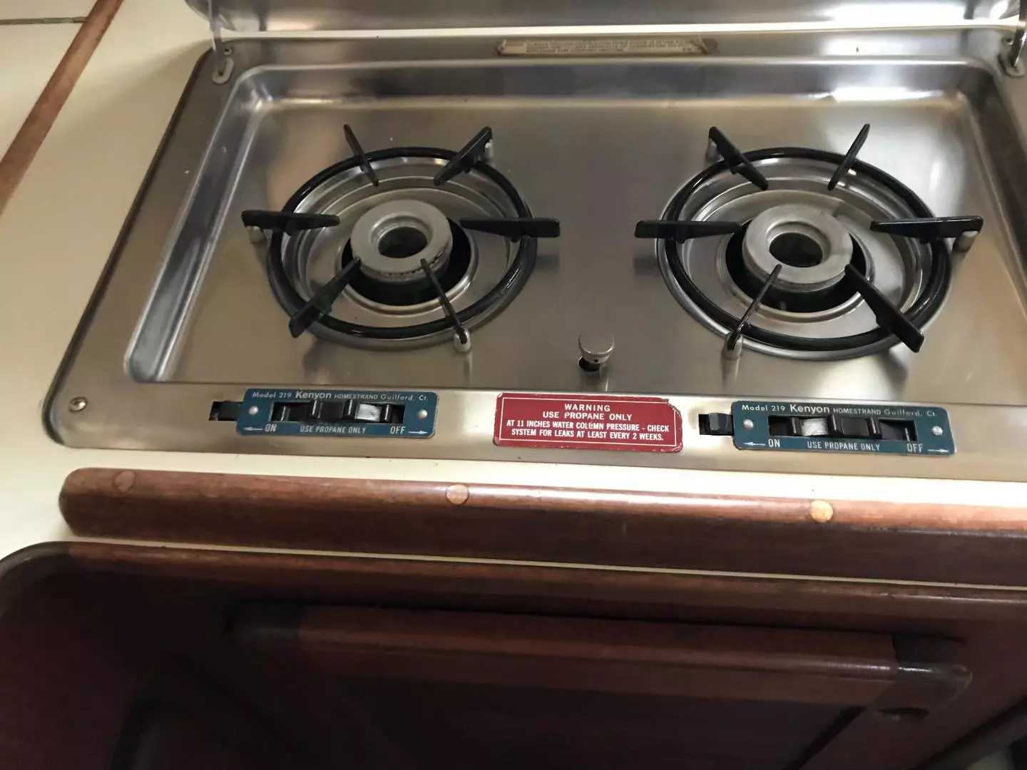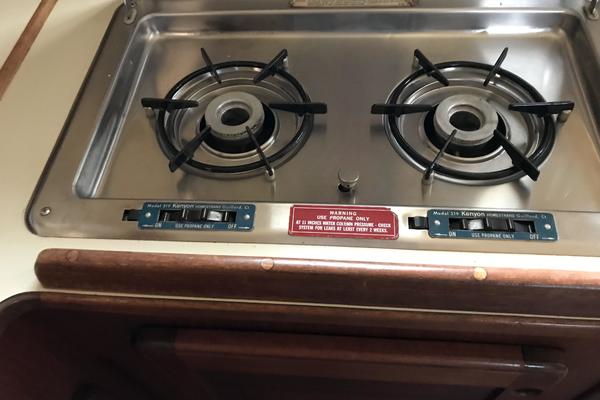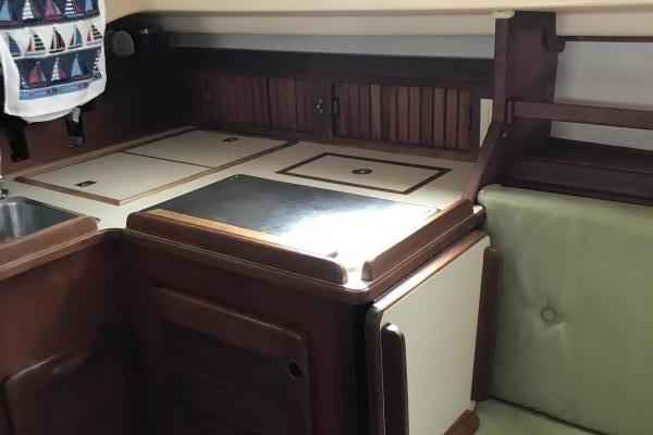 To port of the companionway is the galley which features a single S.S. sink with hot and cold pressure water, a large ice box, 2 burner Kenyon propane stove, Under the stove is a locker for storage, and a GE microwave. There is reverse cycle heat and air plus fresh water and a holding tank.