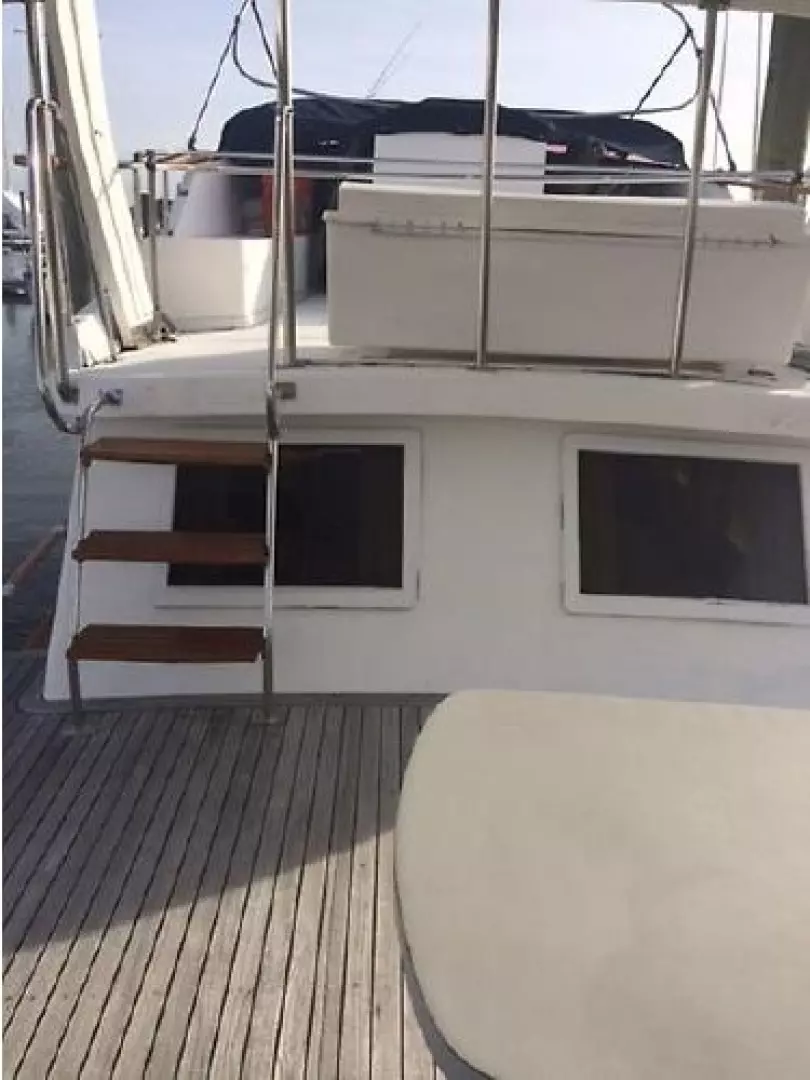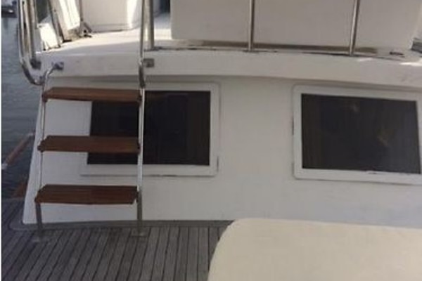 On deck she has extra safe and wide walk-around decks forward with high enough sides to provide a safe passage for moving about on deck. The access to the large hard top covered sun deck aft is by easy steps port and starboard and from there up onto the spacious bridge is a breeze. The mounted manual crane will easily let you load a tender onto the sundeck roof.