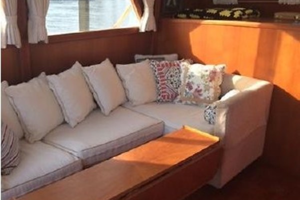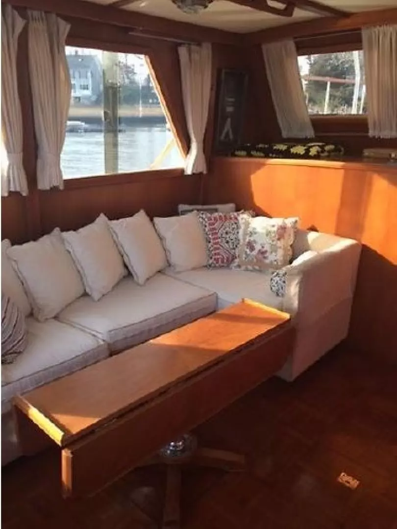 - two steps up to salon with L-shaped settee and hi-lo table. Entertainment center with tv and stereo. Lower helm station is to starboard with a helm seat.