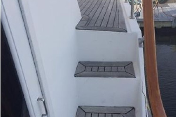 - Aft cabin is down 3 steps with a centered queen island bed. This boat has been customized with with matching teak cabinets/lockers throughout this cabin to better utilize space.
