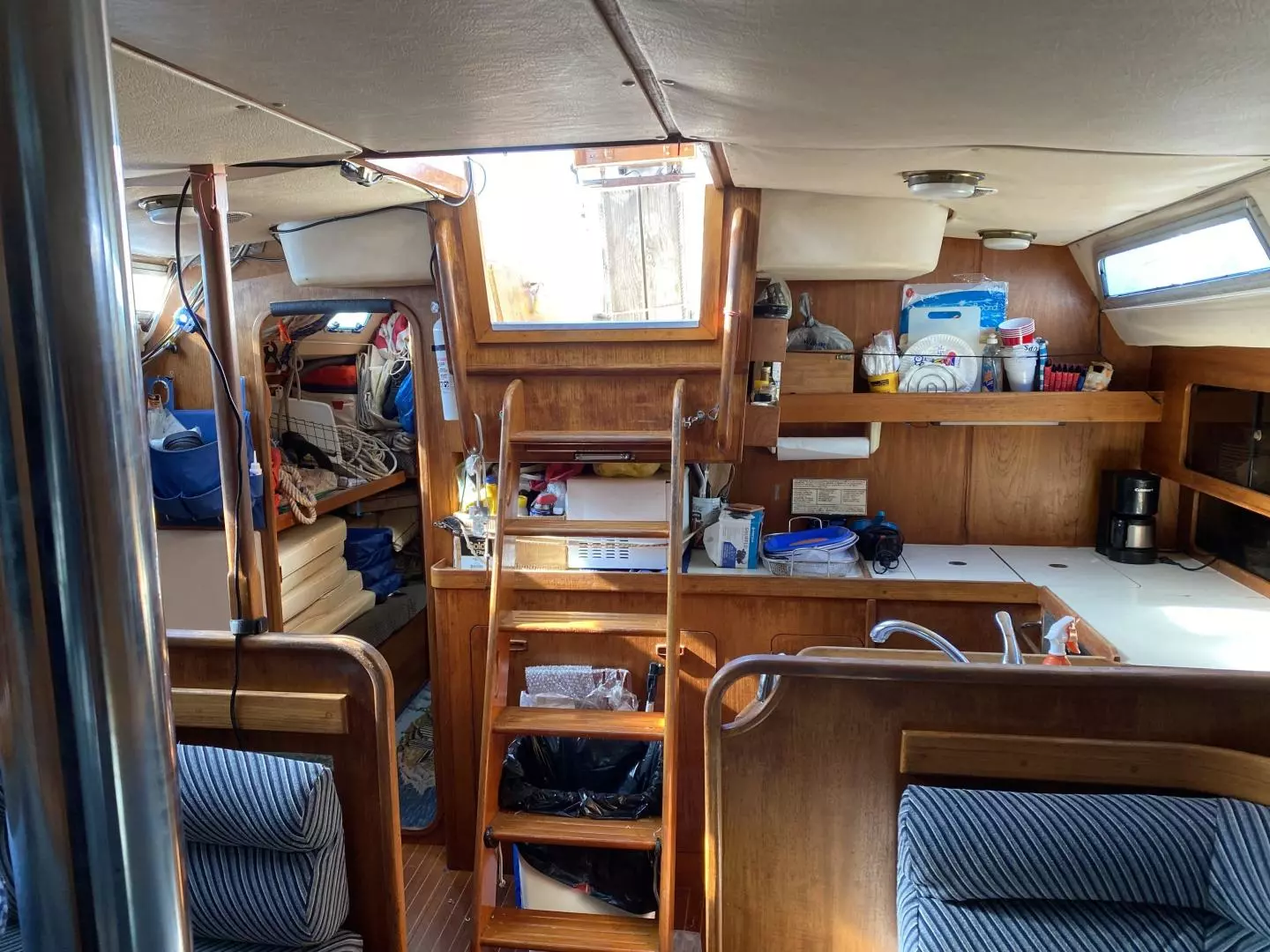 MISTRAL has a 3-cabin layout--fore, quarter and main aft-with a spacious salon, U-shaped galley, navigation station and two heads. Teak interior, teak-and-holly cabin sole, blue striped upholstery.
