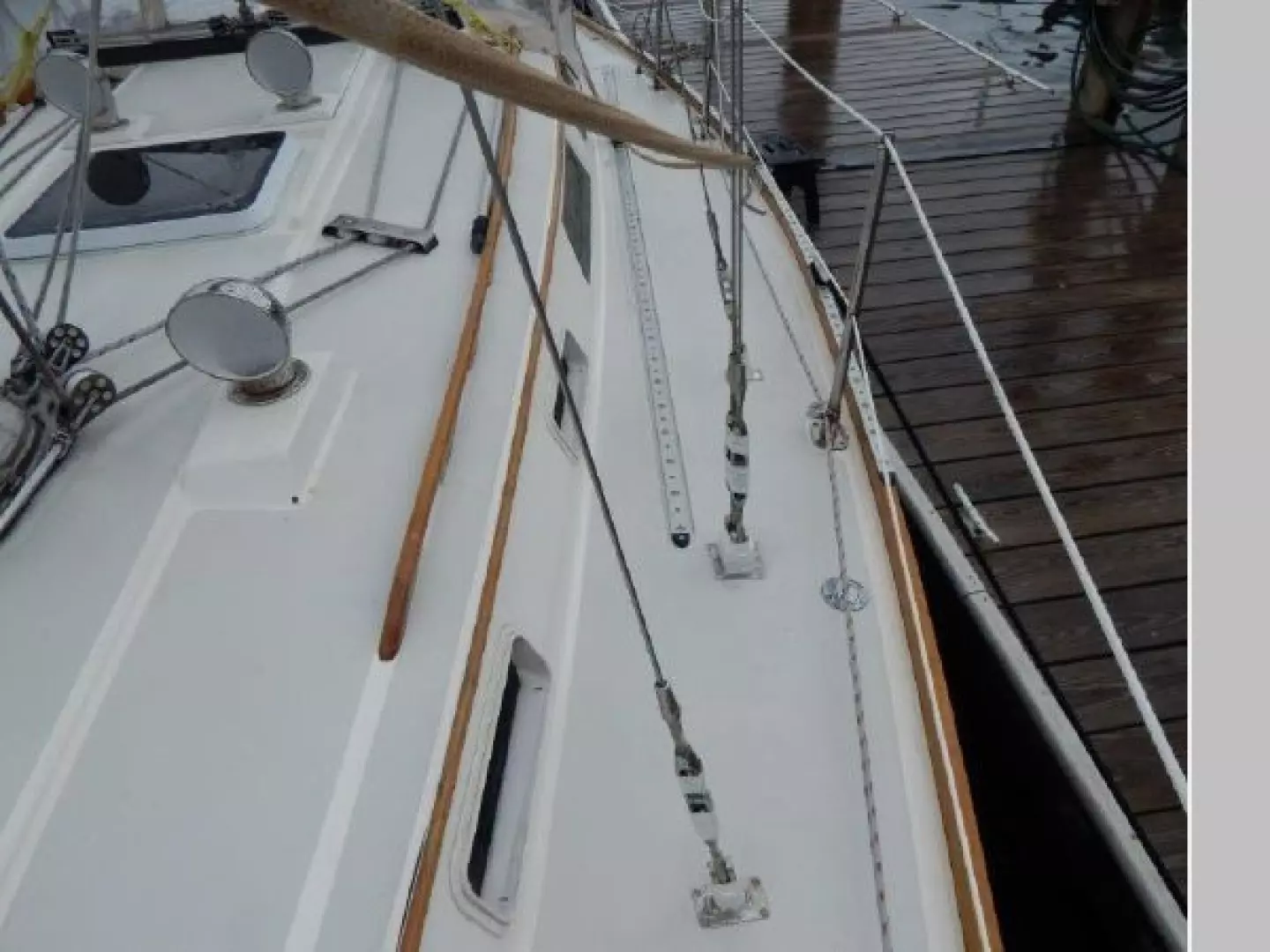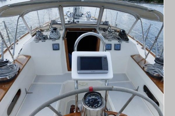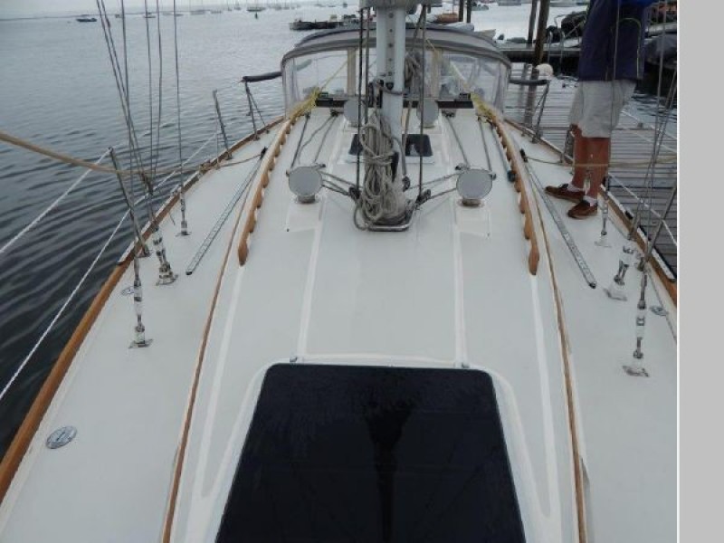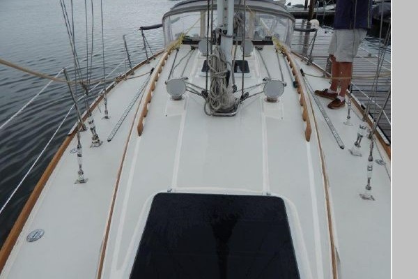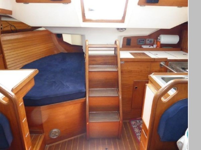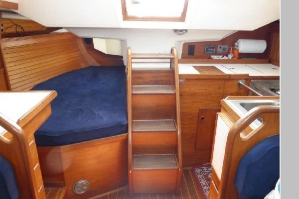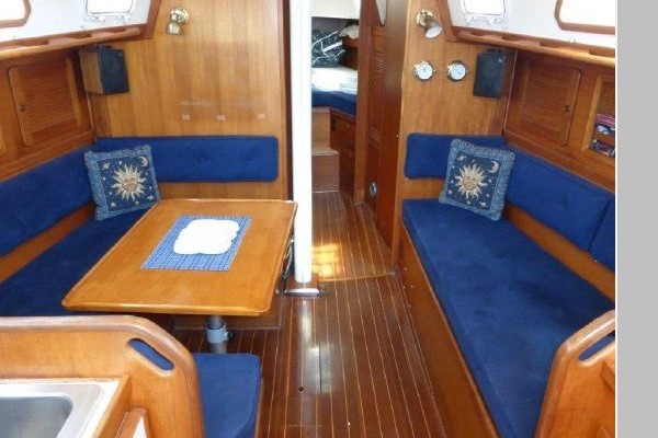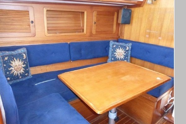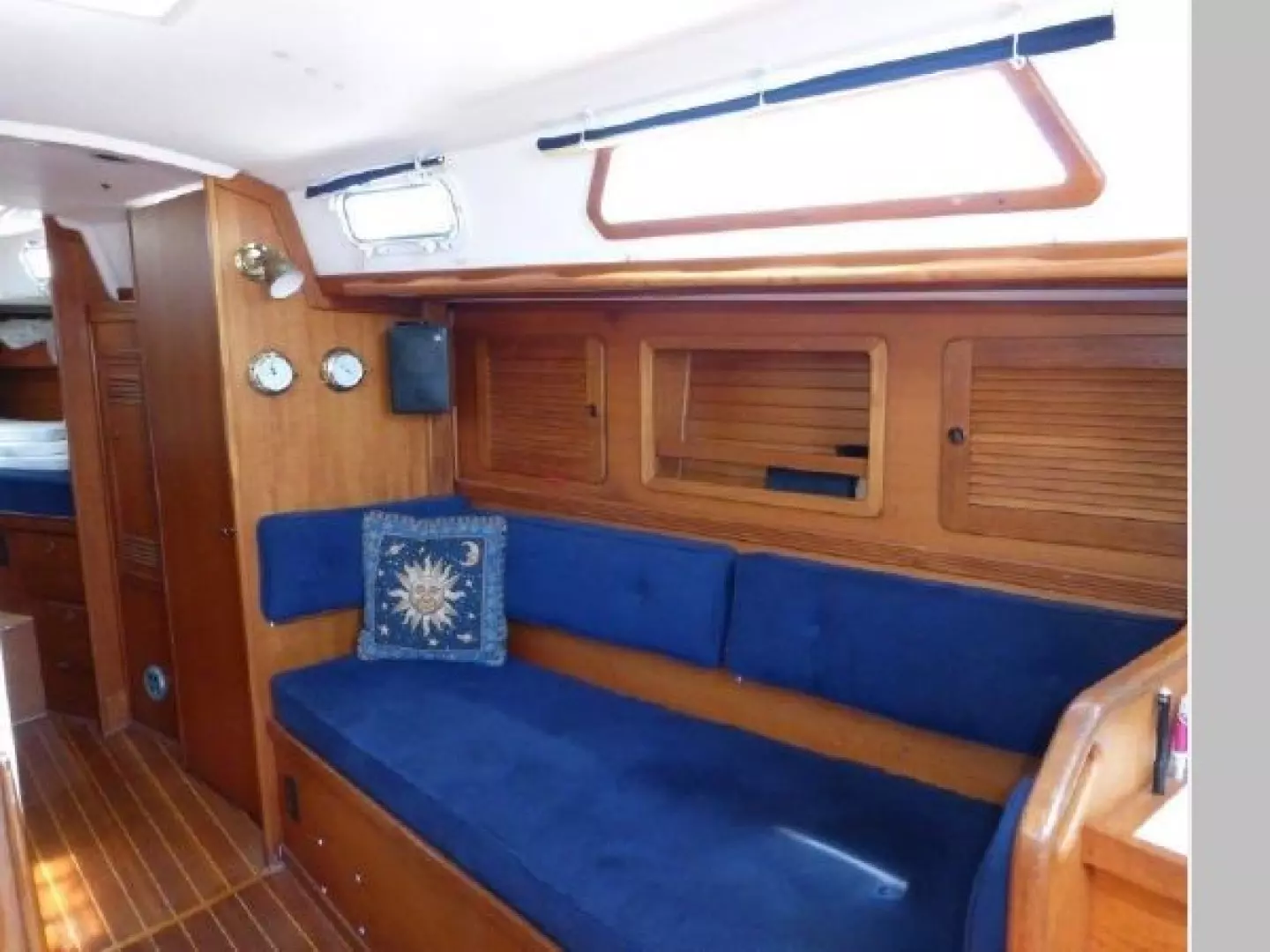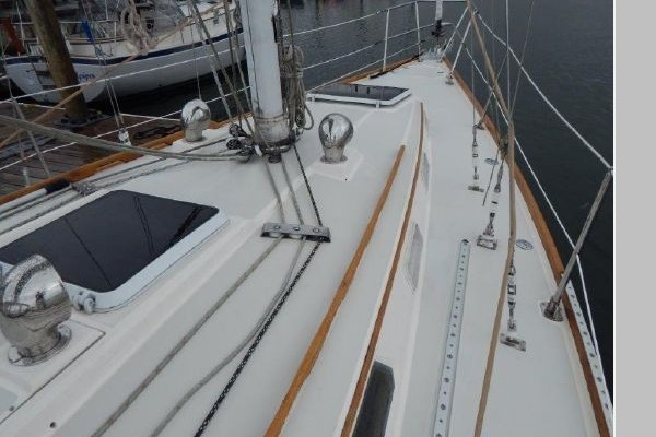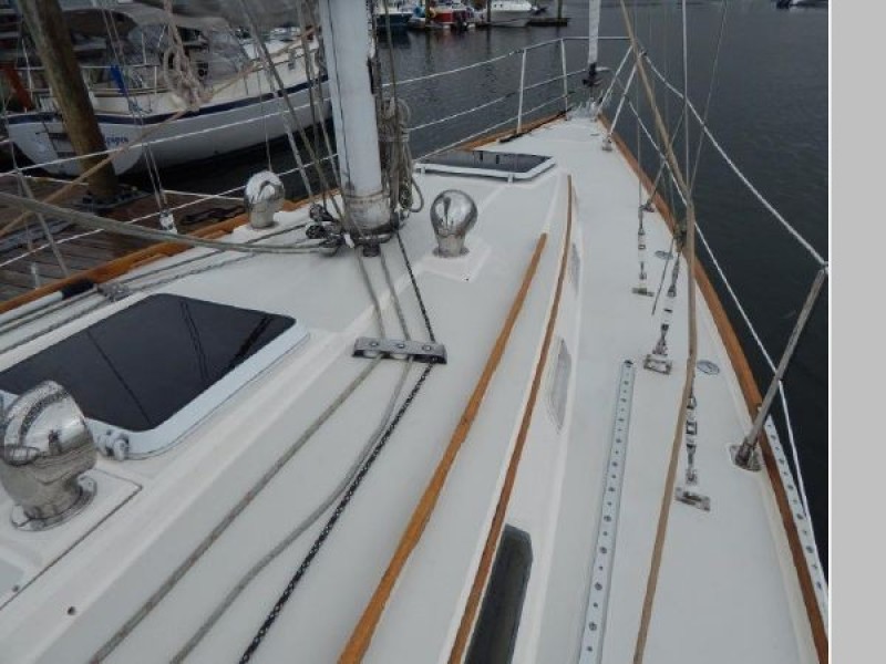 Teak and holly sole throughout, 6 opening ports, 4 fixed light ports and 2 overhead hatches for ventilation and ample light. Beautiful teak interior joiner work, ceilings and cabinetry throughout. Ship Shape cabin shades, hatch and companionway screens.