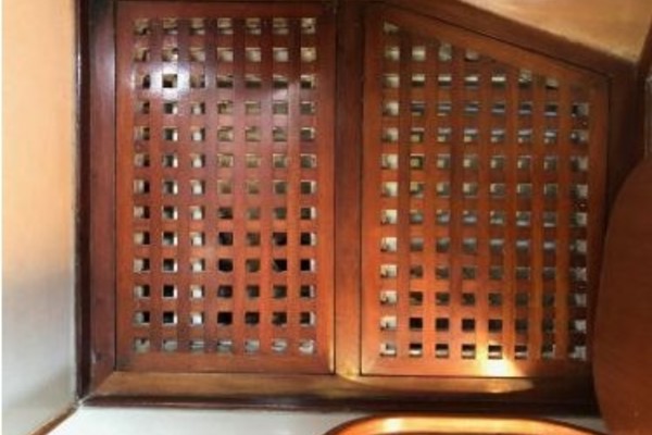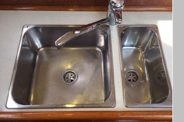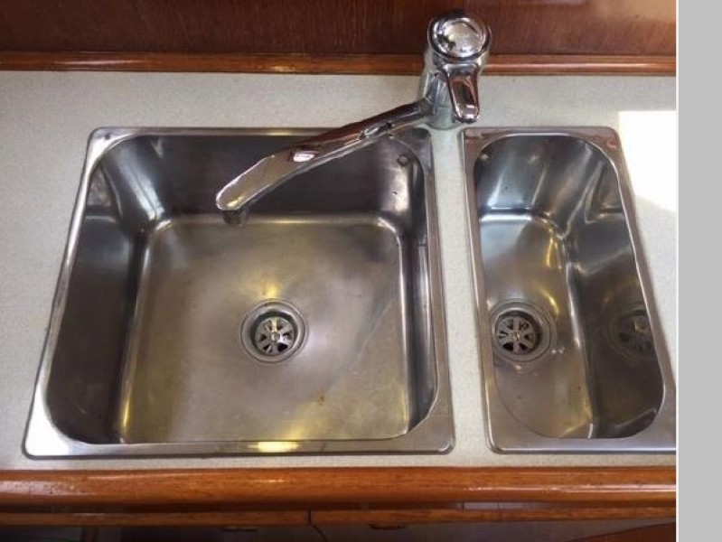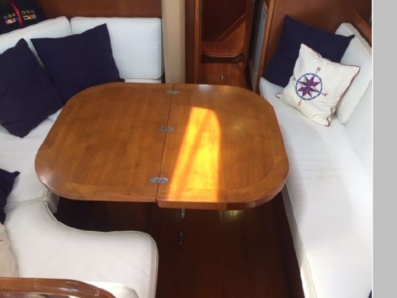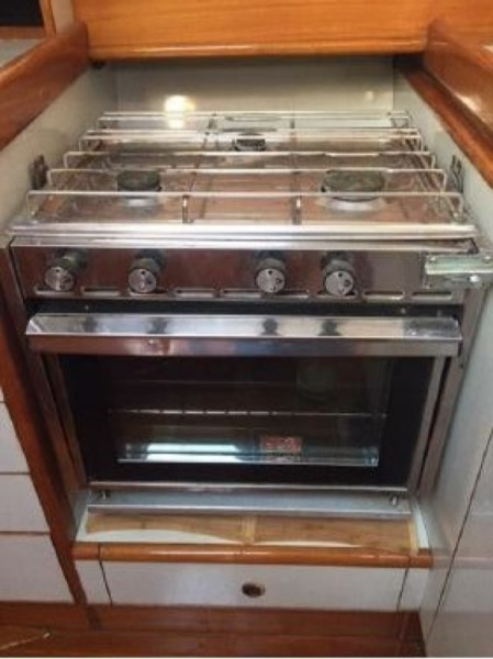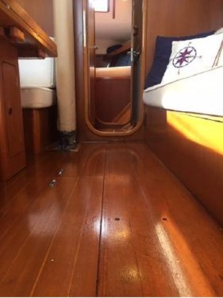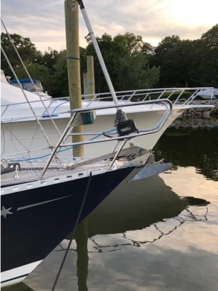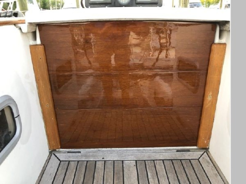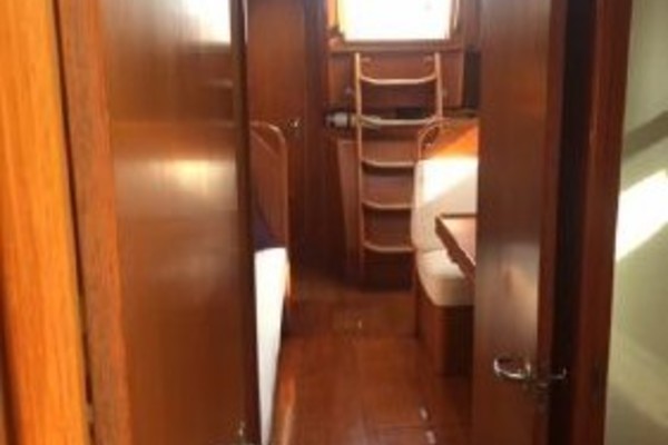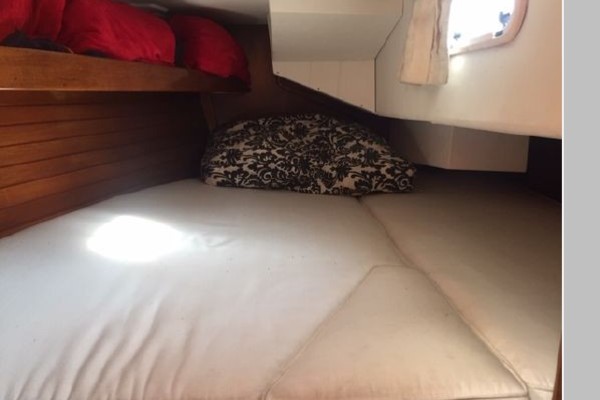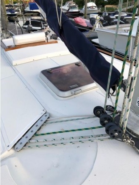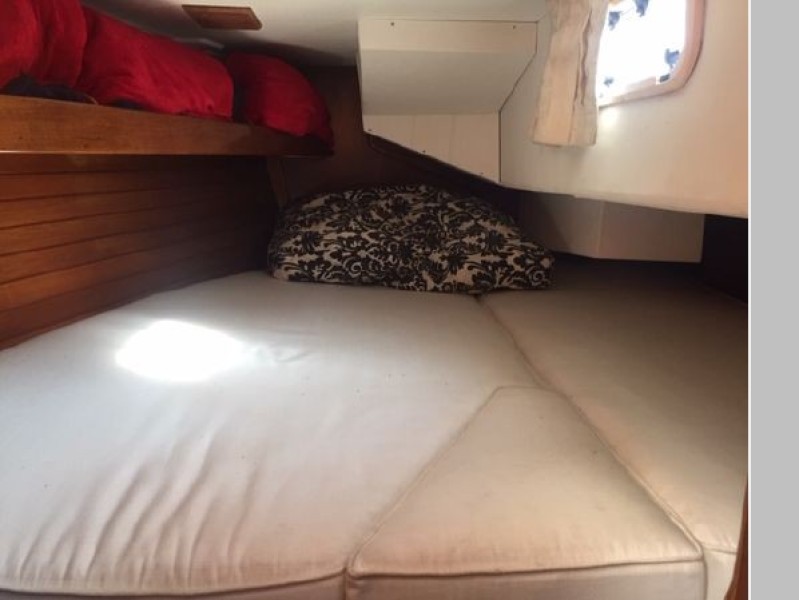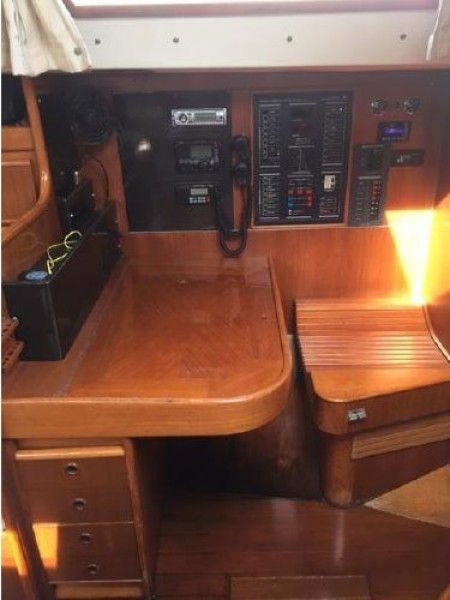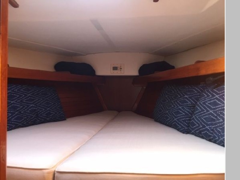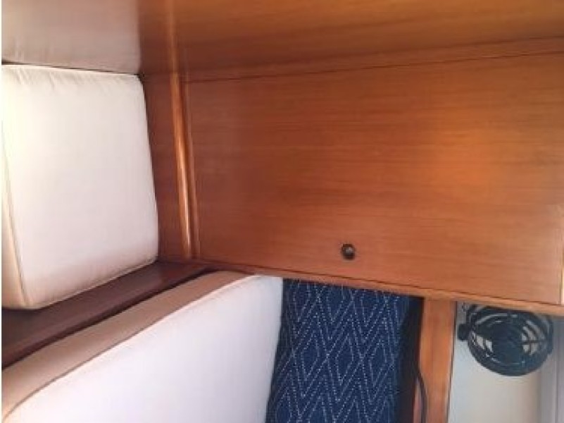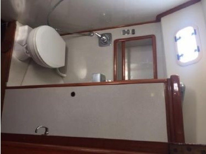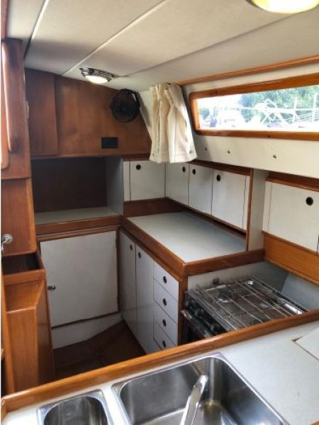 Starting forward, there is a V-berth with twin hanging lockers and a large overhead hatch for light and ventilation. Next aft is a full-beam head with macerating head and shower. A sink and vanity with spacious storage are to starboard and there is a teak grate in the shower. The main salon has a U-shaped dinette to port with a single pilot berth above. To starboard is a settee berth with storage lockers above and outboard. Aft of the settee is a forward facing Nav station with electric panel, VHF and storage beneath the chart table. The L-shaped galley is at the foot of the companionway to port. It is designed for convenient and safe operation underway, and features a double s/s sink, 4-burner propane stove with oven, 12 Volt refrigerator, ice chest, spacious counters and storage. The second stateroom is aft to starboard, with double berth and hanging locker.