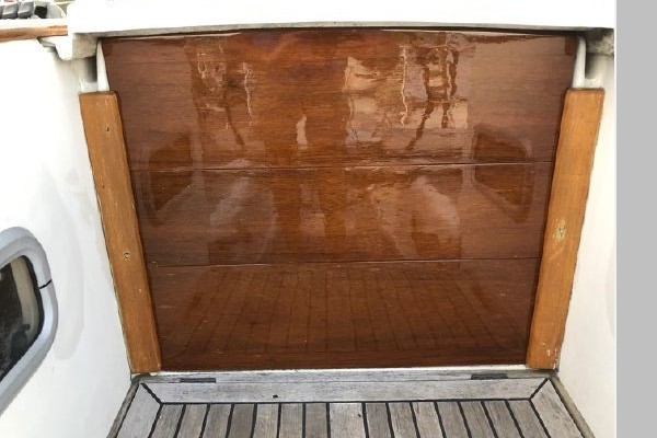 Cut-away reverse transom with two-tiered swim platform (sugar scoop) and custom built 4-rung removable swim ladder.