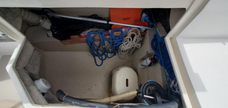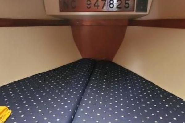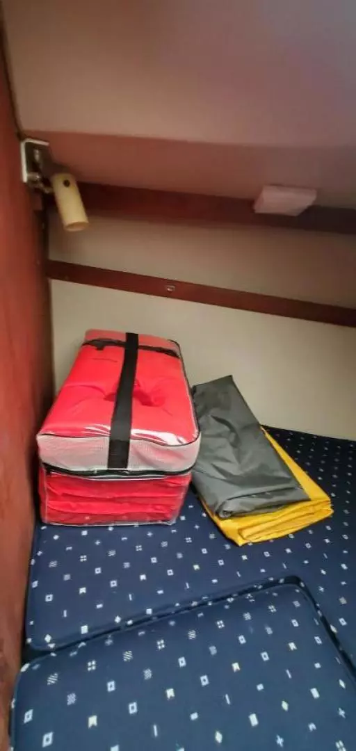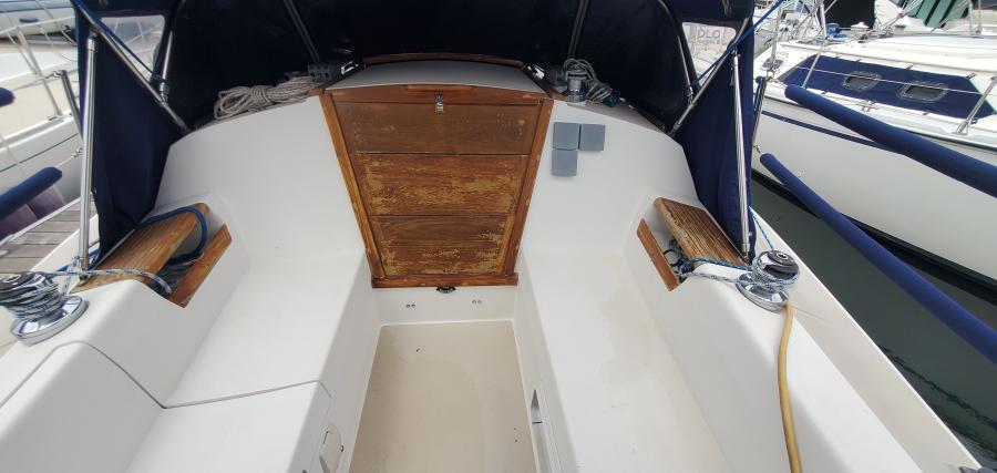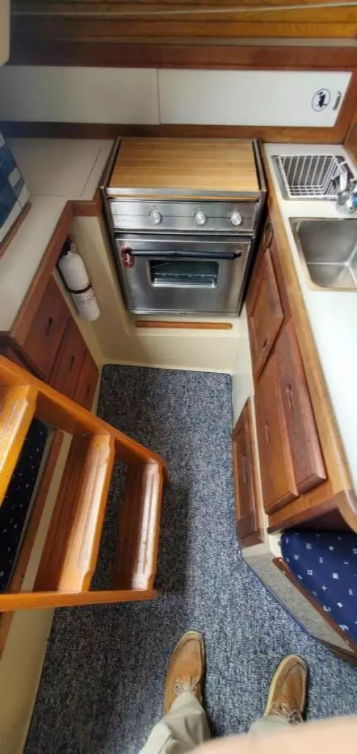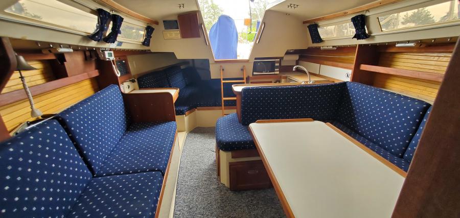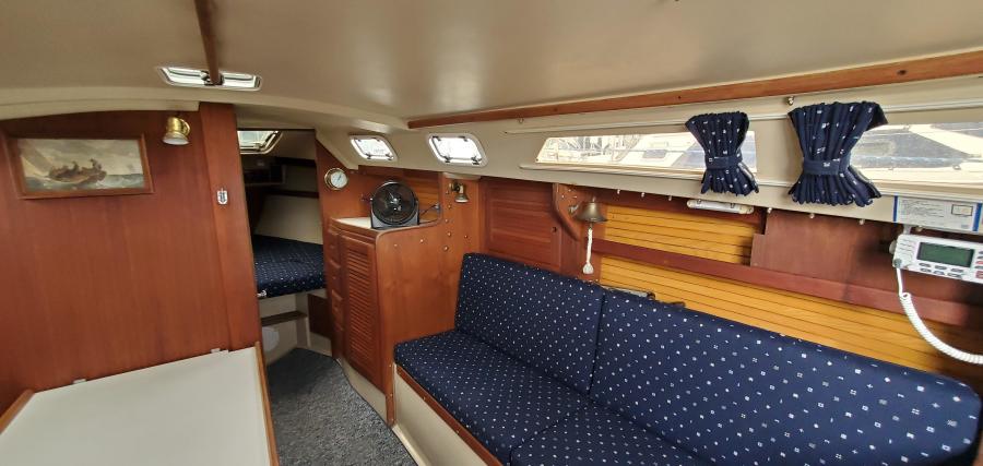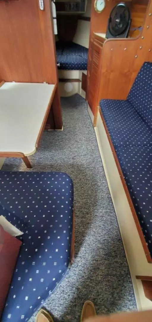 The interior is very nicely appointed, with fresh cushions and matching floor carpeting, while the interior oiled teak is clean and even shows some luster, there are negligible marks from staining.