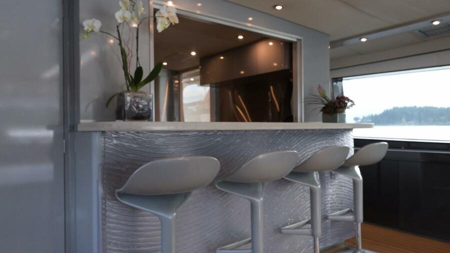 - Bar - Tall bar with white-grey Corian countertop, with 4 stools. Has a 3Form polycarbonate resin translucent decorative panel that looks like a wave. The bar opens into the galley, but a removable partition can be inserted to separate the galley from the salon. The counter can be used by the galley to prep food or serve hors-d'oeuvreo or a buffet meal.