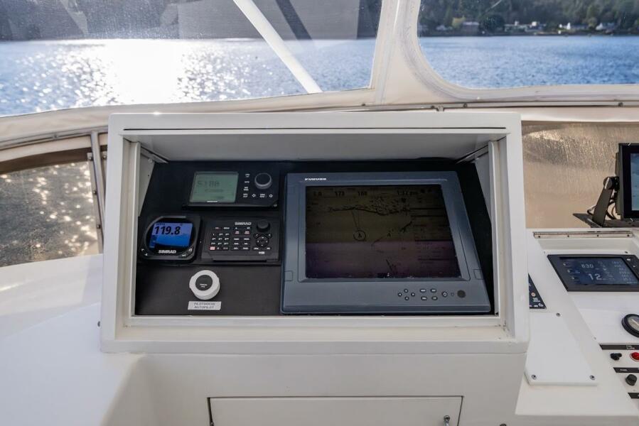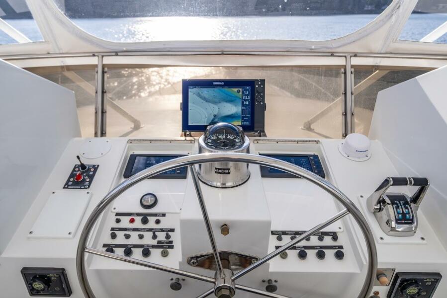 The lower helm is forward of the salon and galley. It can be accessed externally from port and starboard. There is a settee, helm seat and a complete helm station with modern electronics. The flybridge can be accessed via external steps from both port and starboard.