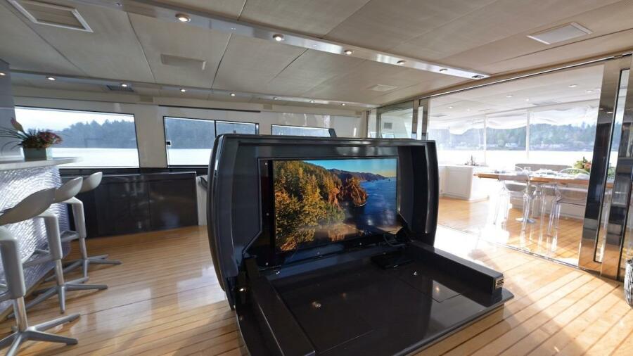 From the cockpit, you reach the main-deck level California deck, a flexible space for lounging and indoor/outdoor dining. There is a bar to the right, and a settee with a large table. Enclosed with removable acrylic panels that has both air conditioning and heating.