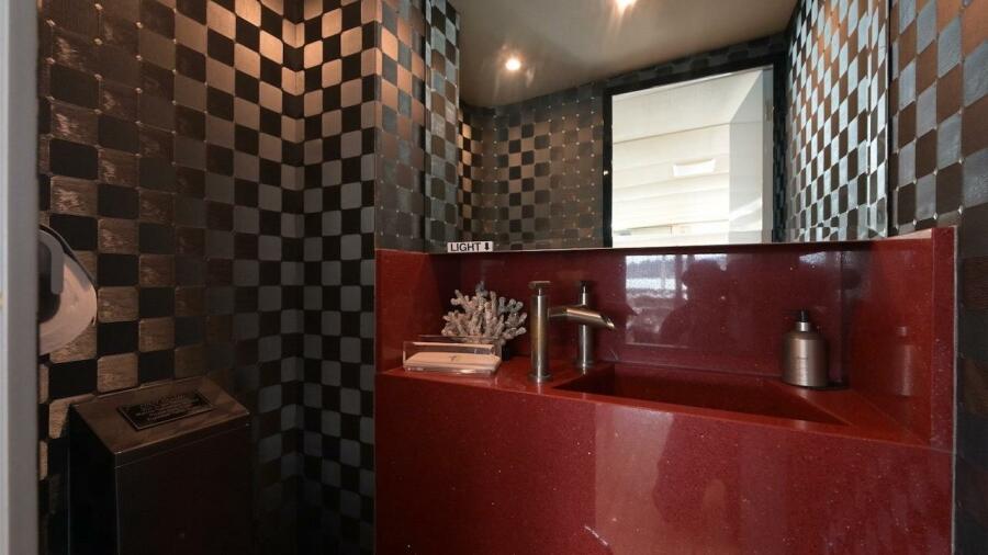 - Vanity – One piece of red Corian with metal flecks, stainless steel faucet