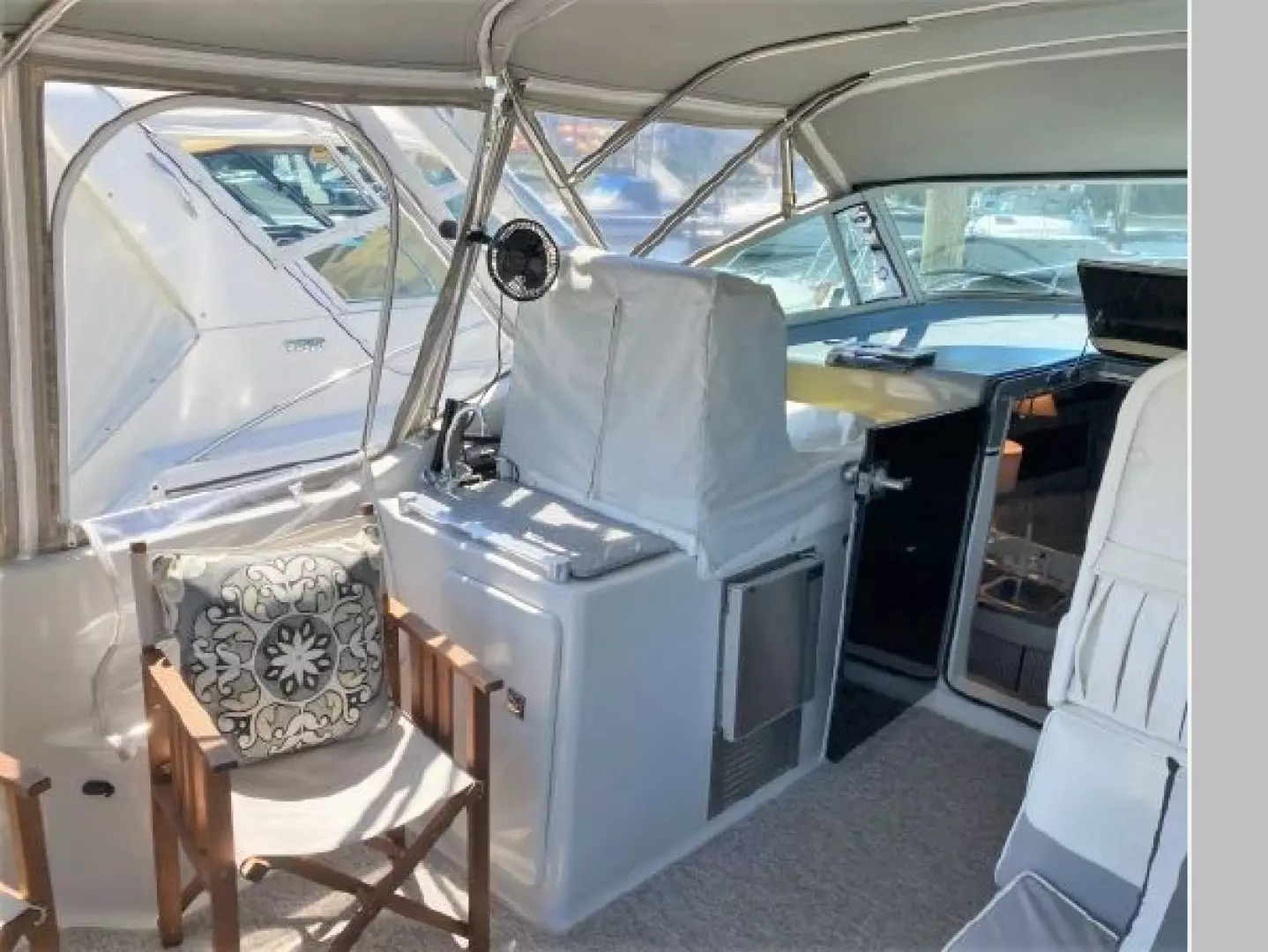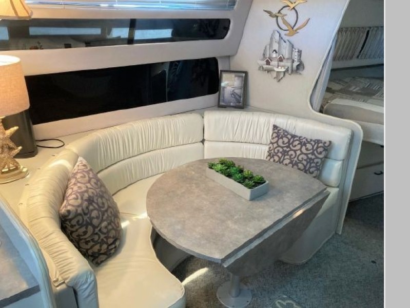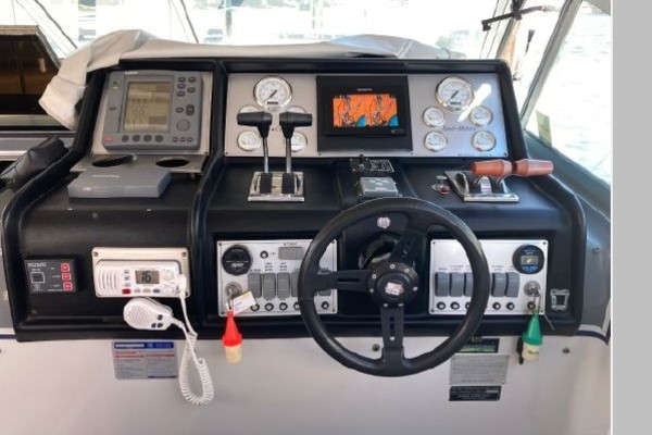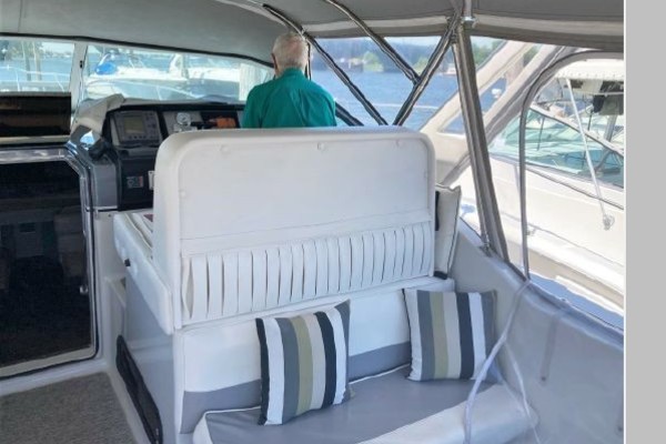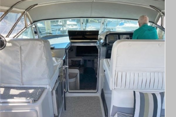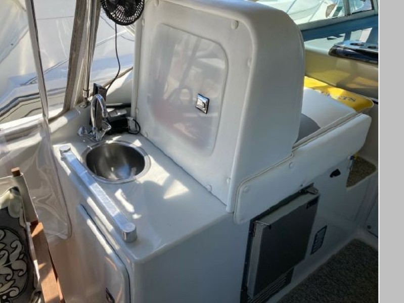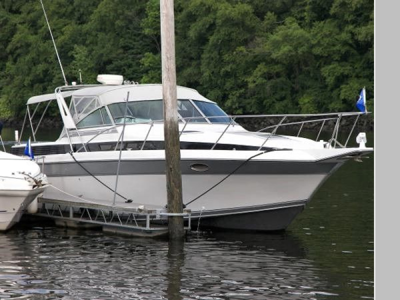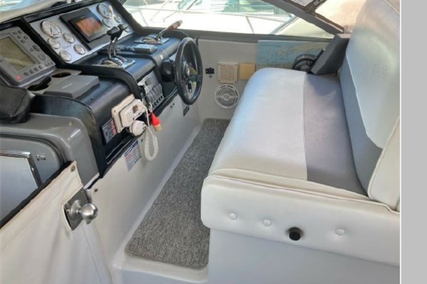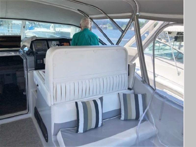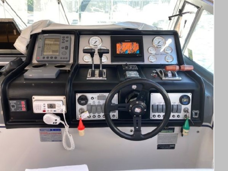 New July listing this Chris-Craft 370 Amerosport is very clean. The roomy contemporary interior has a forward V-berth and a private mid-cabin that sleeps two. In between is a convertible dinette, an enclosed head with shower and a full galley. There is abundant outside seating in the spacious cockpit which is fully protected by a full camper enclosure. Equipped with anchor windlass, GPS chartplotter, depth finder and VHF radio. Powered by T-454ci Crusader V-drive inboards.