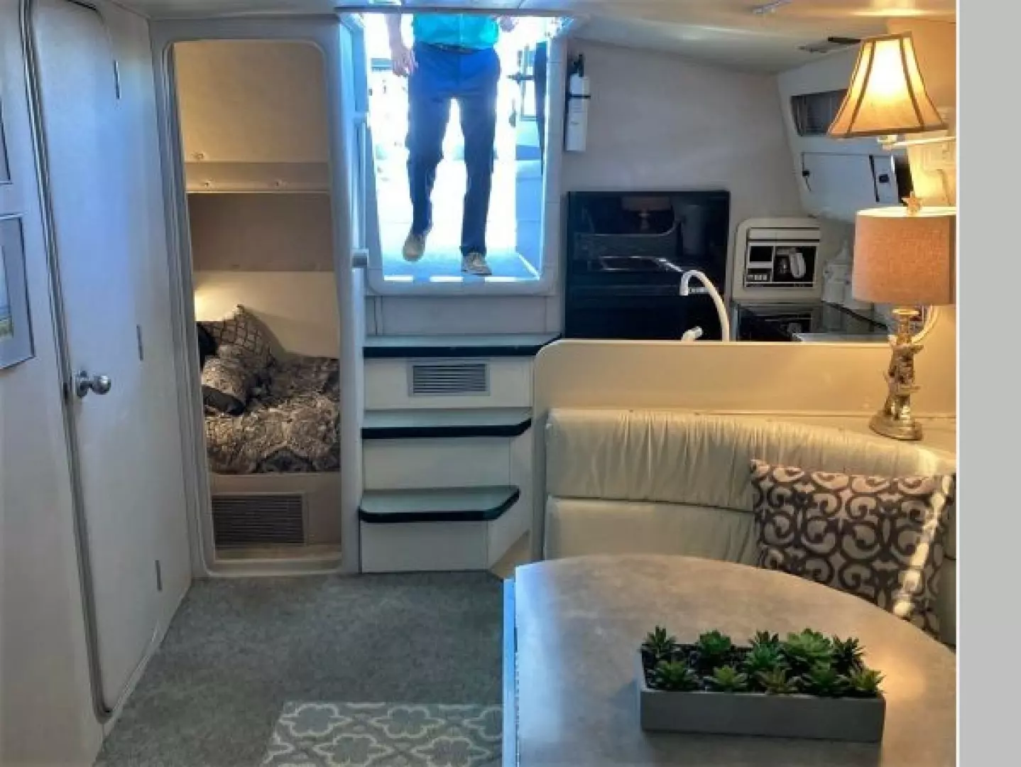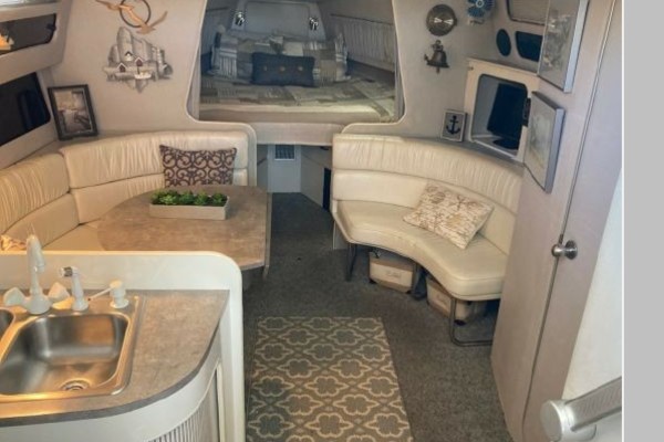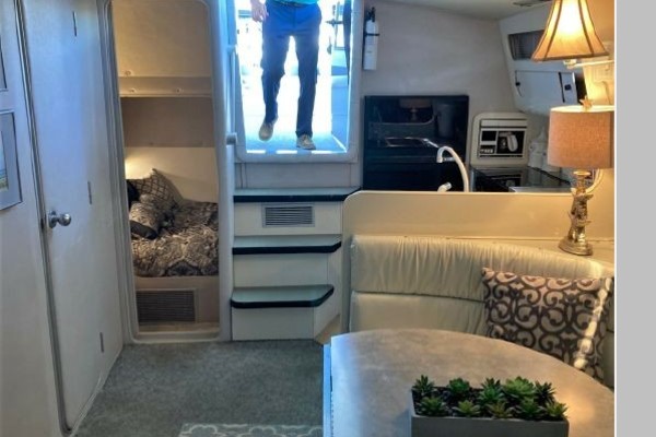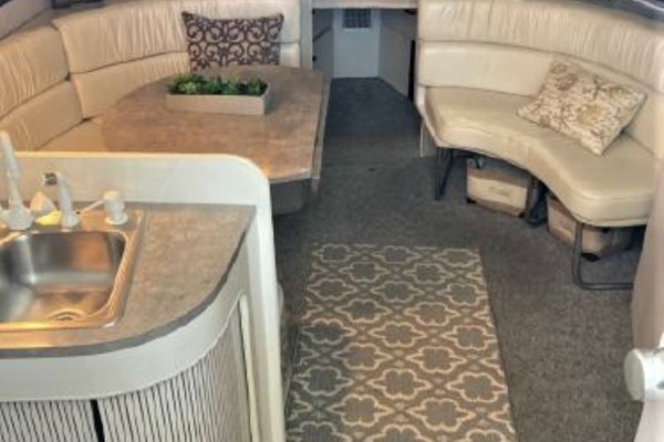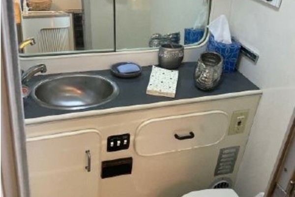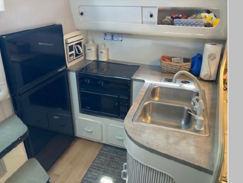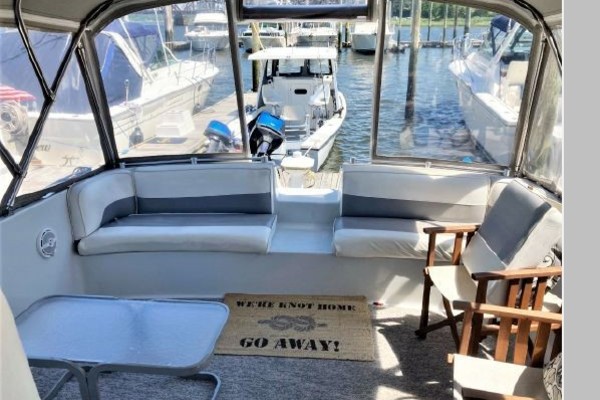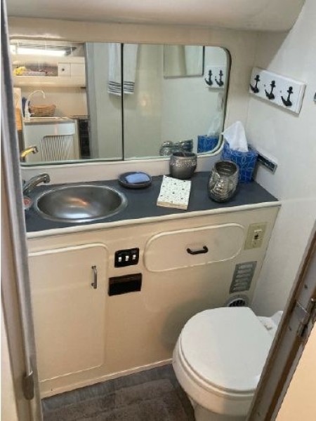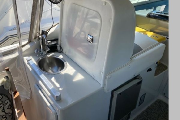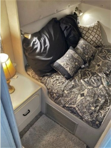 New July listing this Chris-Craft 370 Amerosport is very clean. The roomy contemporary interior has a forward V-berth and a private mid-cabin that sleeps two. In between is a convertible dinette, an enclosed head with shower and a full galley. There is abundant outside seating in the spacious cockpit which is fully protected by a full camper enclosure. Equipped with anchor windlass, GPS chartplotter, depth finder and VHF radio. Powered by T-454ci Crusader V-drive inboards.