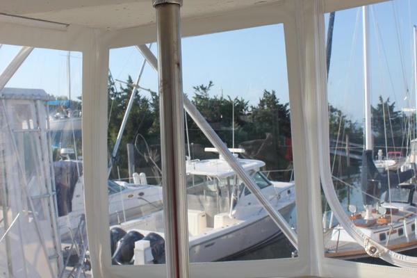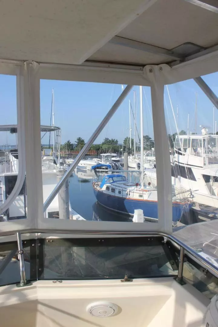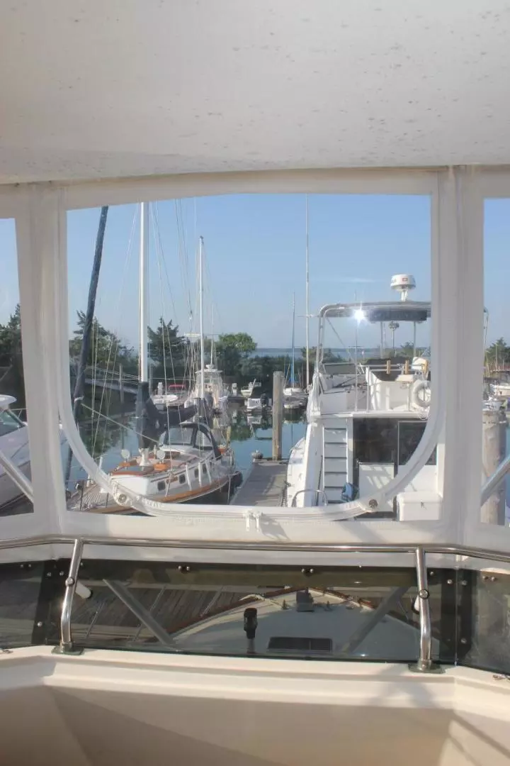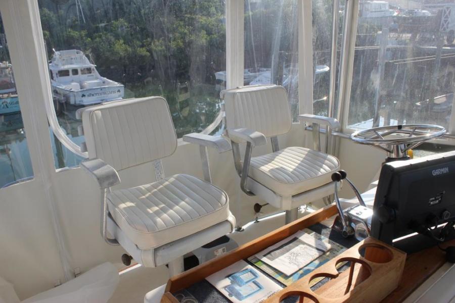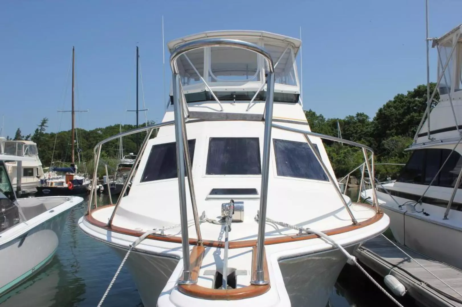 Wanderer is the popular two-stateroom model with the galley in the salon. Many say she has striking good looks. Her interior teak is nicely done and she is a very fishable boat with a large cockpit and good fore and aft sightlines from the flybridge. She has an Onan Genset with low hours and is powered by T-350 HP Mercruiser 454s with 1000 hours. She is located in Southold NY.