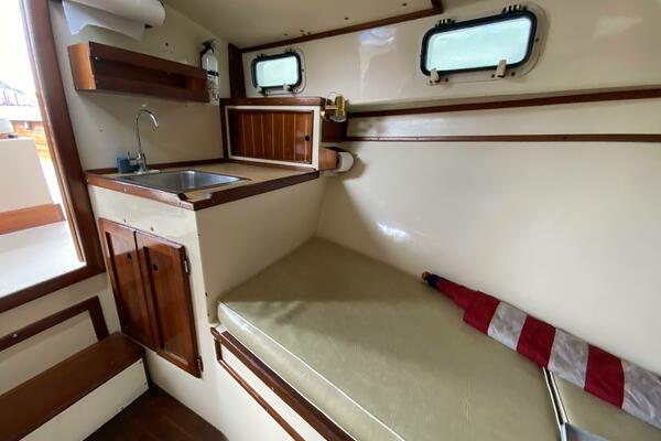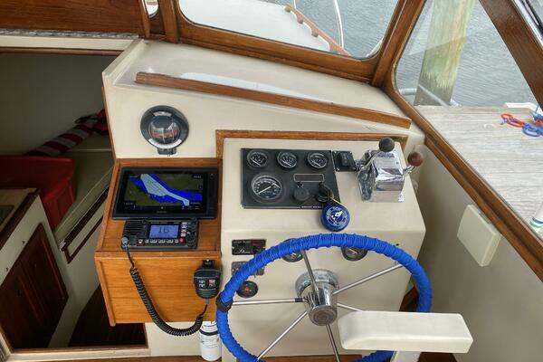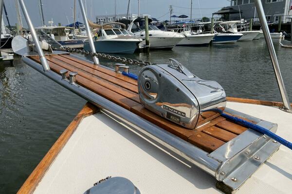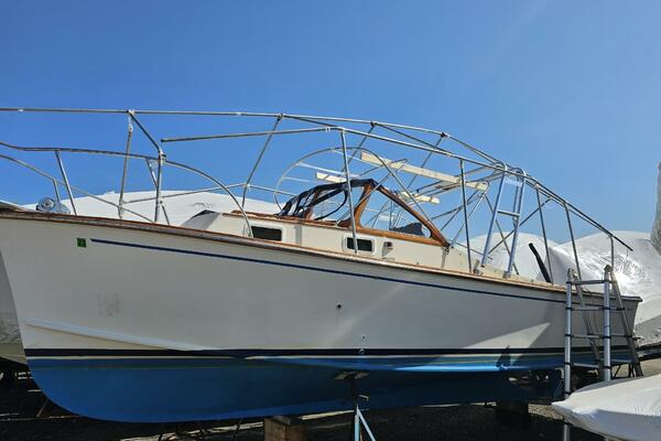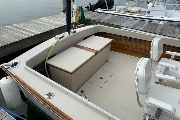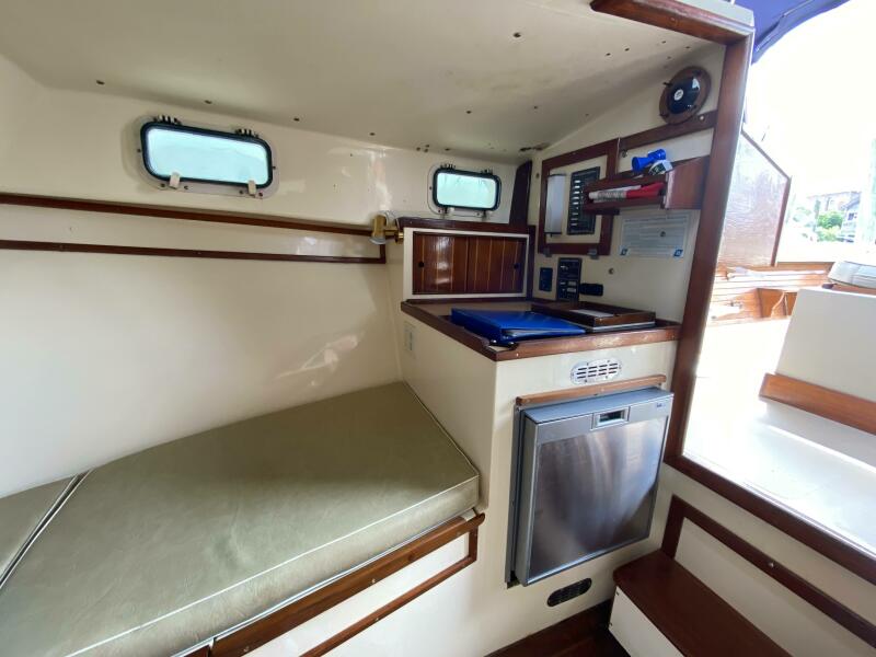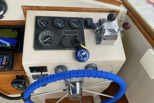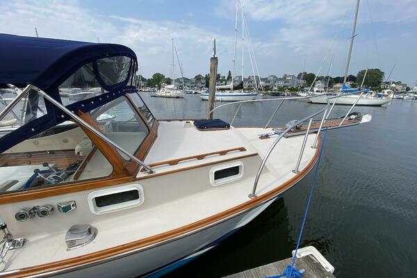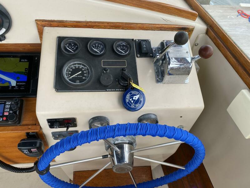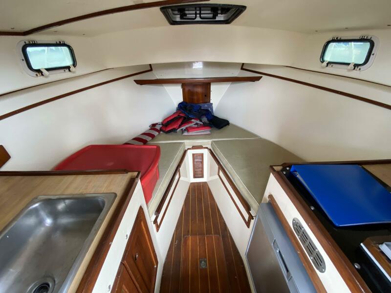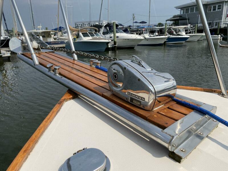 With a traditional keel and skeg, Core-Cell foam in the deck and hull, and modern cabin amenities RUNNER makes an excellent fishing or family boat. She has just been completely re-fit and upgraded including engine and exhaust systems, canvas and radar arch, electronics, batteries, windlass, head, and lighting. Additionally, she has a beautiful custom-made tiller and “vintage” Fortier cockpit boxes.