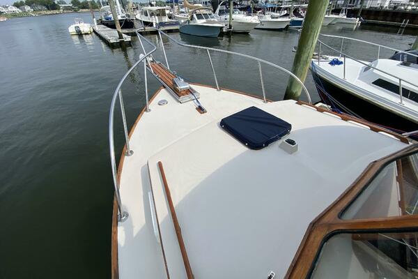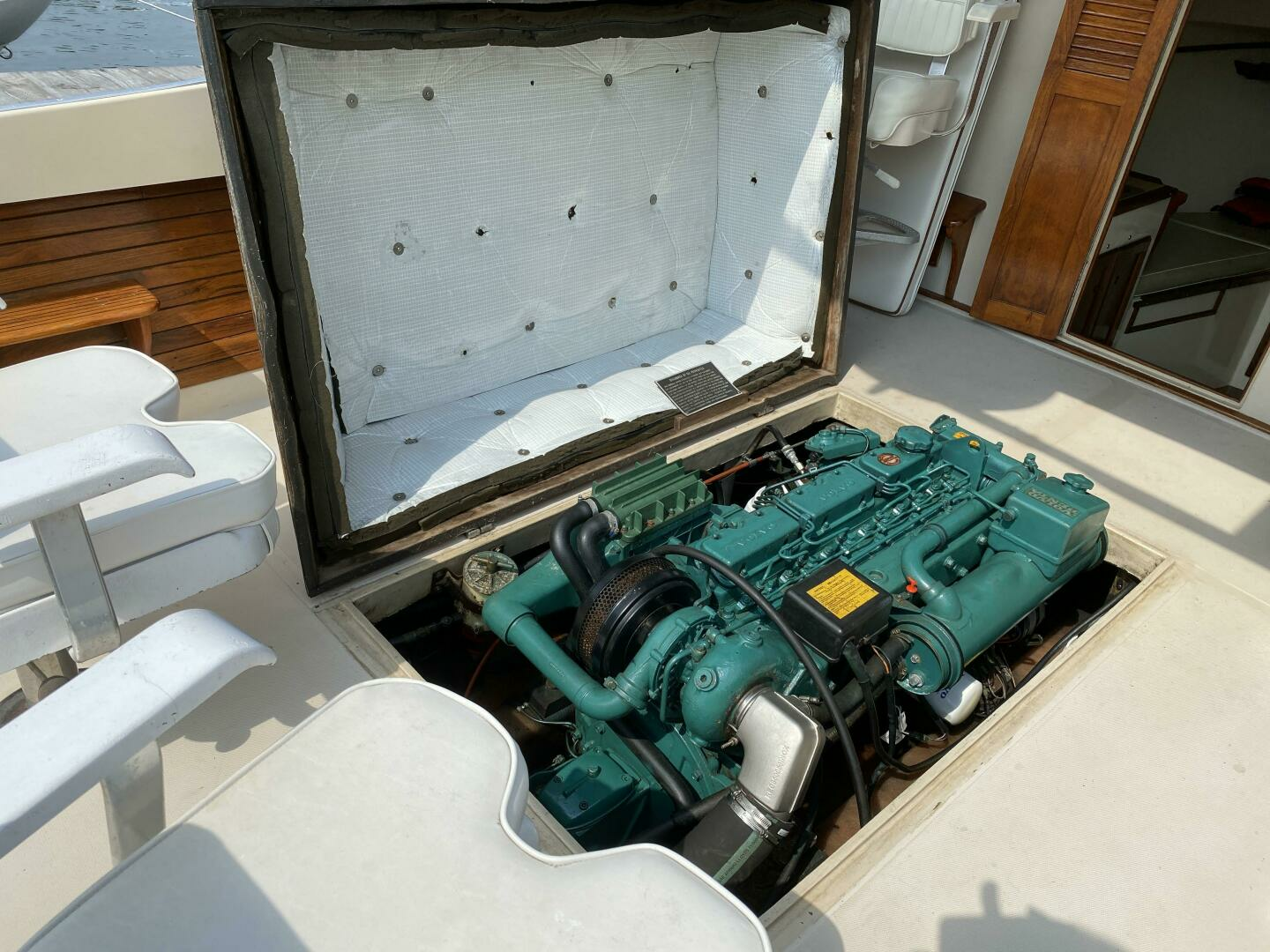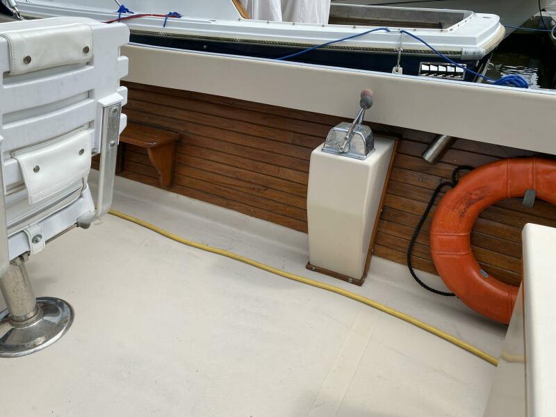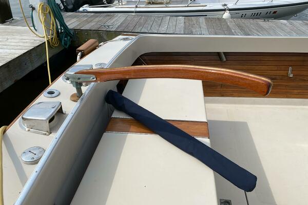 - Teak-framed windshield, footrests, hatch door, toe rail, trim