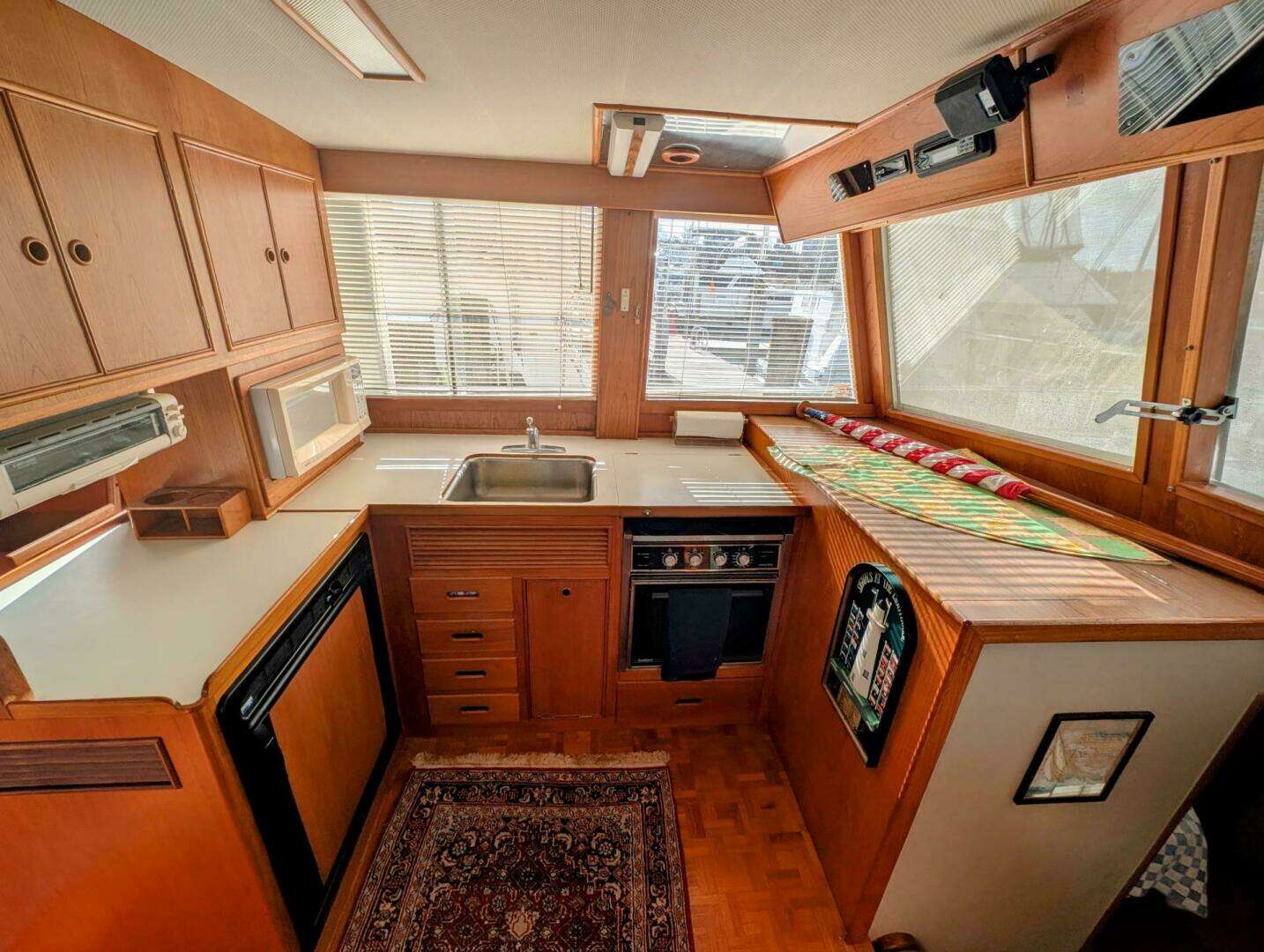 - Galley: The galley is an L-shaped "up" configuration to port, featuring a sink, oven, electric stove, deep freezer, and generous storage.
