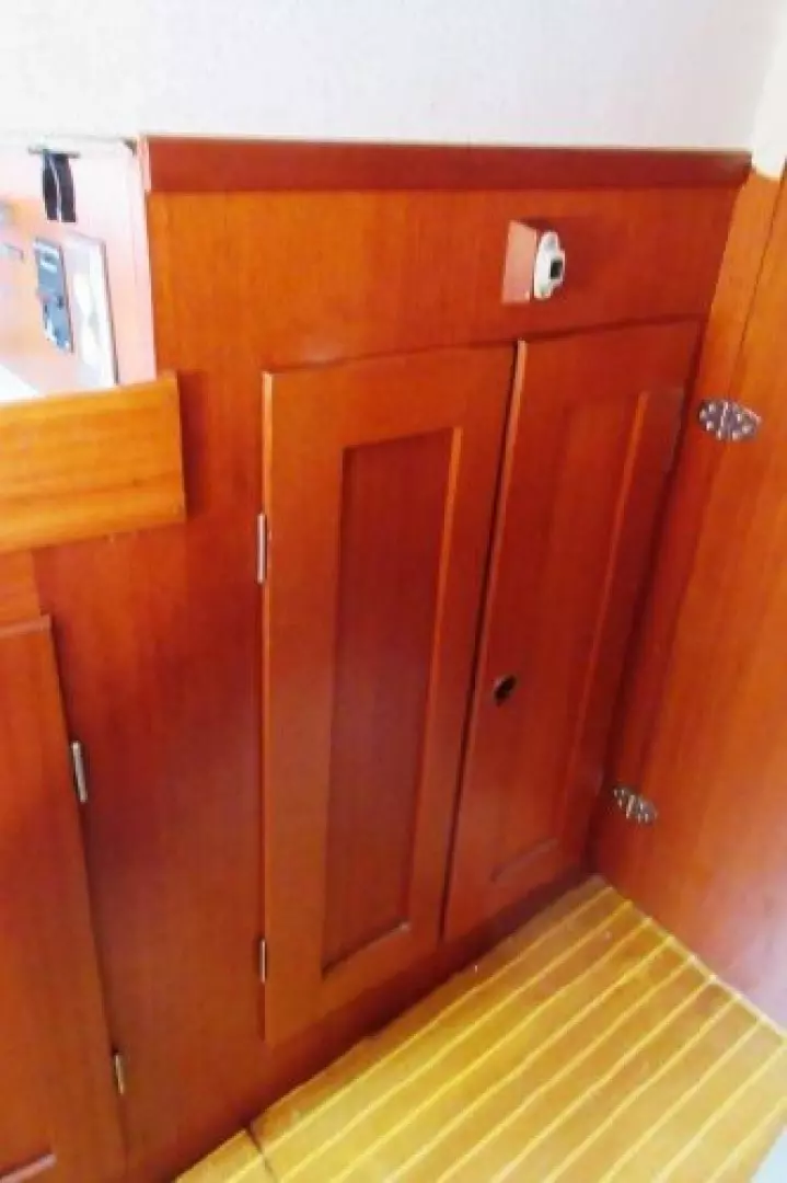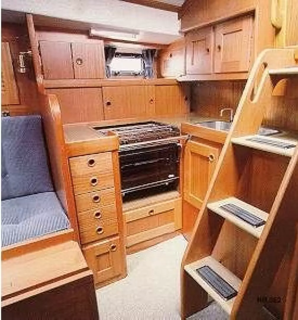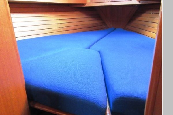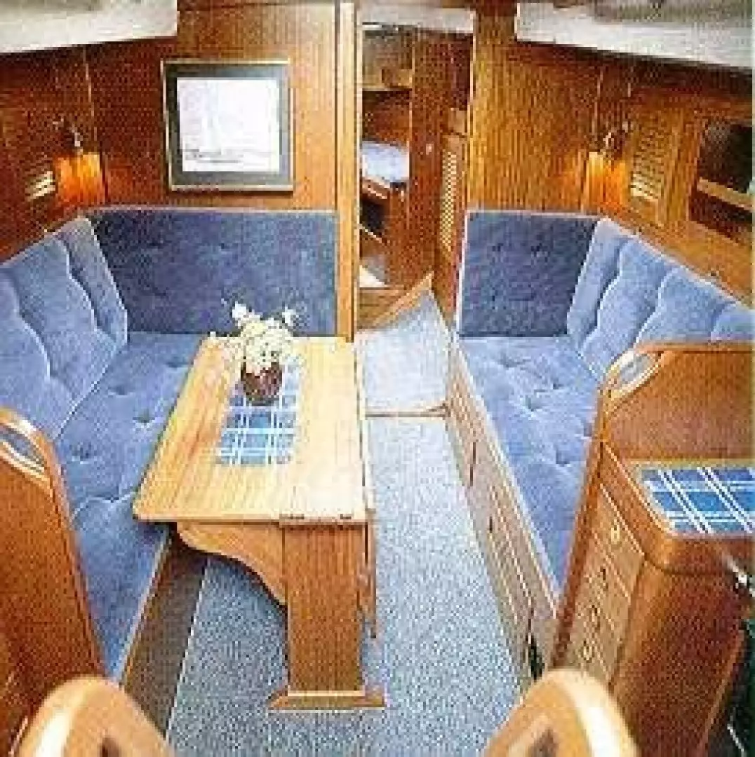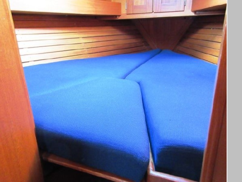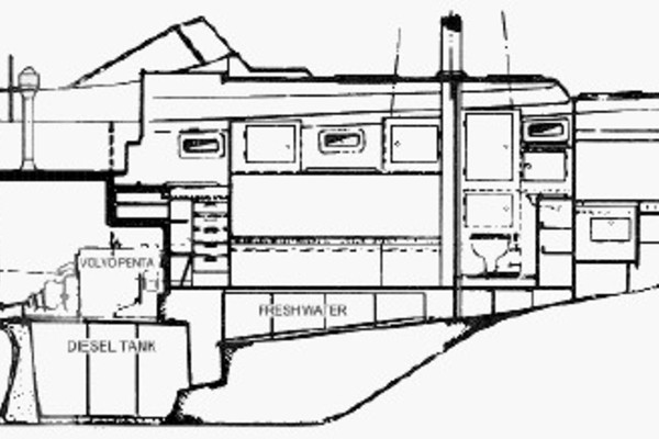 "Sleeps (7) in (3) cabins; V-berth forward with storage under & shelves outboard; Head next aft to port with marine toilet, porcelain wash basin, hot and cold pressure water, and shower with teak grate; (2) hanging lockers opposite to starboard; Salon has "L" shaped settee to port & straight settee to starboard; Shelves & lockers outboard of settees; Large centerline drop-leaf table with storage; "U" shaped Galley aft to starboard; Forward-facing Nav Station with chart locker & drawers opposite Galley to port; Passageway to Aft Cabin is to port and has a large top-loading icebox & lockers; Aft Cabin has a double berth to starboard, a single berth to port, drawers & shelves & an escape hatch to deck.