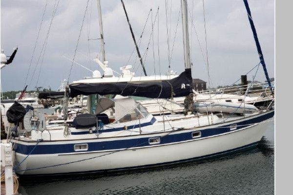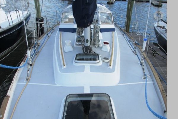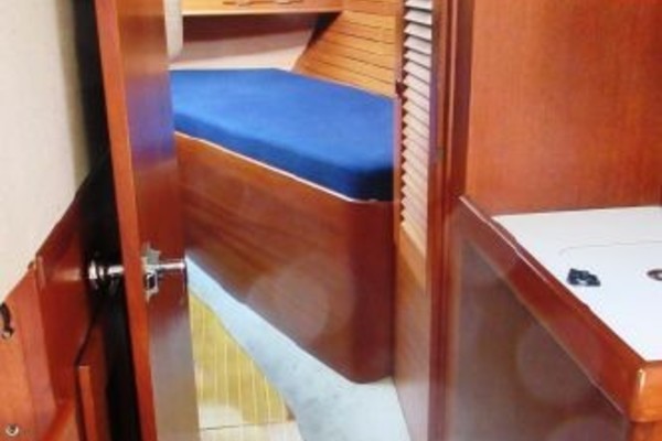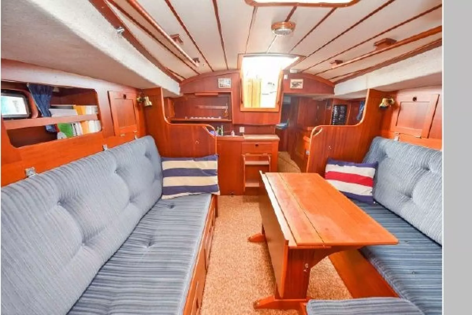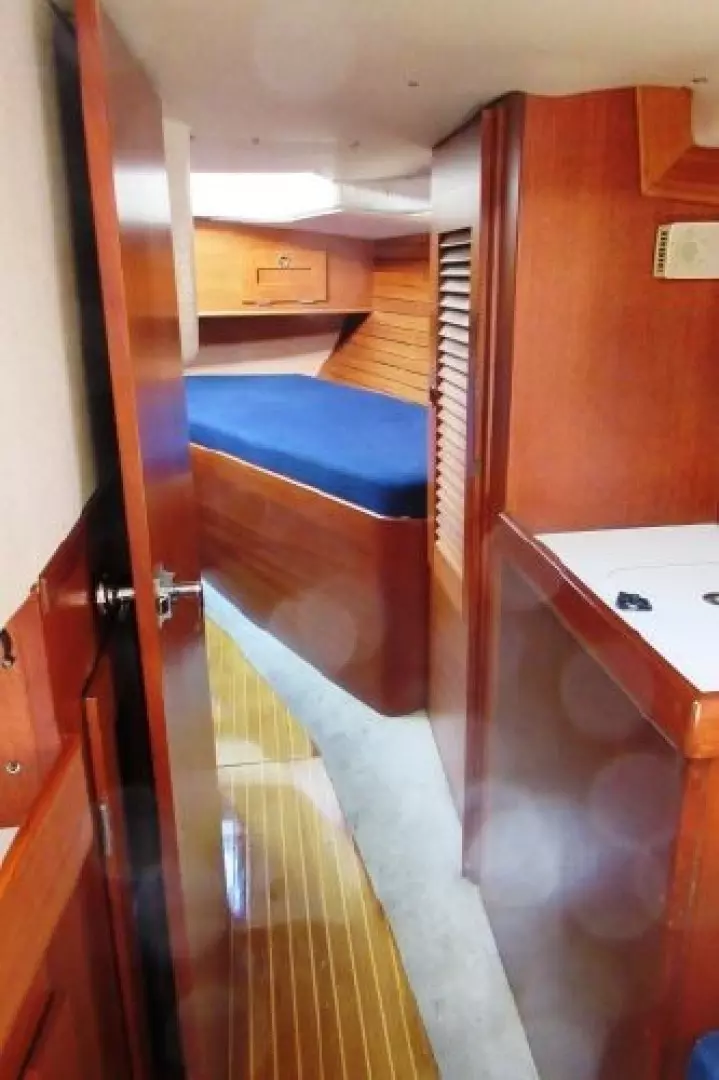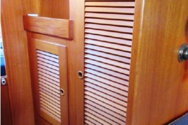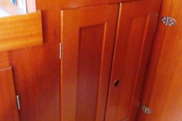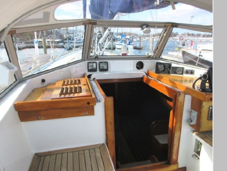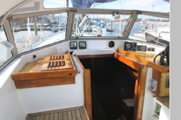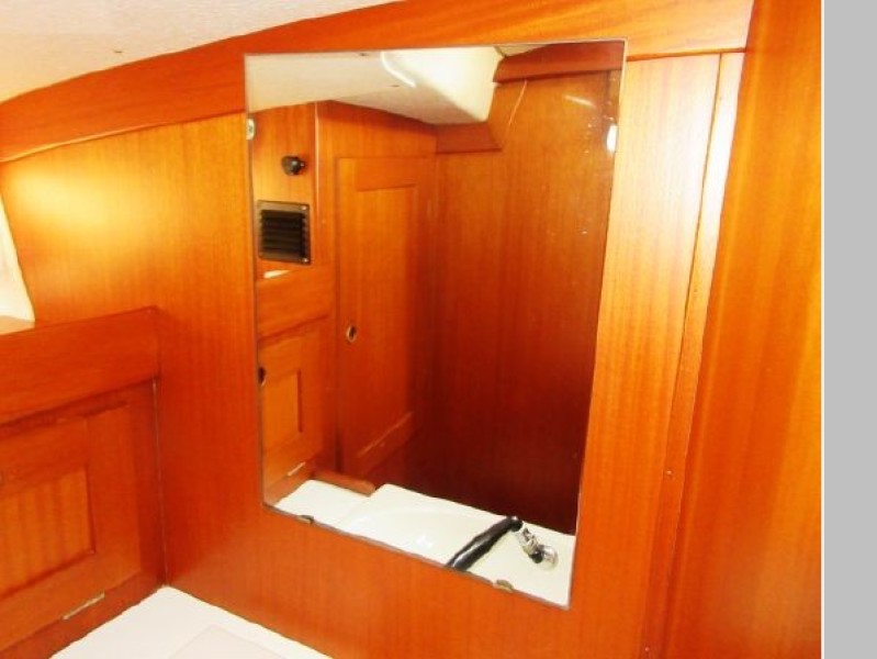 "Sleeps (7) in (3) cabins; V-berth forward with storage under & shelves outboard; Head next aft to port with marine toilet, porcelain wash basin, hot and cold pressure water, and shower with teak grate; (2) hanging lockers opposite to starboard; Salon has "L" shaped settee to port & straight settee to starboard; Shelves & lockers outboard of settees; Large centerline drop-leaf table with storage; "U" shaped Galley aft to starboard; Forward-facing Nav Station with chart locker & drawers opposite Galley to port; Passageway to Aft Cabin is to port and has a large top-loading icebox & lockers; Aft Cabin has a double berth to starboard, a single berth to port, drawers & shelves & an escape hatch to deck.