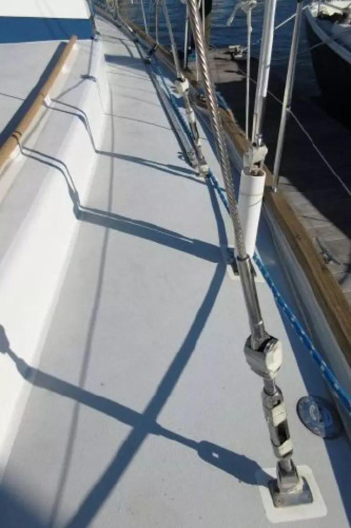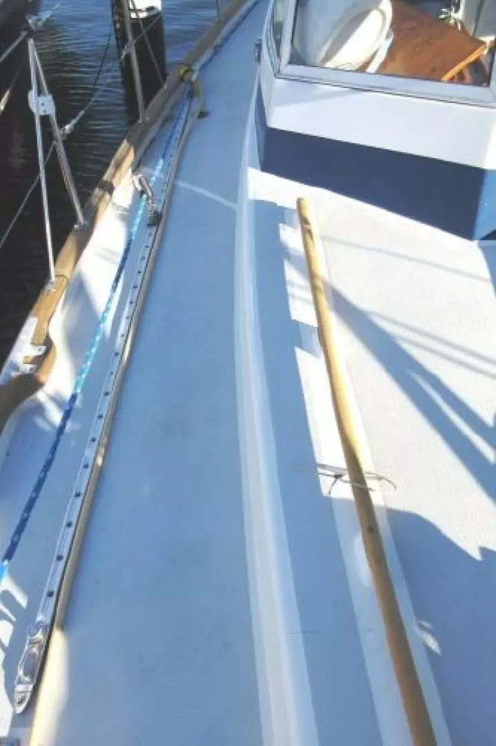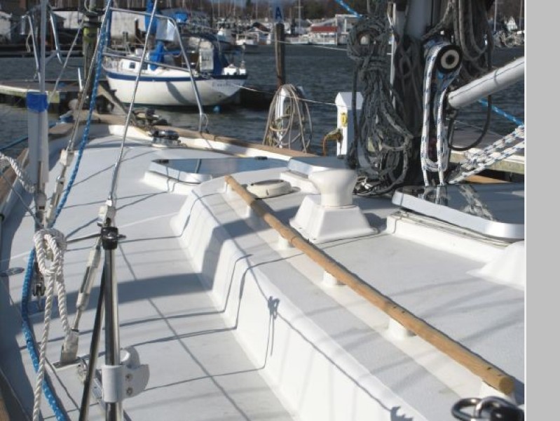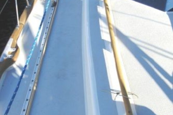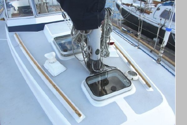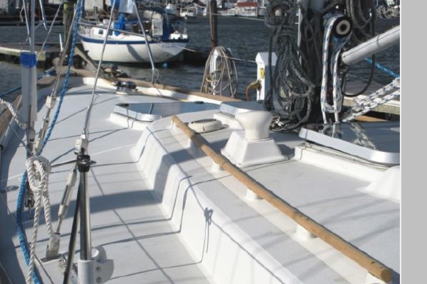 The WINDSONG II has had her teak overlay removed from the side decks. The non-skid surfaces are nicely-finished with a light gray AWLGRIP paint. The overall results are certainly outstanding and the liability is no longer extant for the eventual removal and refurbishment otherwise to face a potential Owner!