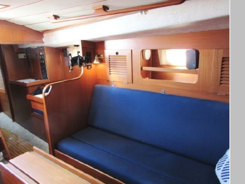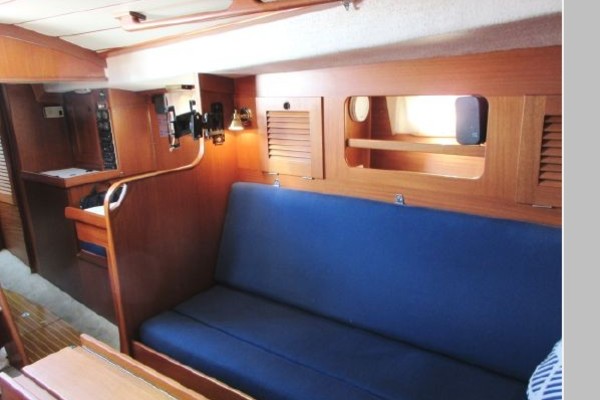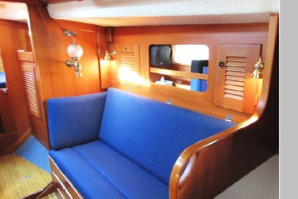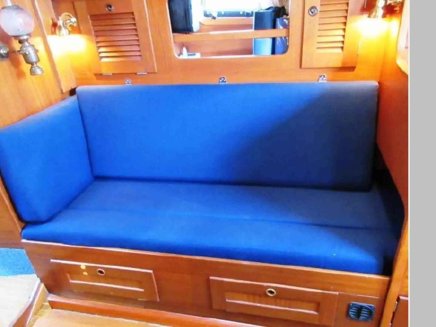 The interior is hand-rubbed varnished mahogany with a varnished teak and holly sole. 6'3"+ headroom; Dark Blue fabric upholstery; Beige fabric curtains for all ports; Bright & airy interior with (4) deck hatches, (8) opening ports & (3) Dorade vents."