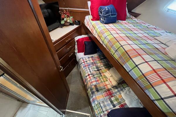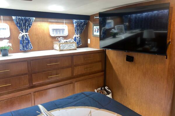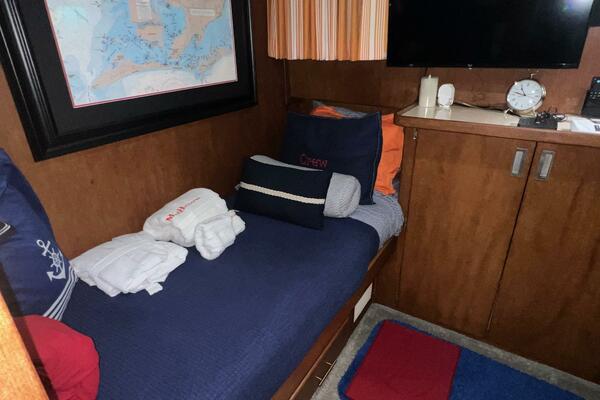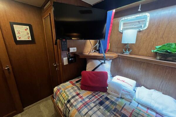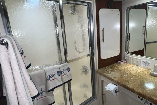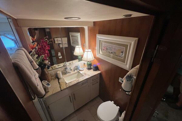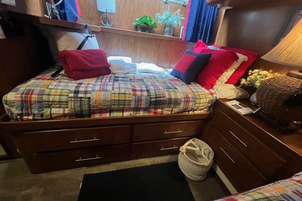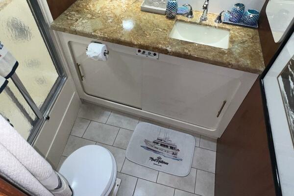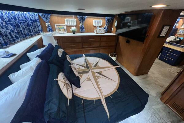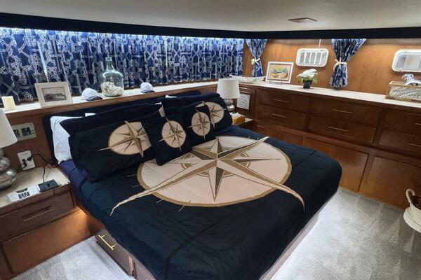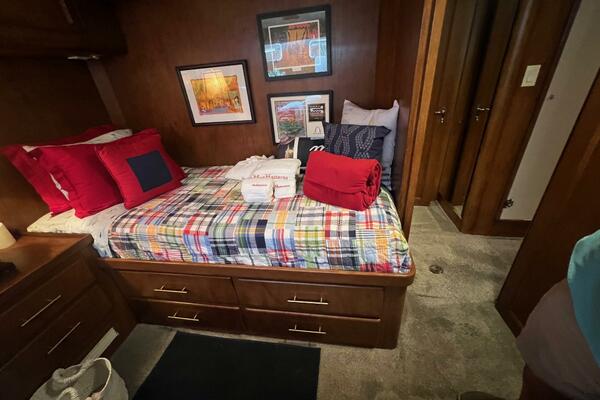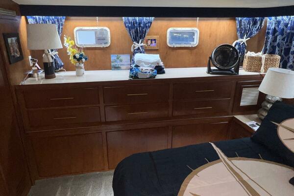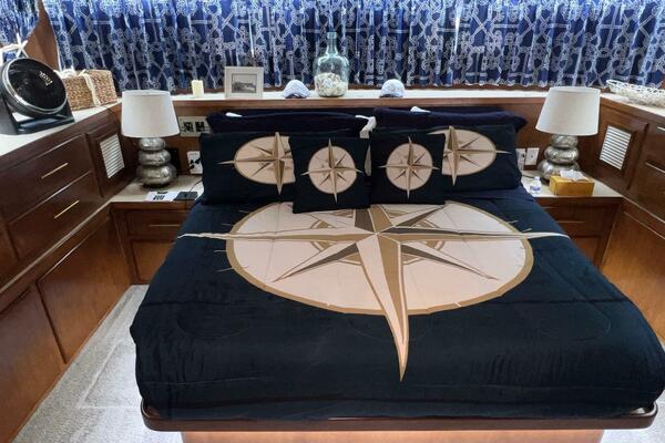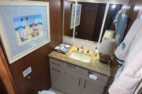 The master stateroom occupies the aft 1/3 of the lower deck. It is one of the largest you will find on any 65' yacht. It features a walk-around, king-sized bed with custom mattress, a large dressing room with sink and vanity, lots of hanging storage and drawer space and an enormous ensuite bathroom with a Jacuzzi tub. There are plenty of opening port holes with screens. This is a beautiful stateroom!