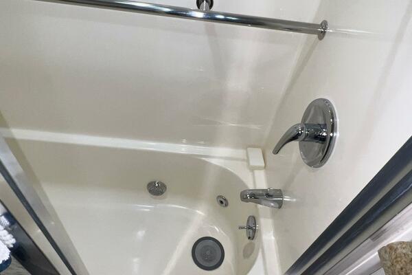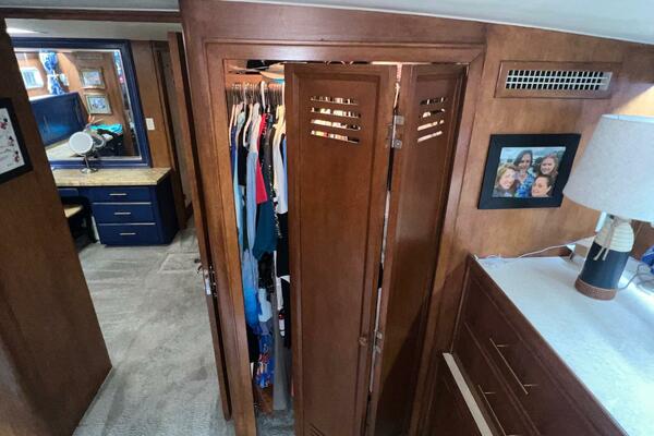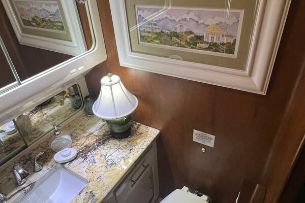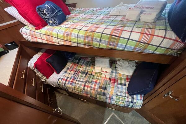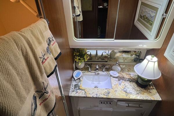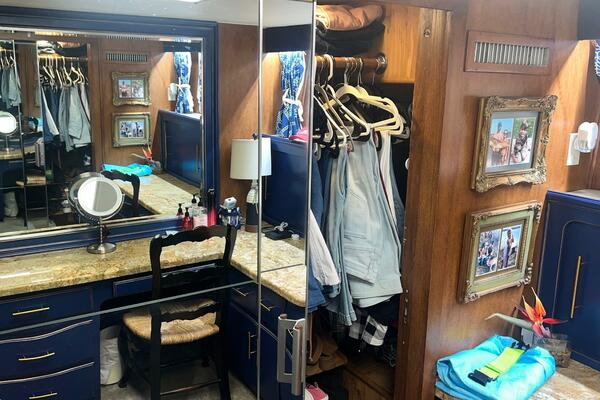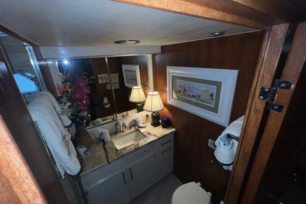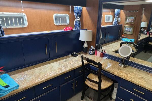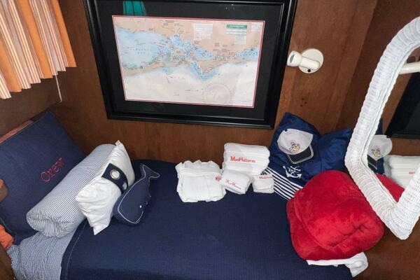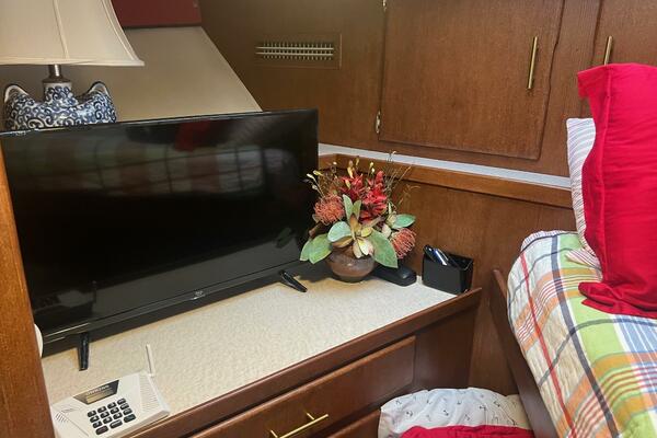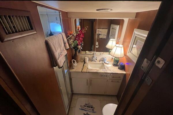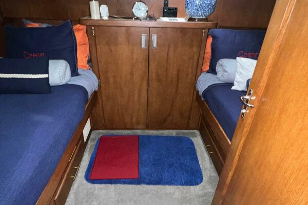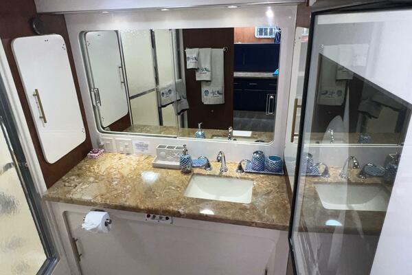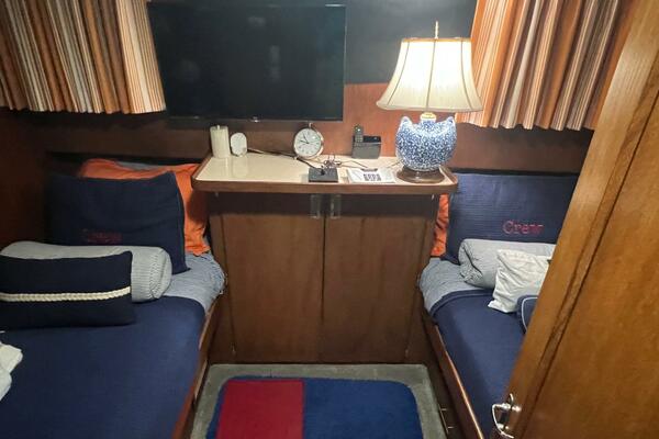 The master stateroom occupies the aft 1/3 of the lower deck. It is one of the largest you will find on any 65' yacht. It features a walk-around, king-sized bed with custom mattress, a large dressing room with sink and vanity, lots of hanging storage and drawer space and an enormous ensuite bathroom with a Jacuzzi tub. There are plenty of opening port holes with screens. This is a beautiful stateroom!
