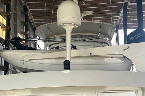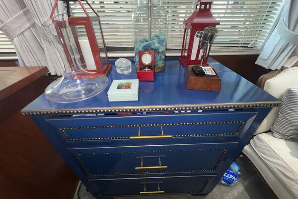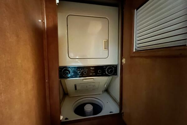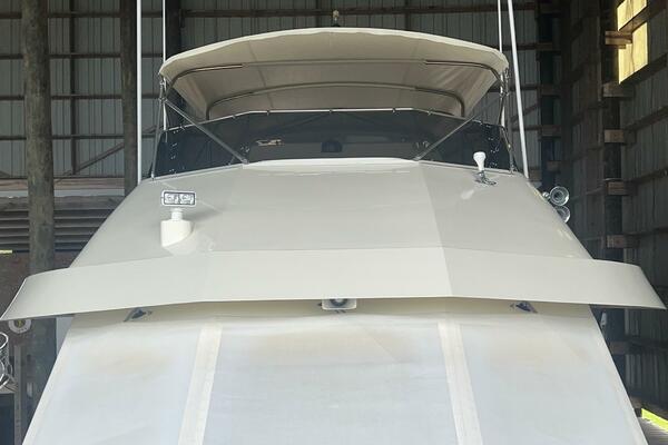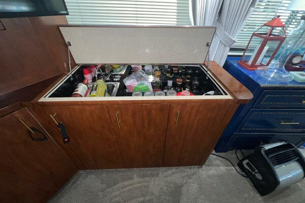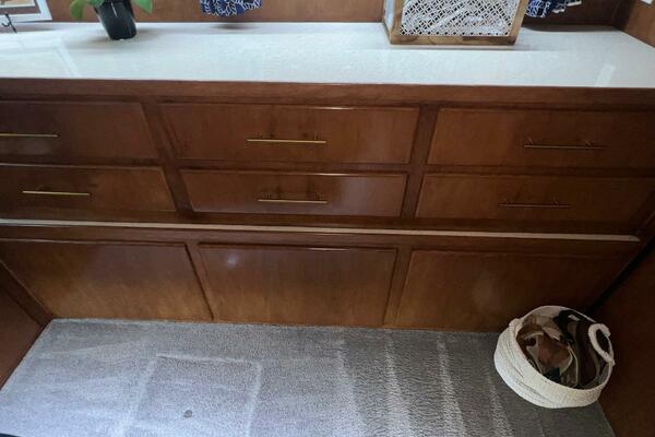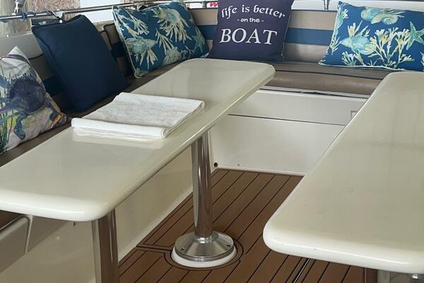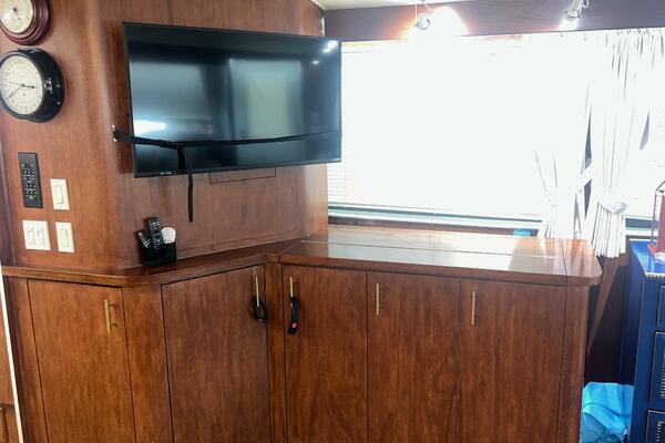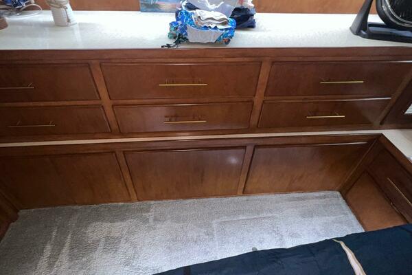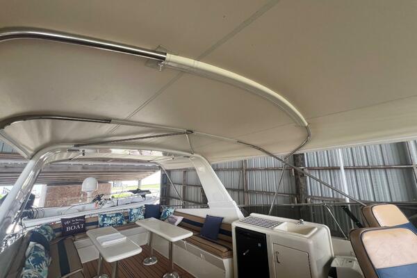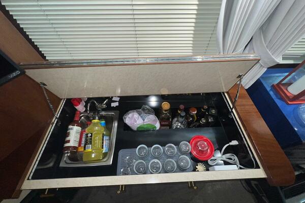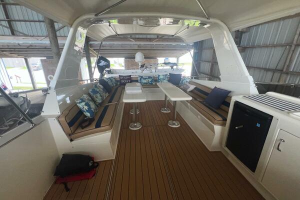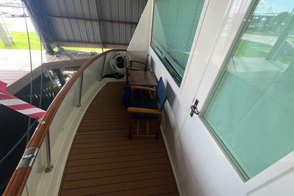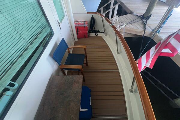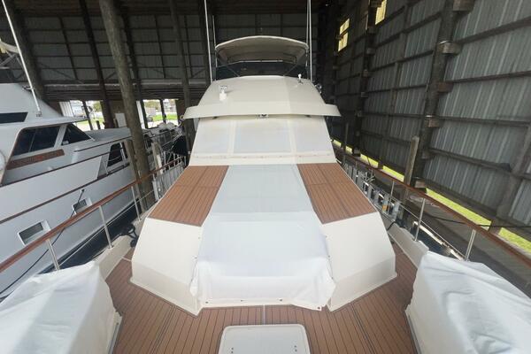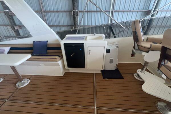 The flybridge is one of the best spaces on board to gather and has room for a crowd. The helm is forward with twin helm chairs and full controls. Aft to port is a wet bar with refrigerator below. Further aft are two long U-shaped seating with two long tables with ample storage below. The entire flybridge is covered by a very substantial bimini with new Stamoid cover.